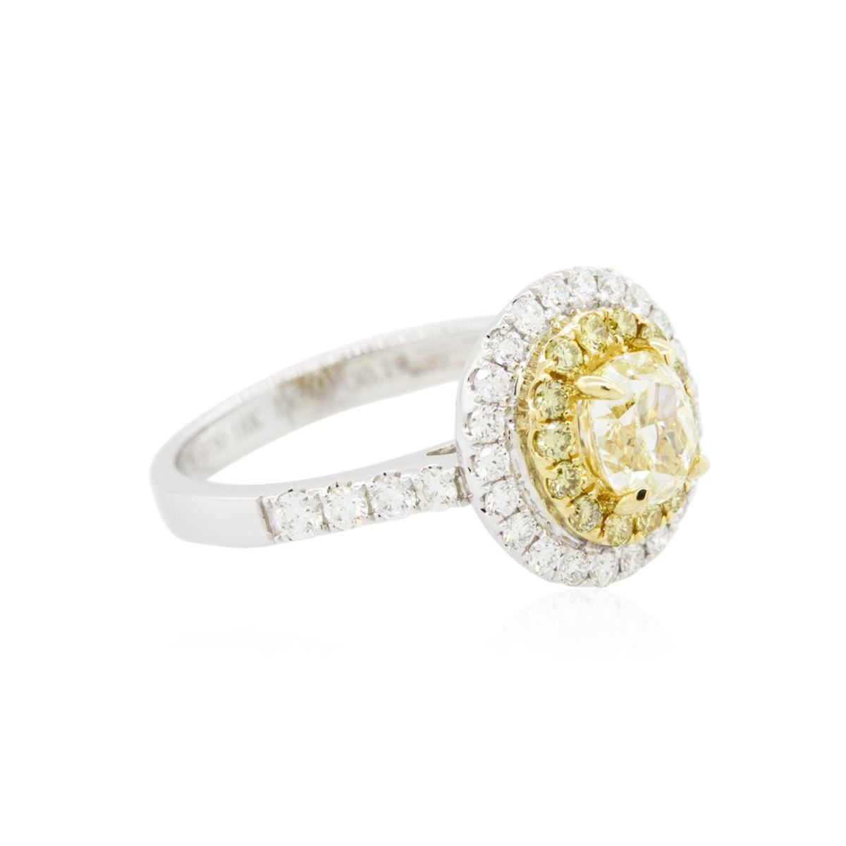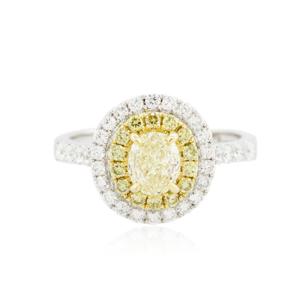 One electronically tested 18KT white and yellow gold Ladies combination cast & assembled engagement ring with a bright polish finish. Condition is new. Identified with markings of "18K". Containing: One prong set oval shaped cut diamond, measuring 5.80 x 4.70 x 3.70mm (depth est.) approximate weight of 0.63ct. Clarity: VS-2, Cut is Good. Fourteen prong set round brilliant cut diamonds, measuring 1.30 - 1.30 x 0.78mm (depth est.) approximate. Total Weight of 14 Stones = 0.19ct. Clarity: SI-1, Cut is Good. Twenty-Nine prong set round brilliant cut diamonds, measuring 2.00 - 1.50 x 1.05mm (depth est.) approximate. Total Weight of 29 Stones = 0.44ct. Clarity: SI-2 to I-1. Color: G - H, Cut is Very Good. Total Weight of Diamonds 1.26ct. Total Weight of Ring 3.90 grams. GGL Appraised at $11,255.00.