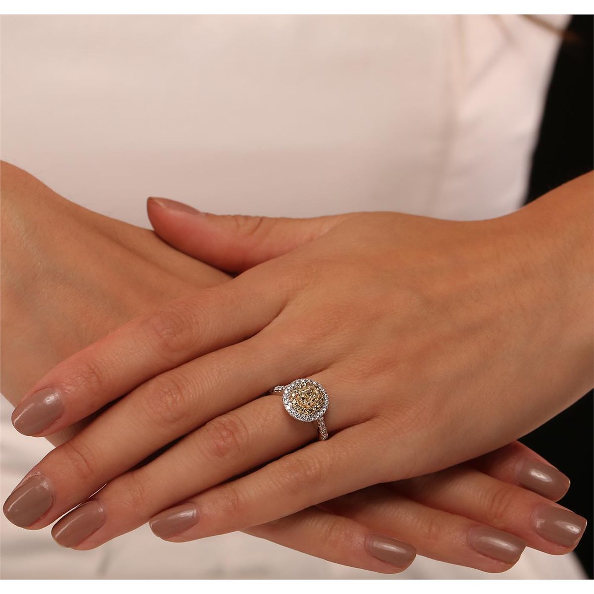 One electronically tested 18KT white and yellow gold Ladies combination cast & assembled engagement ring with a bright polish finish. Condition is new. Identified with markings of "18K". Containing: One prong set oval shaped cut diamond, measuring 5.80 x 4.70 x 3.70mm (depth est.) approximate weight of 0.63ct. Clarity: VS-2, Cut is Good. Fourteen prong set round brilliant cut diamonds, measuring 1.30 - 1.30 x 0.78mm (depth est.) approximate. Total Weight of 14 Stones = 0.19ct. Clarity: SI-1, Cut is Good. Twenty-Nine prong set round brilliant cut diamonds, measuring 2.00 - 1.50 x 1.05mm (depth est.) approximate. Total Weight of 29 Stones = 0.44ct. Clarity: SI-2 to I-1. Color: G - H, Cut is Very Good. Total Weight of Diamonds 1.26ct. Total Weight of Ring 3.90 grams. GGL Appraised at $11,255.00.