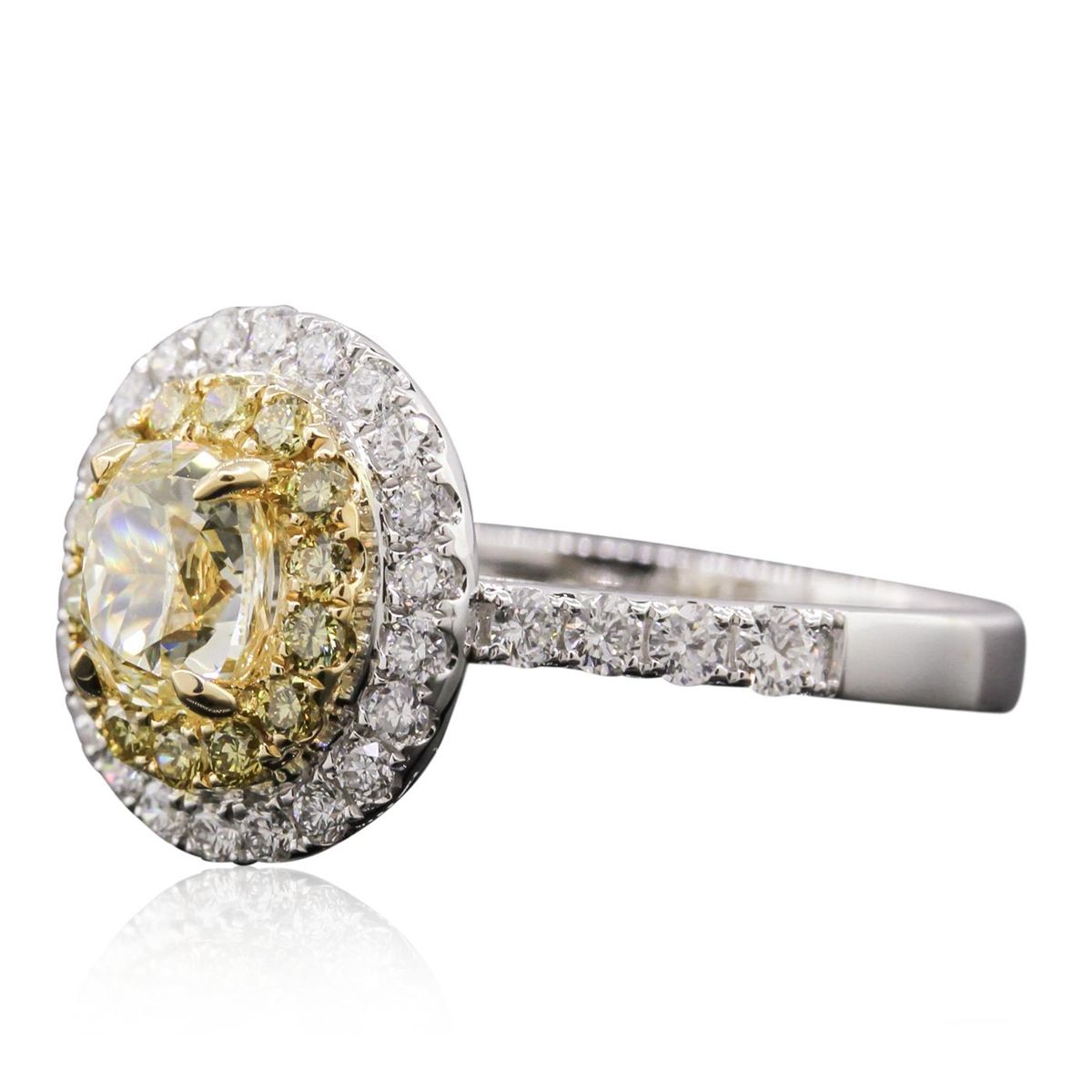One electronically tested 18KT white and yellow gold Ladies combination cast & assembled engagement ring with a bright polish finish. Condition is new. Identified with markings of "18K". Containing: One prong set oval shaped cut diamond, measuring 5.80 x 4.70 x 3.70mm (depth est.) approximate weight of 0.63ct. Clarity: VS-2, Cut is Good. Fourteen prong set round brilliant cut diamonds, measuring 1.30 - 1.30 x 0.78mm (depth est.) approximate. Total Weight of 14 Stones = 0.19ct. Clarity: SI-1, Cut is Good. Twenty-Nine prong set round brilliant cut diamonds, measuring 2.00 - 1.50 x 1.05mm (depth est.) approximate. Total Weight of 29 Stones = 0.44ct. Clarity: SI-2 to I-1. Color: G - H, Cut is Very Good. Total Weight of Diamonds 1.26ct. Total Weight of Ring 3.90 grams. GGL Appraised at $11,255.00.
