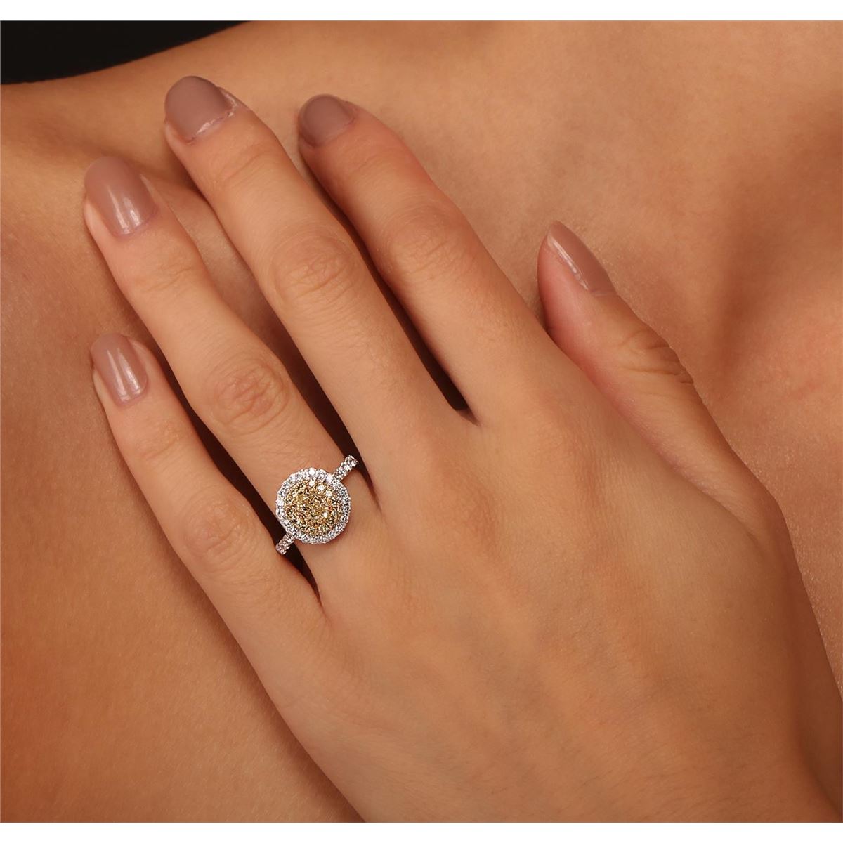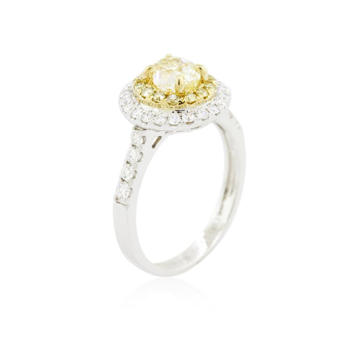 One electronically tested 18KT white and yellow gold Ladies combination cast & assembled engagement ring with a bright polish finish. Condition is new. Identified with markings of "18K". Containing: One prong set oval shaped cut diamond, measuring 5.80 x 4.70 x 3.70mm (depth est.) approximate weight of 0.63ct. Clarity: VS-2, Cut is Good. Fourteen prong set round brilliant cut diamonds, measuring 1.30 - 1.30 x 0.78mm (depth est.) approximate. Total Weight of 14 Stones = 0.19ct. Clarity: SI-1, Cut is Good. Twenty-Nine prong set round brilliant cut diamonds, measuring 2.00 - 1.50 x 1.05mm (depth est.) approximate. Total Weight of 29 Stones = 0.44ct. Clarity: SI-2 to I-1. Color: G - H, Cut is Very Good. Total Weight of Diamonds 1.26ct. Total Weight of Ring 3.90 grams. GGL Appraised at $11,255.00.