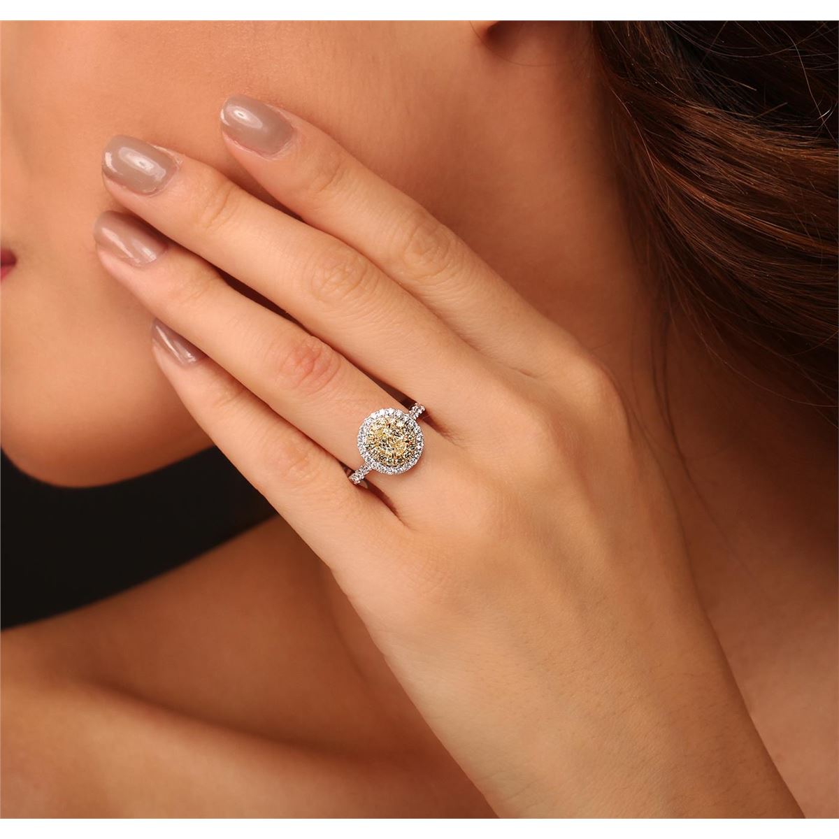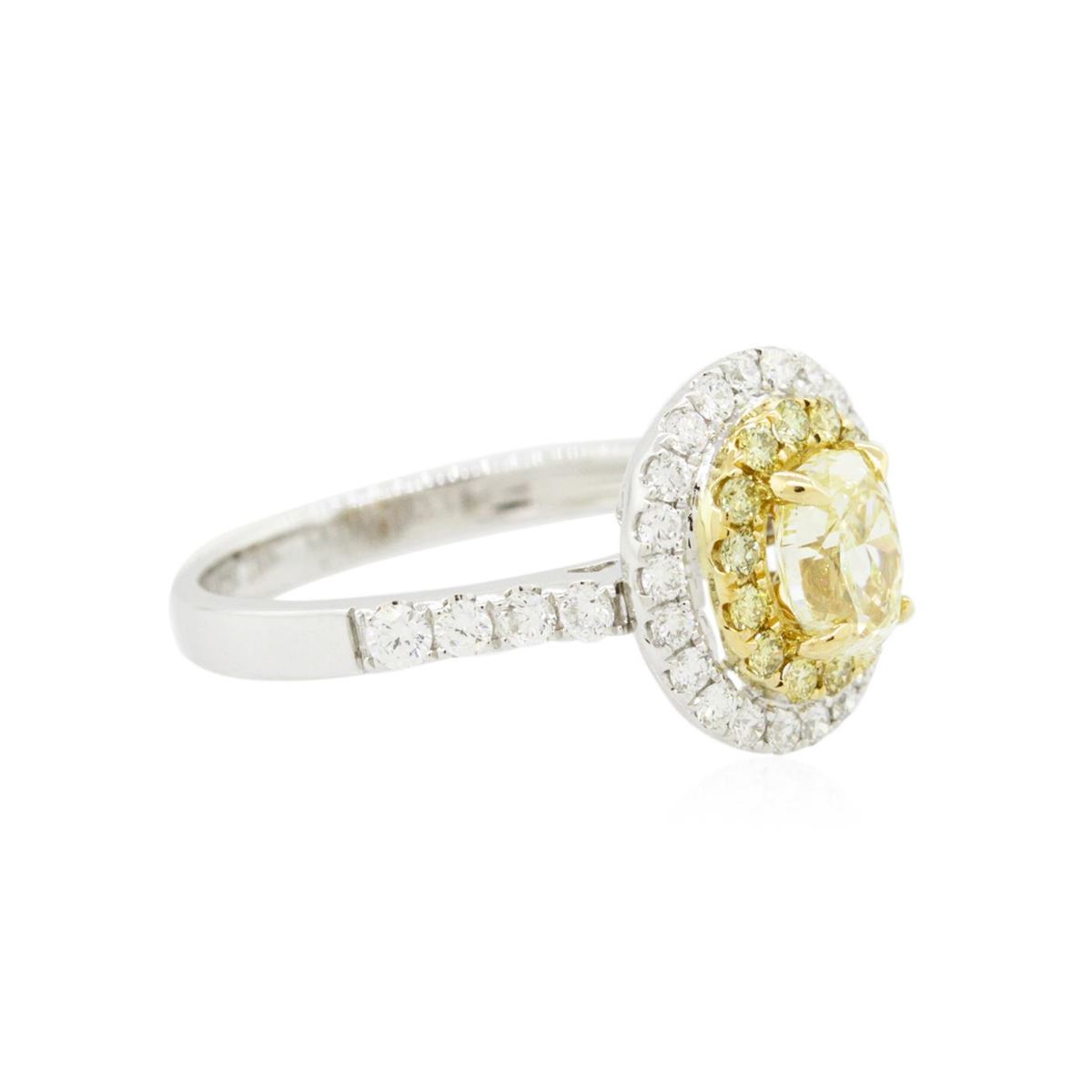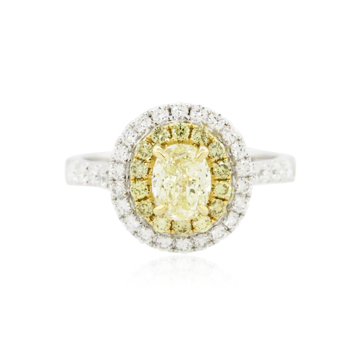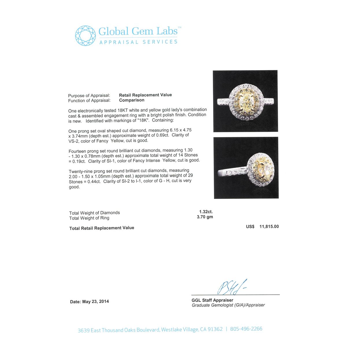 One electronically tested 18KT white and yellow gold Ladies combination cast & assembled engagement ring with a bright polish finish. Condition is new. Identified with markings of "18K". Containing: One prong set oval shaped cut diamond, measuring 6.15 x 4.75 x 3.74mm (depth est.) approximate weight of 0.69ct. Clarity: VS-2, Cut is Good. Fourteen prong set round brilliant cut diamonds, measuring 1.30 - 1.30 x 0.78mm (depth est.) approximate. Total Weight of 14 Stones = 0.19ct. Clarity: SI-1, Cut is Good. Twenty-Nine prong set round brilliant cut diamonds, measuring 2.00 - 1.50 x 1.05mm (depth est.) approximate. Total Weight of 29 Stones = 0.44ct. Clarity: SI-2 to I-1. Color: G - H, Cut is Very Good. Total Weight of Diamonds 1.32ct. Total Weight of Ring 3.70 grams. GGL Appraised at $11,815.00.