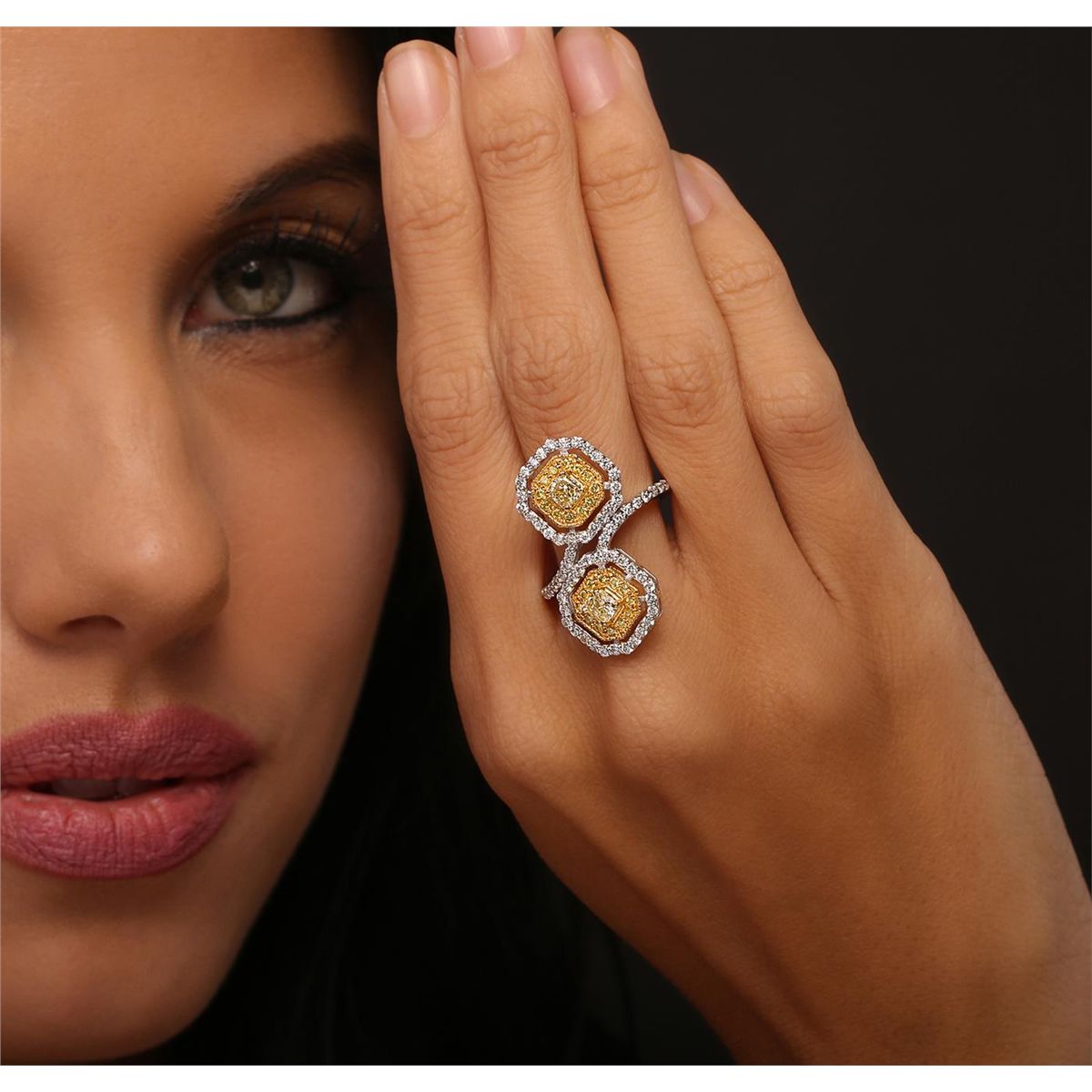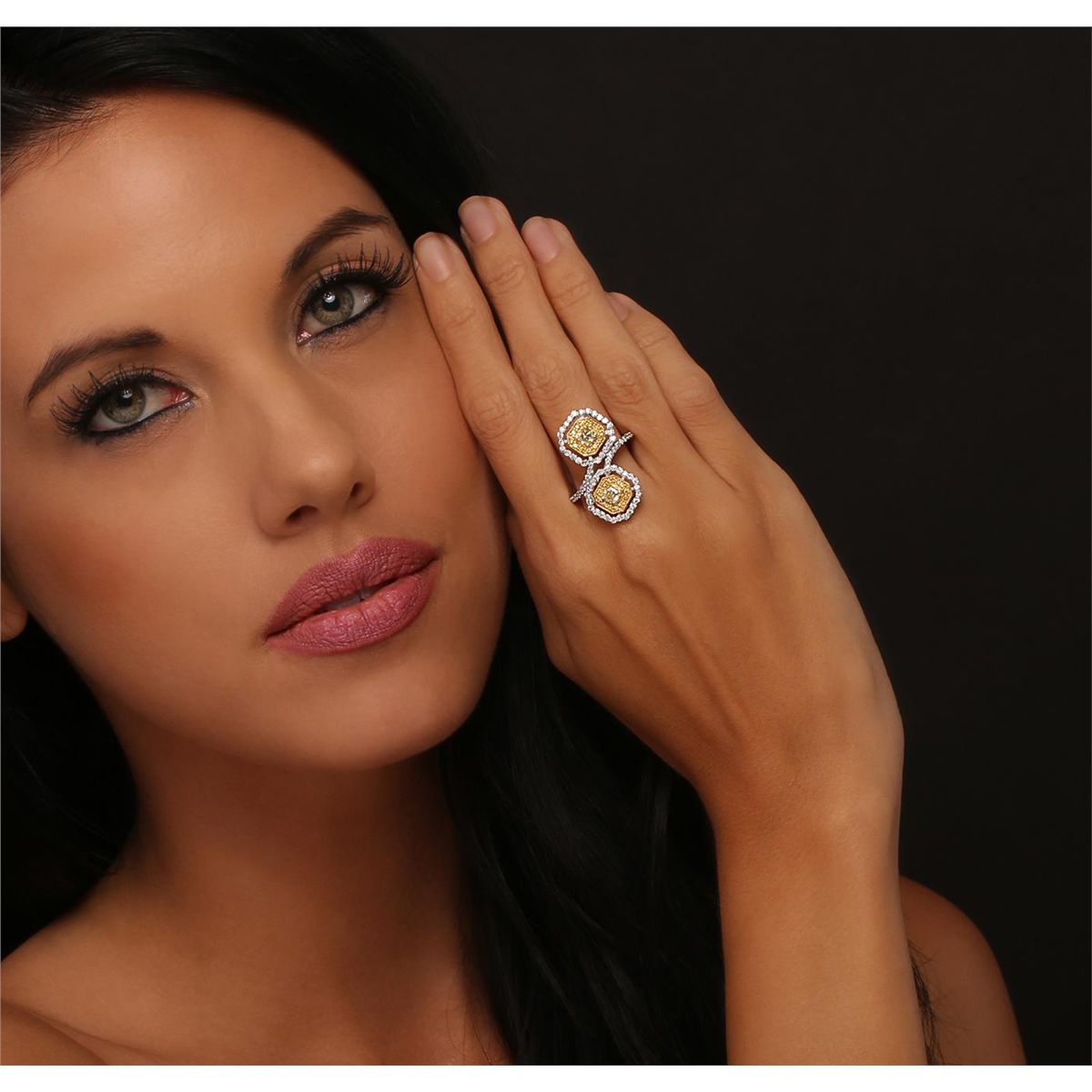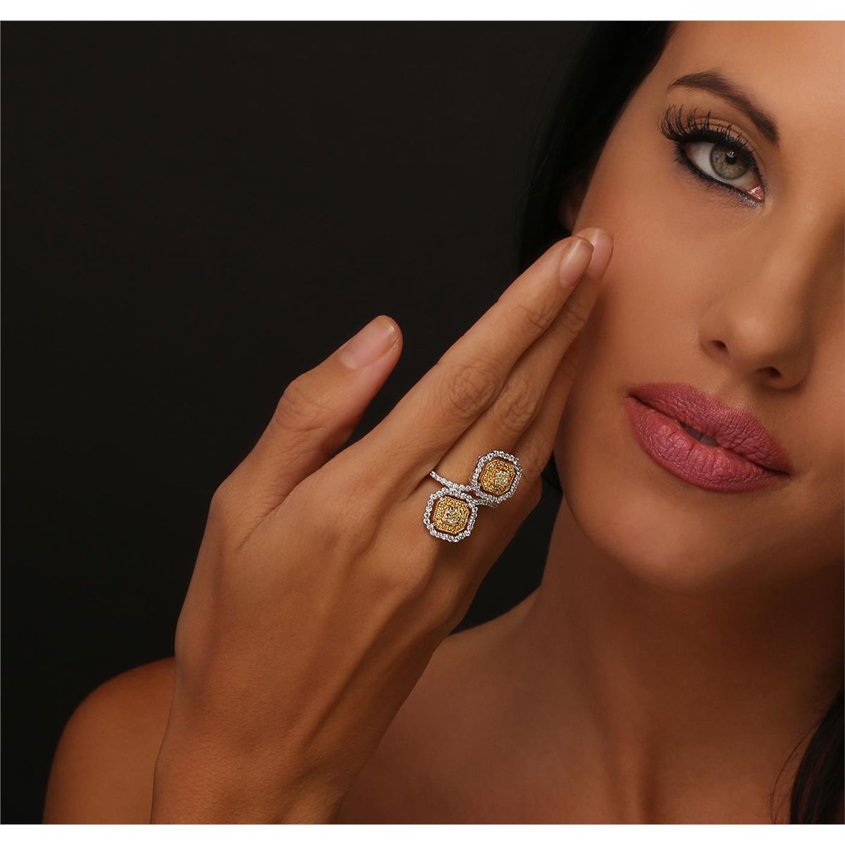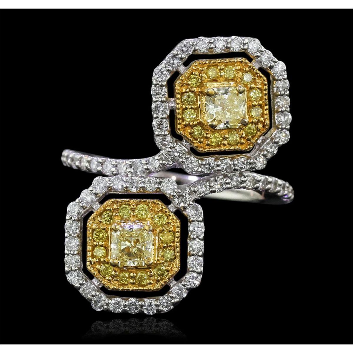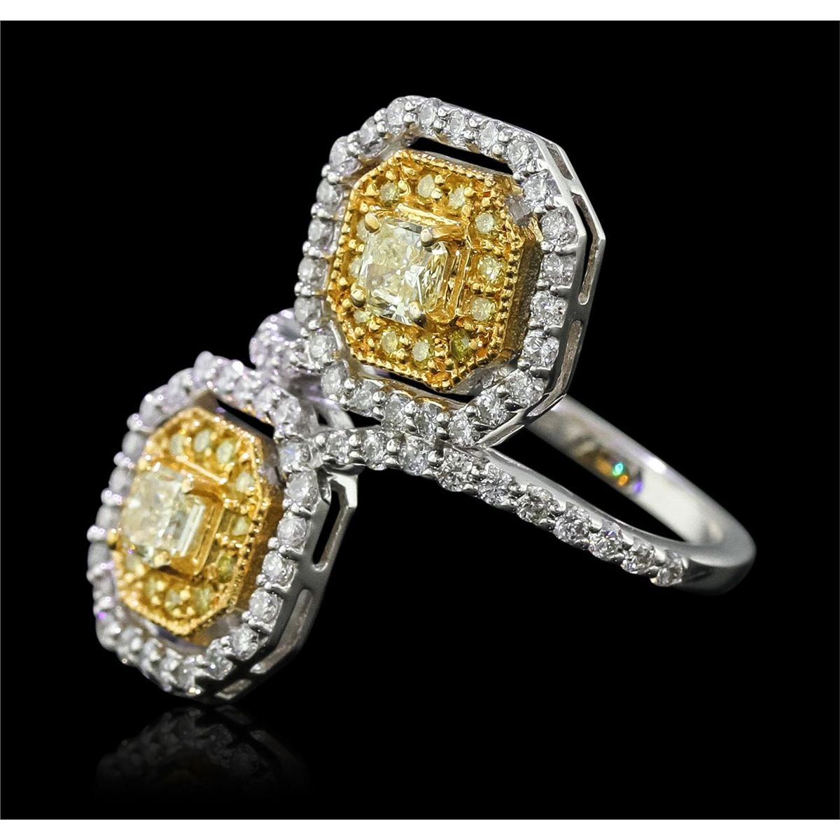 One electronically tested 18KT yellow and white gold Ladies combination cast & assembled ring with a bright polish finish. Condition is new. Identified with markings of "750". Containing: Two prong set radiant shaped cut diamonds, measuring 4.00 x 4.00 x 2.40mm (depth est.) approximate. Total Weight of 2 Stones = 0.63ct. Clarity: VS-2, Cut is Good. Twenty-Four prong set round brilliant cut diamonds, measuring 1.30 - 1.30 x 0.78mm (depth est.) approximate. Total Weight of 24 Stones = 0.19ct. Clarity: SI-2 to I-1, Cut is Good. Sixty-Eight prong set round brilliant cut diamonds, measuring 1.30 - 1.30 x 0.78mm (depth est.) approximate. Total Weight of 68 Stones = 0.54ct. Clarity: SI-2 to I-1. Color: G - H, Cut is Good. All grading of diamonds and colored gemstones are graded in the mounting, unless otherwise stated. Total Weight of Diamonds 1.37ct. Total Weight of Ring 8.40 grams. GGL Appraised at $9,345.00.