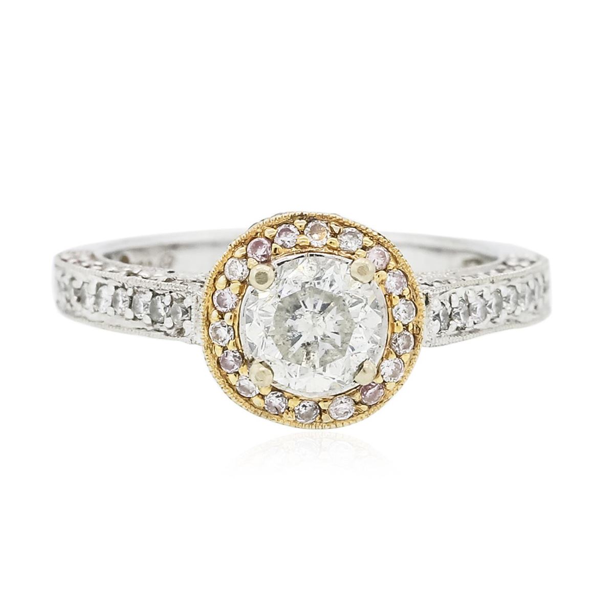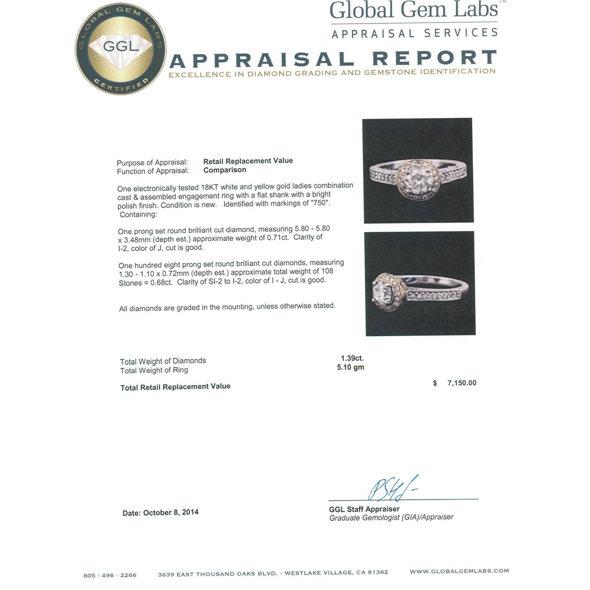 One electronically tested 18KT white and yellow gold ladies combination cast & assembled engagement ring with a flat shank with a bright polish finish. Identified with markings of "750". Condition is new. Containing: One prong set round brilliant cut diamond, measuring 5.80 - 5.80 x 3.48mm (depth est.) approximate weight of 0.71ct. Clarity: I-2. Color: J, Cut is Good. One Hundred Eight prong set round brilliant cut diamonds, measuring 1.30 - 1.10 x 0.72mm (depth est.) approximate total weight of 108 Stones = 0.68ct. Clarity: SI-2 to I-2. Color: I - J, Cut is Good. All diamonds are graded in the mounting, unless otherwise stated. Total Weight of Diamonds 1.39ct. Total Weight of Ring 5.10 grams. GGL Appraised at $7,150.00.