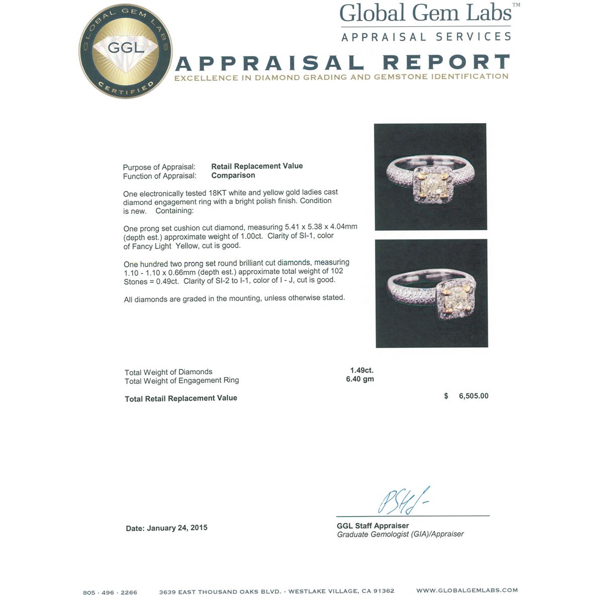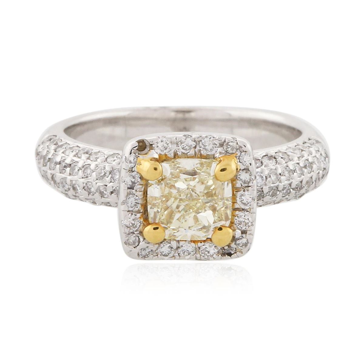 One electronically tested 18KT white and yellow gold ladies cast diamond engagement ring with a bright polish finish. Condition is new. Containing: One prong set cushion cut diamond, measuring 5.41 x 5.38 x 4.04mm (depth est.) approximate weight of 1.00.ct. Clarity: SI-1, Cut is Good. One Hundred Two prong set round brilliant cut diamonds, measuring 1.10 - 1.10 x 0.66mm (depth est.) approximate total weight of 102 Stones = 0.49ct. Clarity: SI-2 to I-1. Color: I - J, Cut is Good. All diamonds are graded in the mounting, unless otherwise stated. Total Weight of Diamonds 1.49ct. Total Weight of Engagement Ring 6.40 grams. GGL Appraised at $6,505.00.