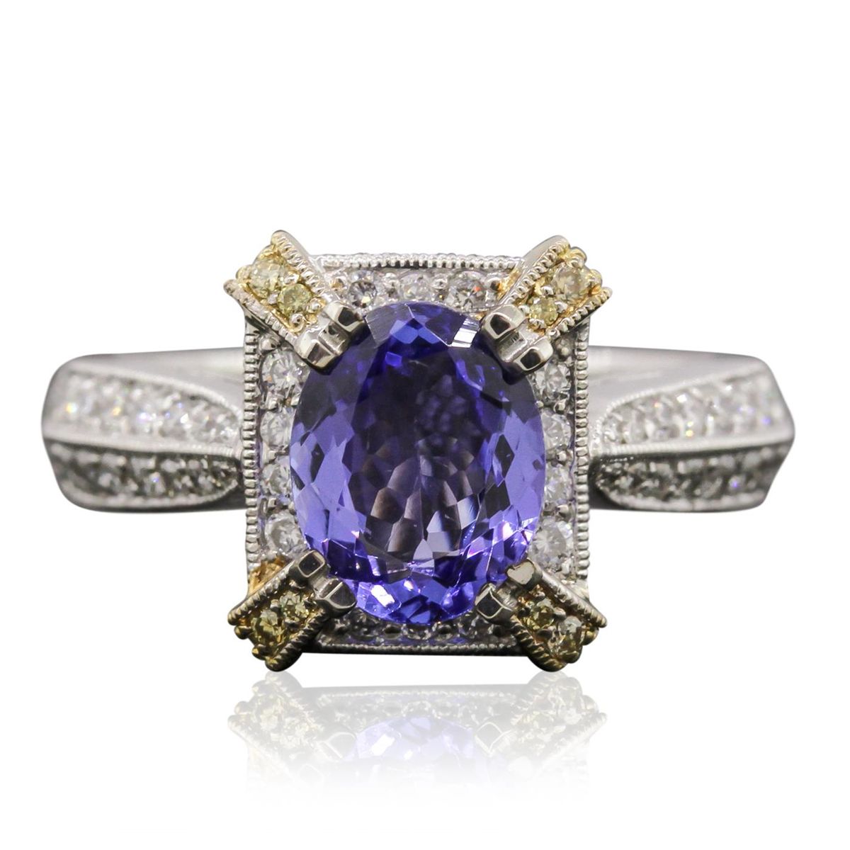 One ring featuring: 18KT two-tone gold with a total weight of 9.00 grams, tanzanite with a total weight of 1.69ct, and diamonds with a total weight of 0.74ctw.