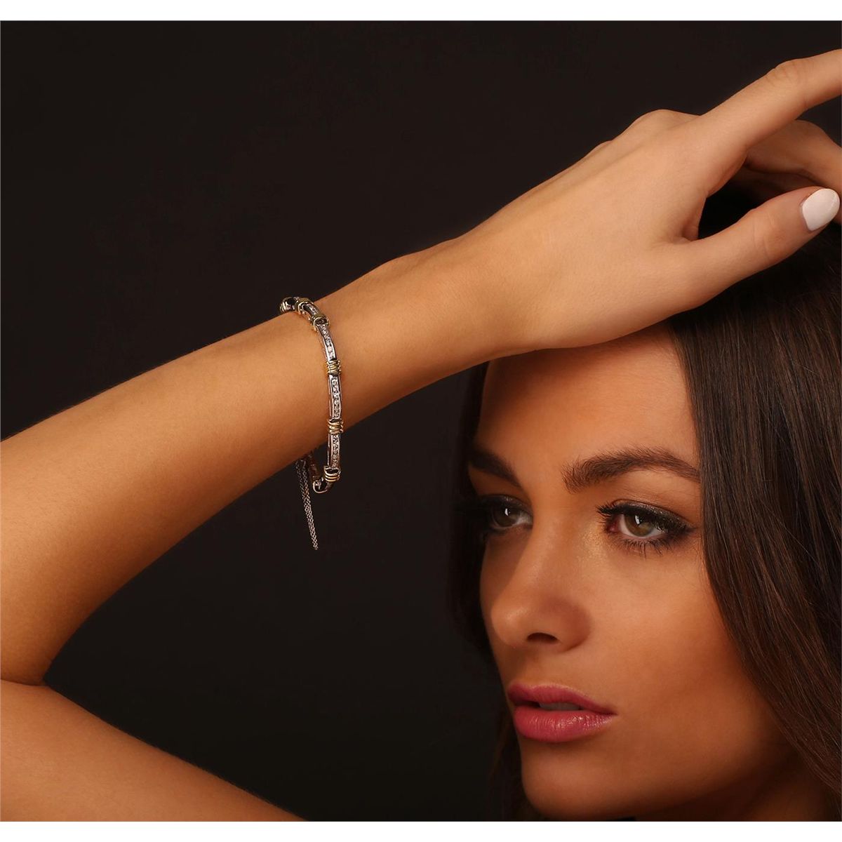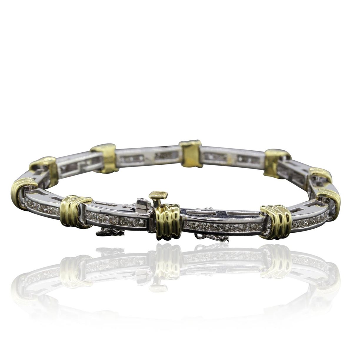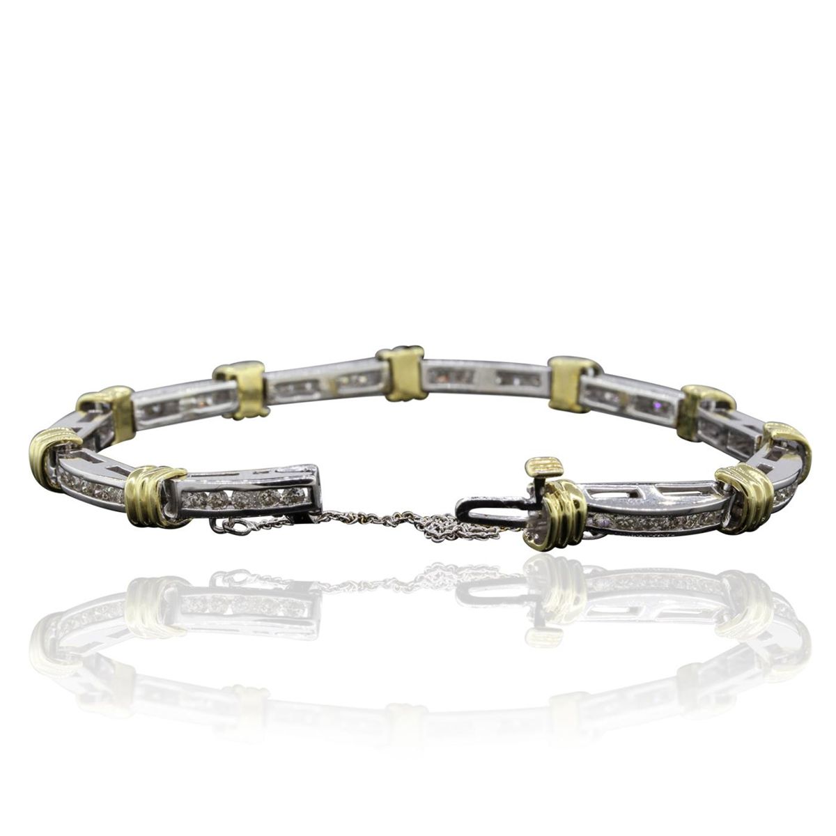 One electronically tested 18KT white and yellow gold Ladies combination cast & die struck tennis bracelet with a hidden box clasp with a bright polish finish. Measurements: 7.00" in length. Condition is new. Containing: Fifty-Nine channel set round brilliant cut diamonds, measuring 2.00 - 2.00 x 1.20mm (depth est.) approximate total weight of 59 Stones = 1.85ct. Clarity of SI-2 to I-1, Color of H - I, Cut is Very Good. Total Weight of Diamonds 1.85ct. Total Weight of Bracelet 20.40gm. GGL Appraised at $13,865.00.