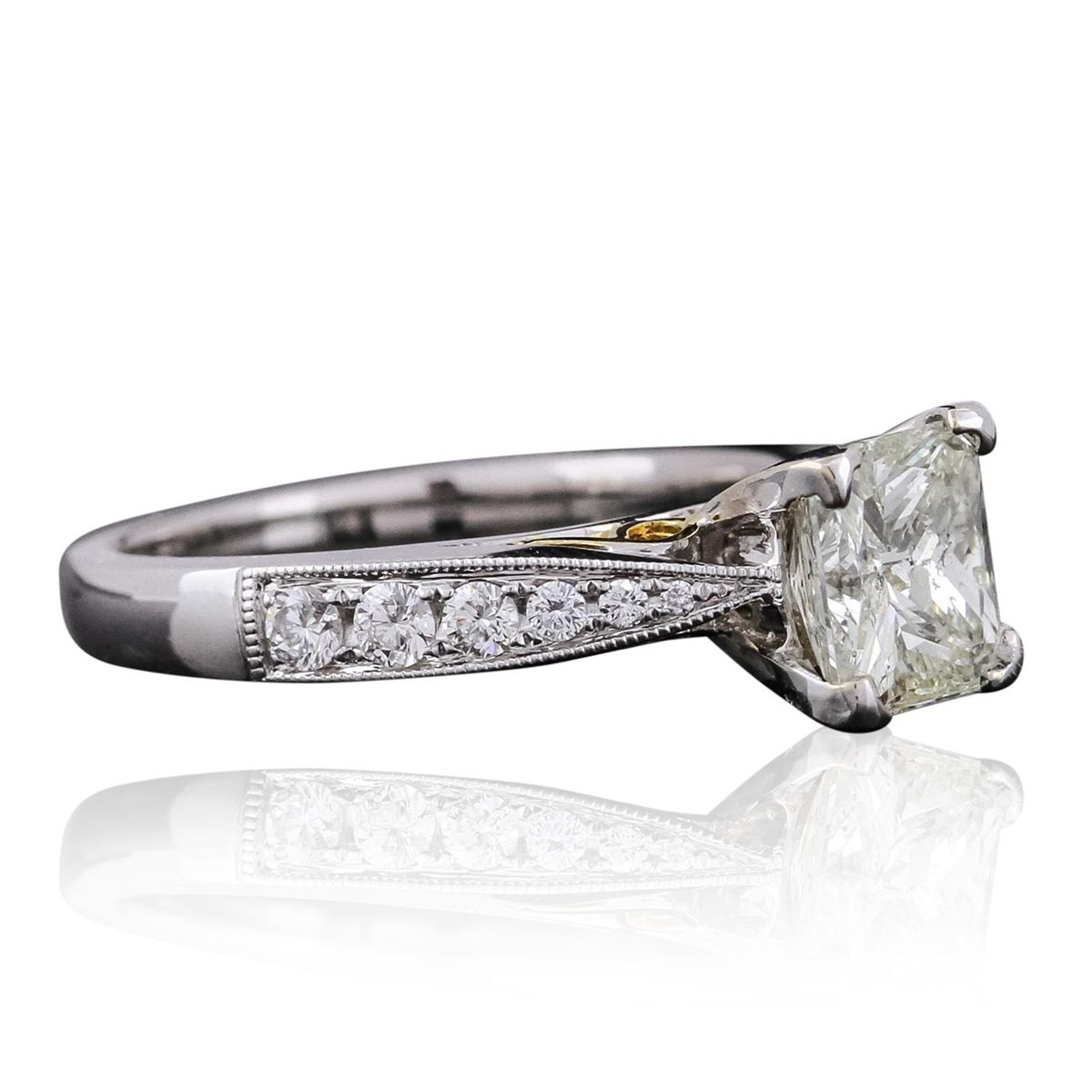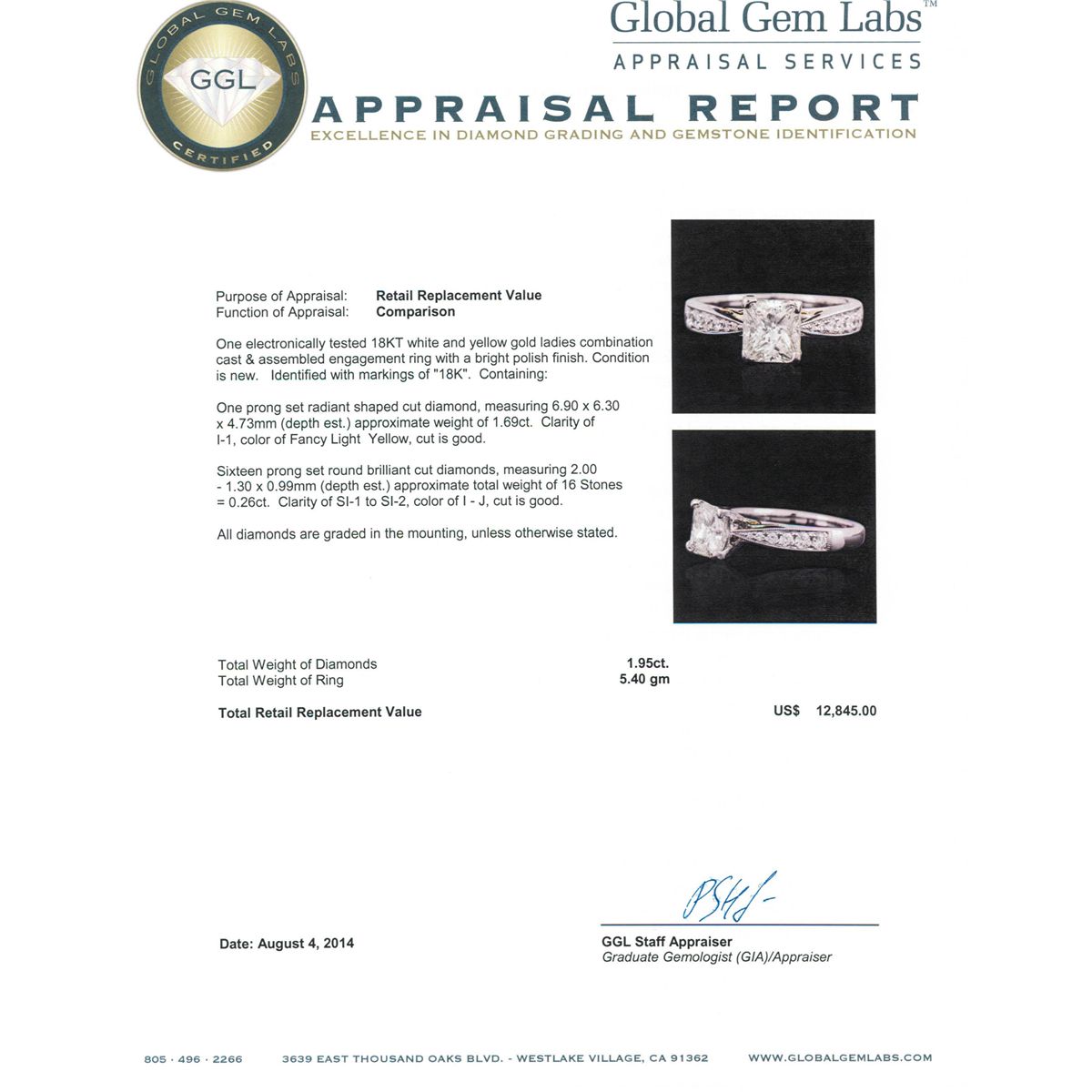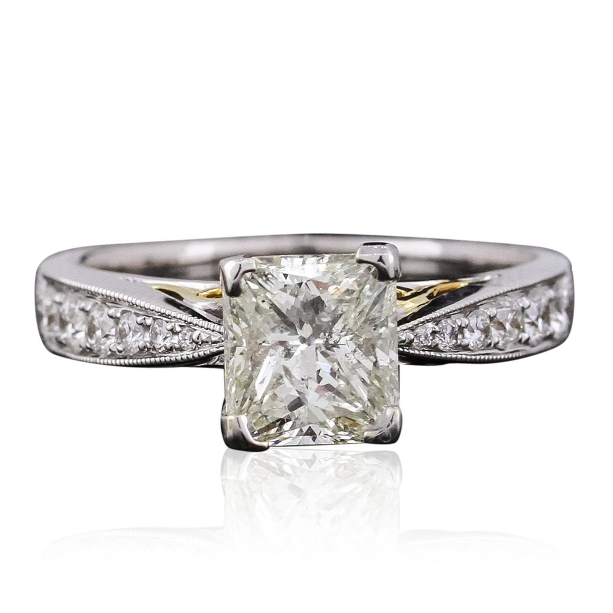 One electronically tested 18KT white and yellow gold ladies combination cast & assembled engagement ring with a bright polish finish. Condition is new. Identified with markings of "18K". Containing: One prong set radiant shaped cut diamond, measuring 6.90 x 6.30 x 4.73mm (depth est.) approximate weight of 1.69ct. Clarity: I-1, Cut is Good. Sixteen prong set round brilliant cut diamonds, measuring 2.00 - 1.30 x 0.99mm (depth est.) approximate. Total Weight of 16 Stones = 0.26ct. Clarity: SI-1 to SI-2. Color: I - J, Cut is Good. All diamonds are graded in the mounting, unless otherwise stated. Total Weight of Diamonds 1.95ct. Total Weight of Ring 5.40 grams. GGL Appraised at $12,845.00.