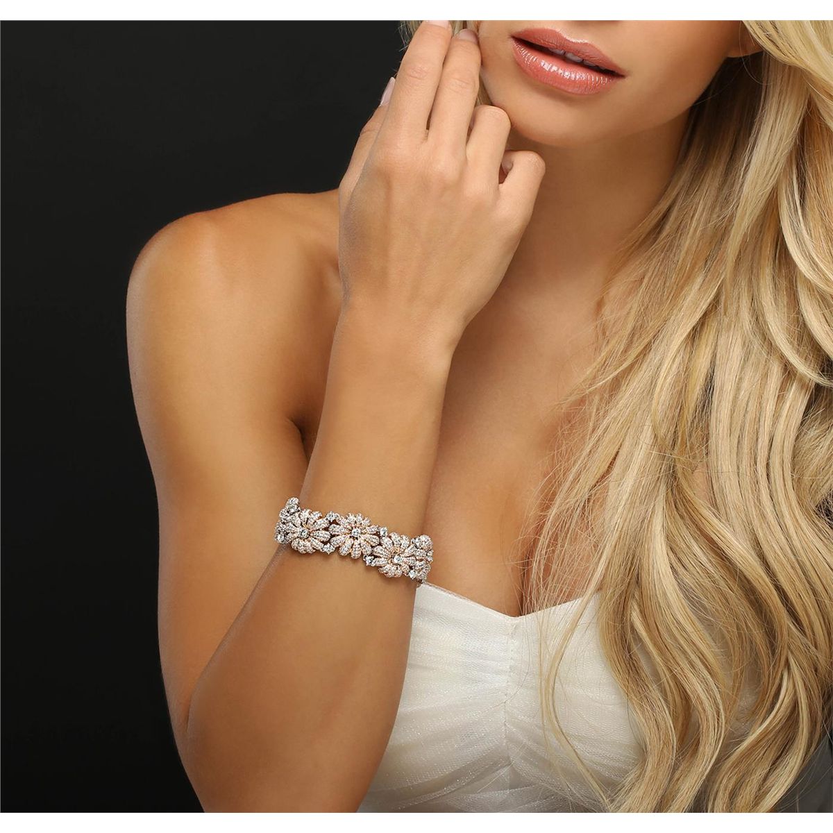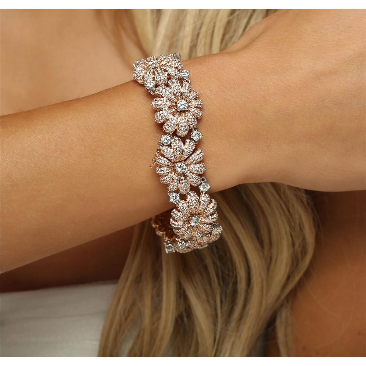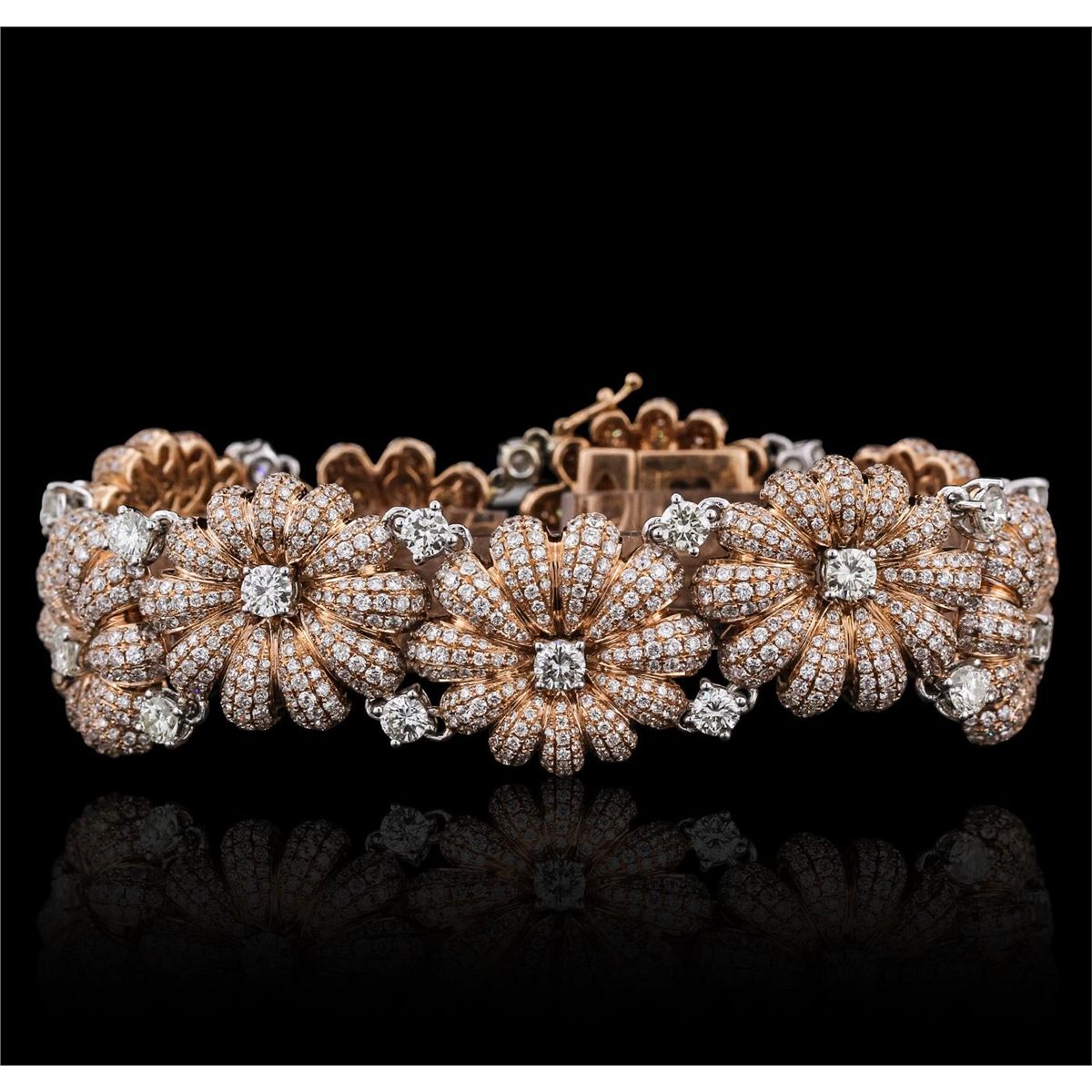 One electronically tested 18KT rose and White Gold ladies cast & assembled diamond bracelet. Seven and one-half inch bracelet composed of a flexible ribbon of diamond set flowers interspersed by round brilliant diamonds, terminating in a hidden clasp with safety. Bright polish finish. Trademark is AKMS. Identified with markings of "18K". Condition is new, good workmanship. Containing: Twenty-Seven prong set round brilliant cut diamonds, measuring 3.80 - 3.60 x 2.22mm (depth est.) approximate total weight of 27 Stones = 5.10ct. The color grade reflects the entire range of color for this group. Graded in the setting. Clarity: VS-1 to SI-1. Color: H - K. One Thousand, Eight Hundred pave set round brilliant cut diamonds, measuring 1.50 - 1.10 x 0.78mm (depth est.) approximate total weight of 1800 Stones = 14.15ct. Graded in the setting. Clarity: VVS-2 to VS-2. Color: G - I. Total Weight of Diamonds 19.25ct. Total Weight of Bracelet 56.84 grams. AIG Appraised at $94,105.00.