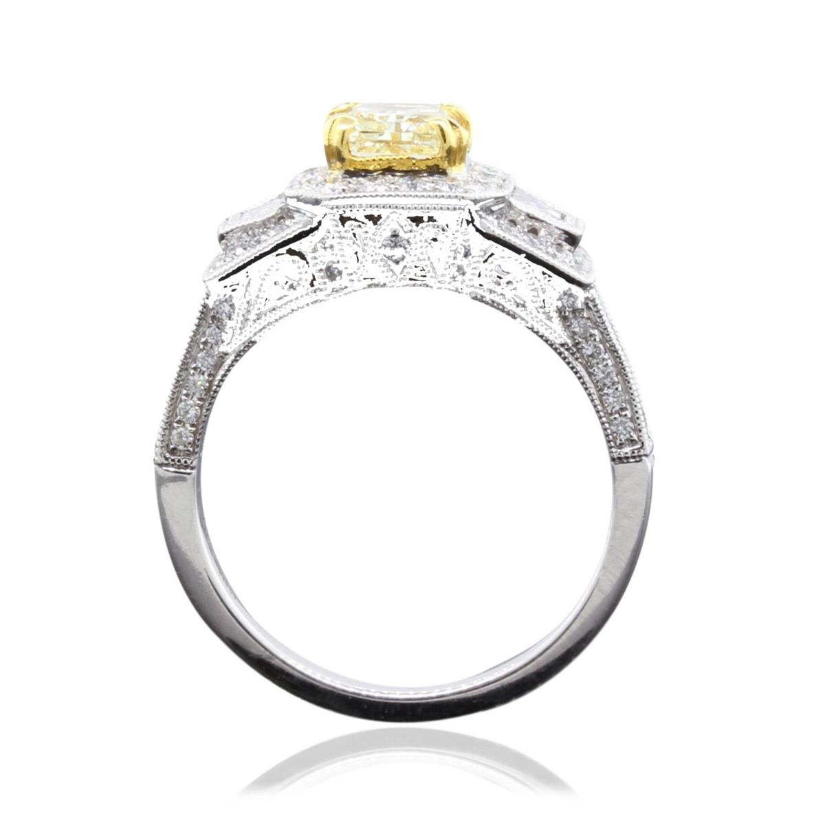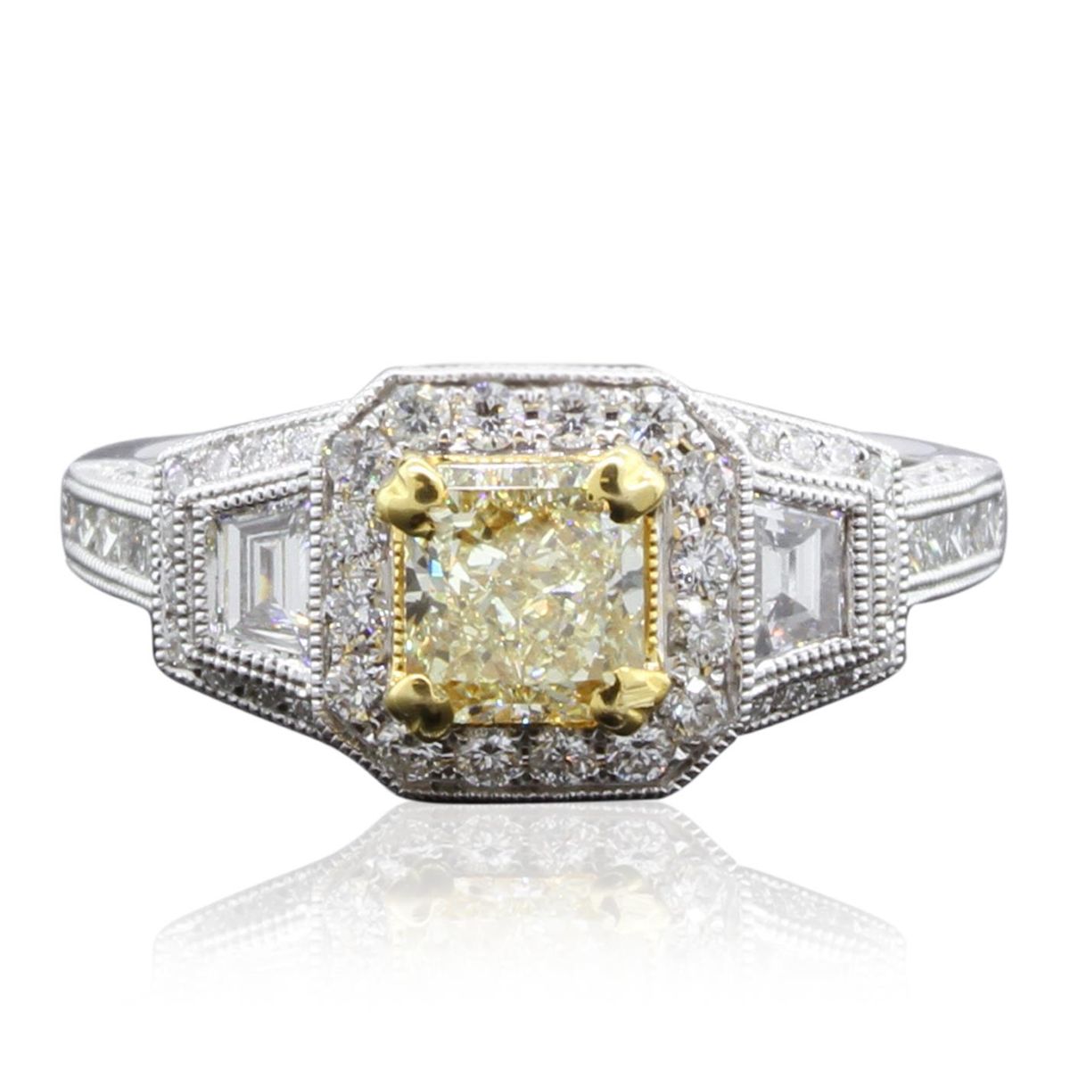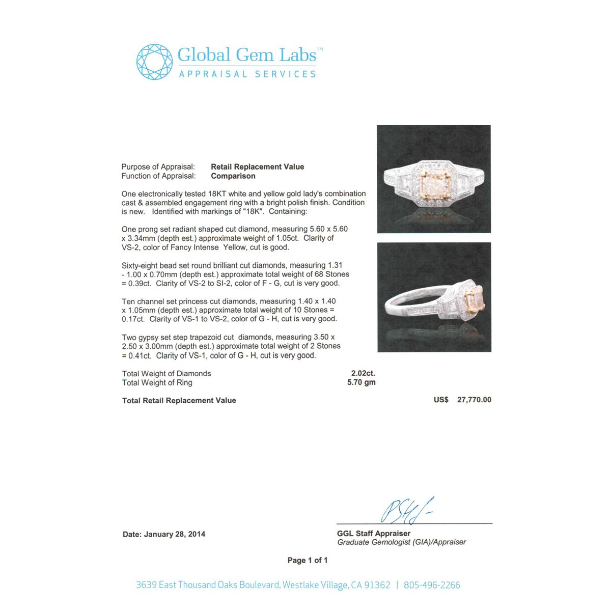 One electronically tested 18KT white and yellow gold Ladies combination cast & assembled engagement ring with a bright polish finish. Identified with markings of "18K". Condition is new. Containing: One prong set radiant shaped cut diamond, measuring 5.60 x 5.60 x 3.34mm (depth est.) approximate weight of 1.05ct. Clarity of VS-2, Cut is Good. Sixty-Eight bead set round brilliant cut diamonds, measuring 1.31 - 1.00 x 0.70mm (depth est.) approximate total weight of 68 Stones = 0.39ct. Clarity of VS-2 to SI-2, Color of F - G, Cut is Very Good. Ten channel set princess cut diamonds, measuring 1.40 x 1.40 x 1.05mm (depth est.) approximate total weight of 10 Stones = 0.17ct. Clarity of VS-1 to VS-2, Color of G - H, Cut is Very Good. Two gypsy set step trapezoid cut diamonds, measuring 3.50 x 2.50 x 3.00mm (depth est.) approximate total weight of 2 Stones = 0.41ct. Clarity of VS-1, Color of G - H, Cut is Very Good. Total Weight of Diamonds 2.02ct. Total Weight of Ring 5.70gm. GGL Appraised at $27,770.00.