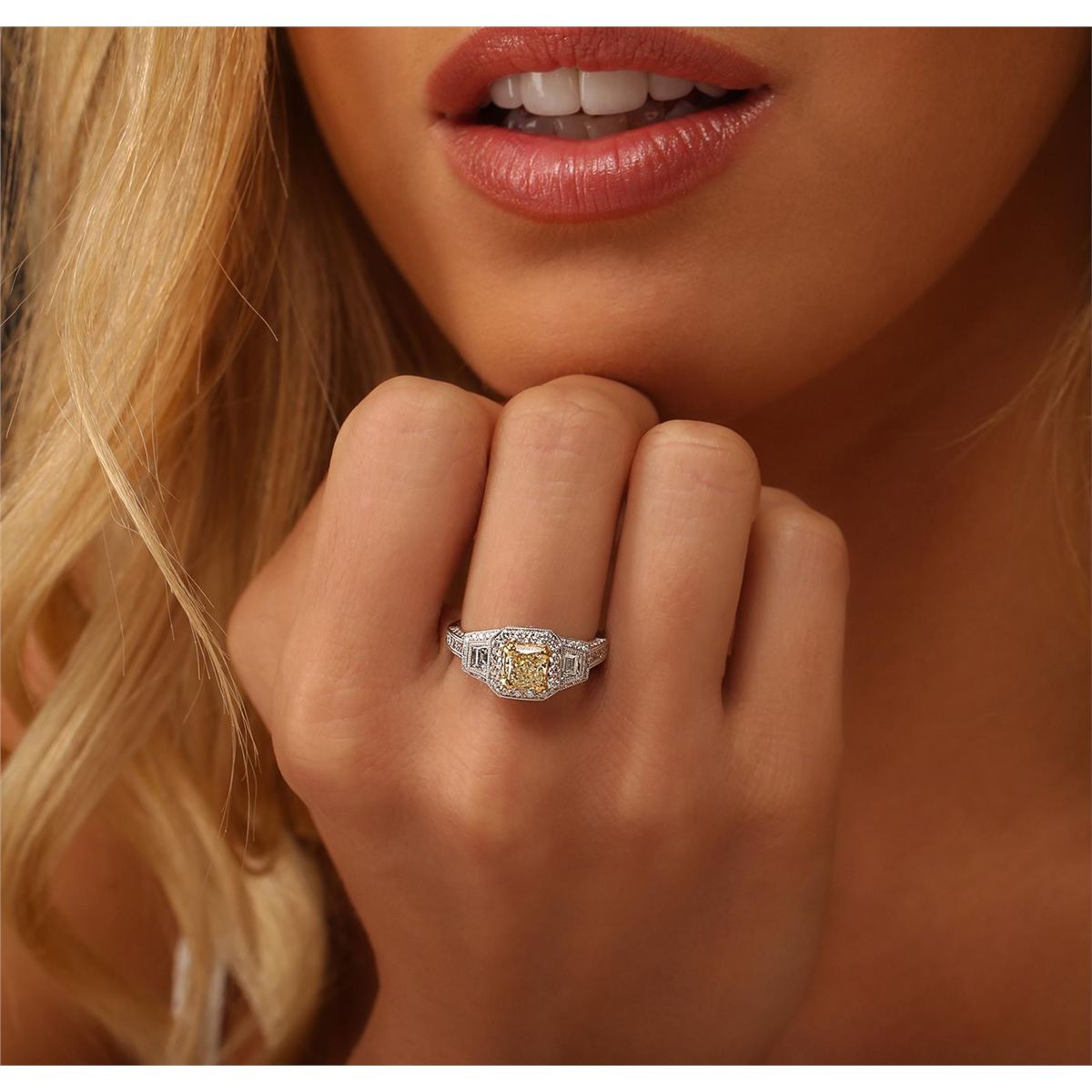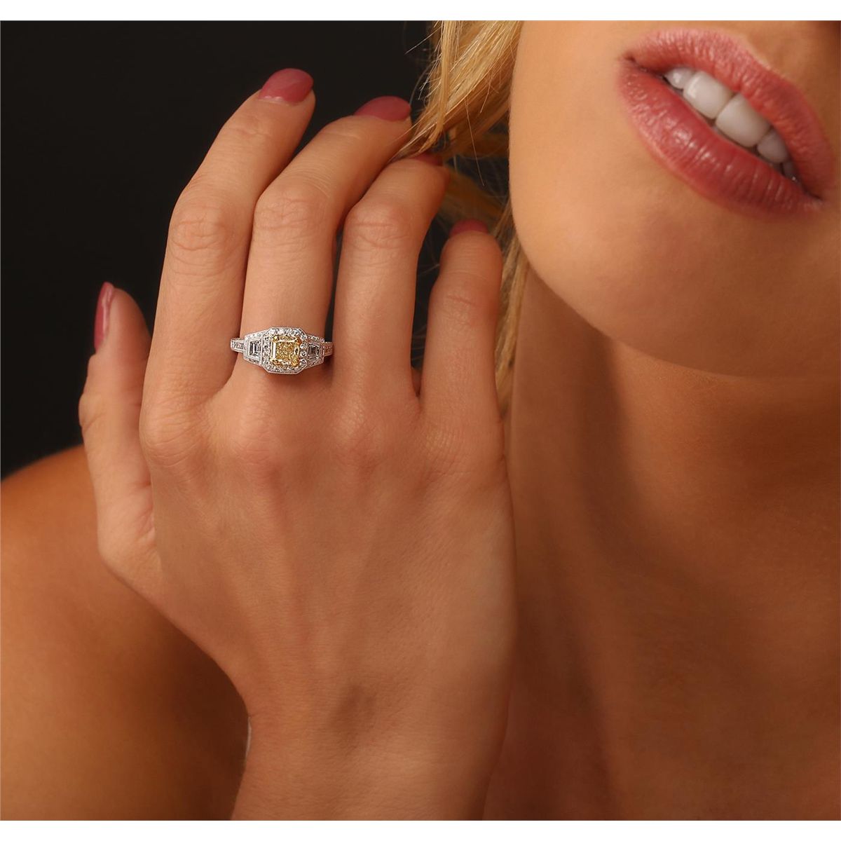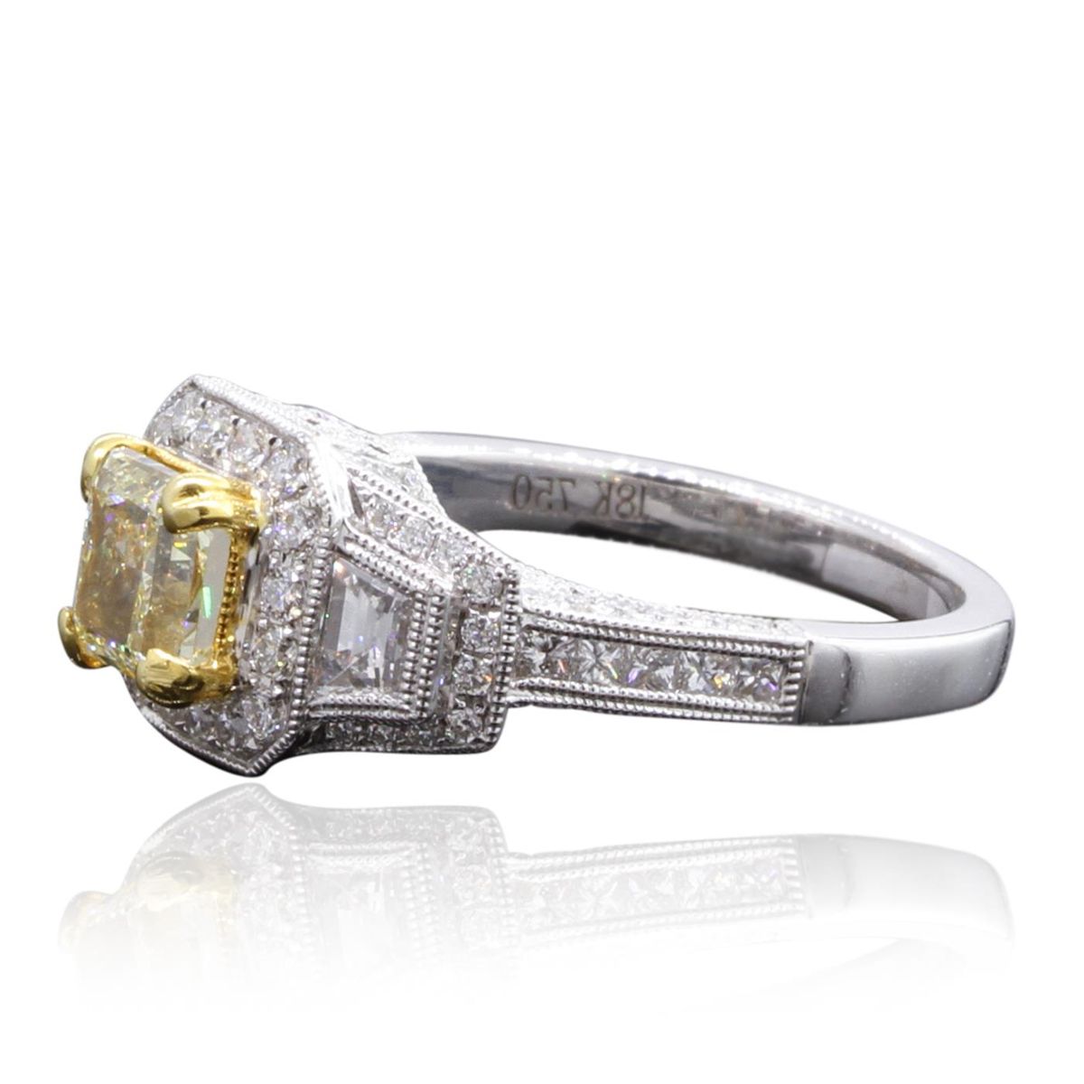 One electronically tested 18KT white and yellow gold Ladies combination cast & assembled engagement ring with a bright polish finish. Identified with markings of "18K". Condition is new. Containing: One prong set radiant shaped cut diamond, measuring 5.60 x 5.60 x 3.34mm (depth est.) approximate weight of 1.05ct. Clarity of VS-2, Cut is Good. Sixty-Eight bead set round brilliant cut diamonds, measuring 1.31 - 1.00 x 0.70mm (depth est.) approximate total weight of 68 Stones = 0.39ct. Clarity of VS-2 to SI-2, Color of F - G, Cut is Very Good. Ten channel set princess cut diamonds, measuring 1.40 x 1.40 x 1.05mm (depth est.) approximate total weight of 10 Stones = 0.17ct. Clarity of VS-1 to VS-2, Color of G - H, Cut is Very Good. Two gypsy set step trapezoid cut diamonds, measuring 3.50 x 2.50 x 3.00mm (depth est.) approximate total weight of 2 Stones = 0.41ct. Clarity of VS-1, Color of G - H, Cut is Very Good. Total Weight of Diamonds 2.02ct. Total Weight of Ring 5.70gm. GGL Appraised at $27,770.00.