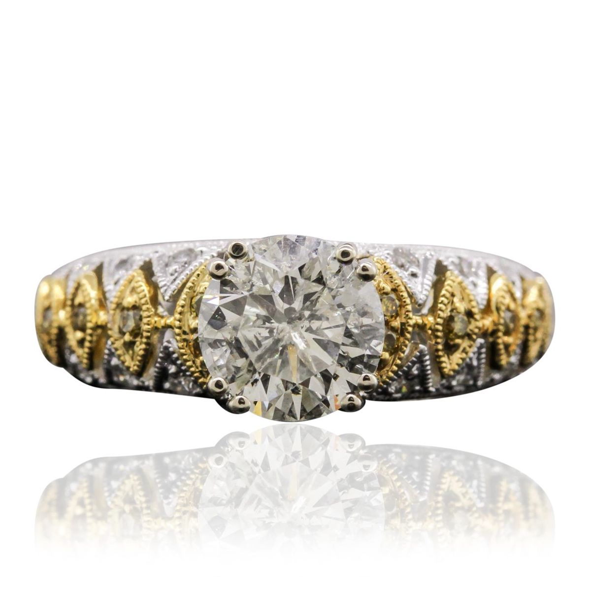 One electronically tested 18KT white and yellow gold ladies cast & assembled diamond ring. Condition is new, good workmanship. The featured diamond is supported by elaborate white and yellow diamond shoulders, completed by a three and one-half millimeter wide band. Bright polish finish with milgrain detailing throughout. Identified with markings of "18K". Containing: One prong set round brilliant cut diamond, measuring 7.20 - 7.20 x 4.85mm (depth est.) approximate weight of 1.63ct. Graded in the setting. Clarity: I-1 . Color: L Depth 67.4%. Table 59.7%. Twenty-Two bead set round brilliant cut diamonds, measuring 1.30 - 1.00 x 0.69mm (depth est.) approximate. Total Weight of 22 Stones = 0.22ct. Graded in the setting. Clarity: VS-2 to SI-1 . Color: G - I Twelve bead set round brilliant cut diamonds, measuring 1.40 - 1.30 x 0.81mm (depth est.) approximate. Total Weight of 12 Stones = 0.20ct. Indications of laboratory enhanced color. Graded in the setting. Clarity: VS-2 to SI-2 .. Total Weight of Diamonds 2.05ct.. Total Weight of Ring 5.76 grams. AIG Appraised at $22,775.00.