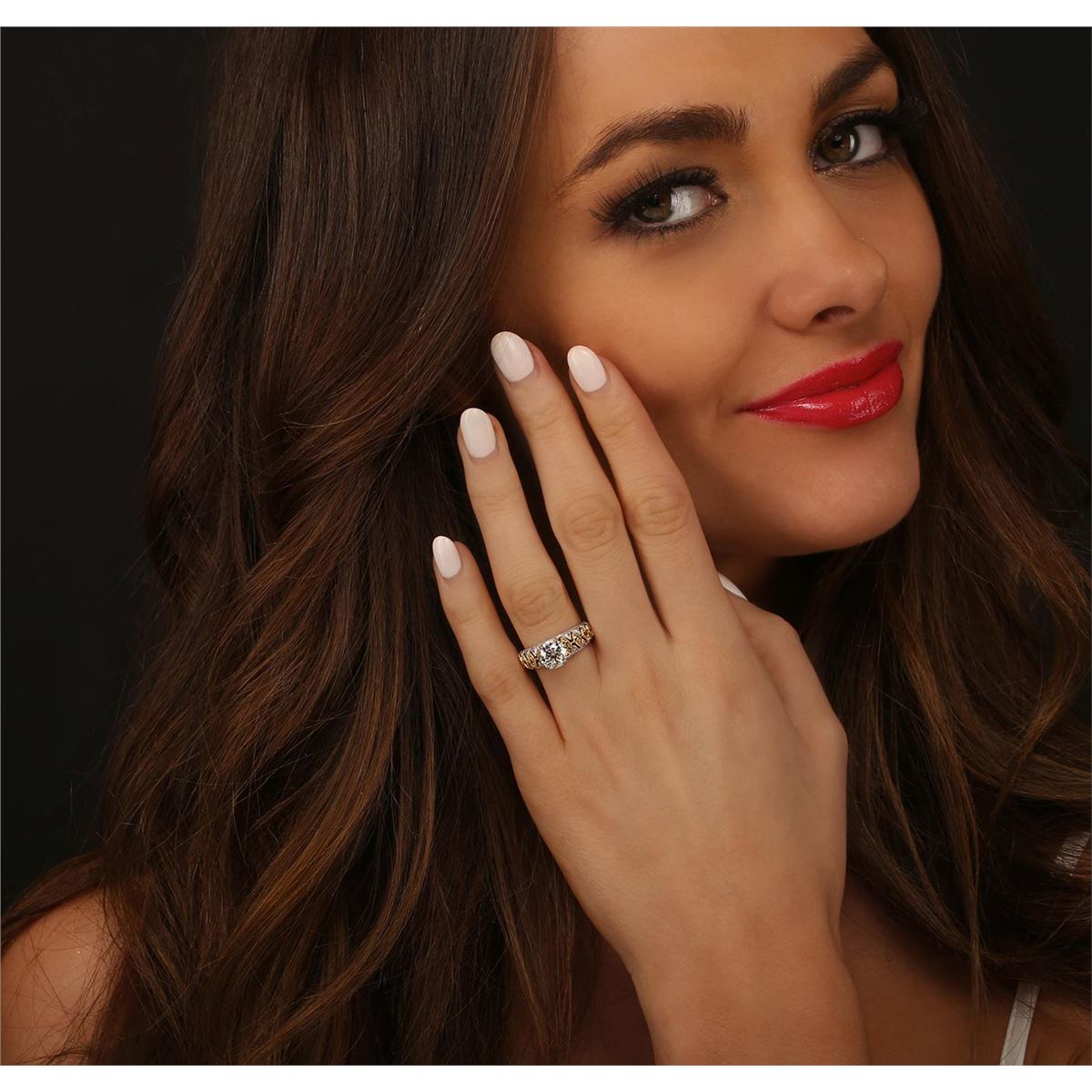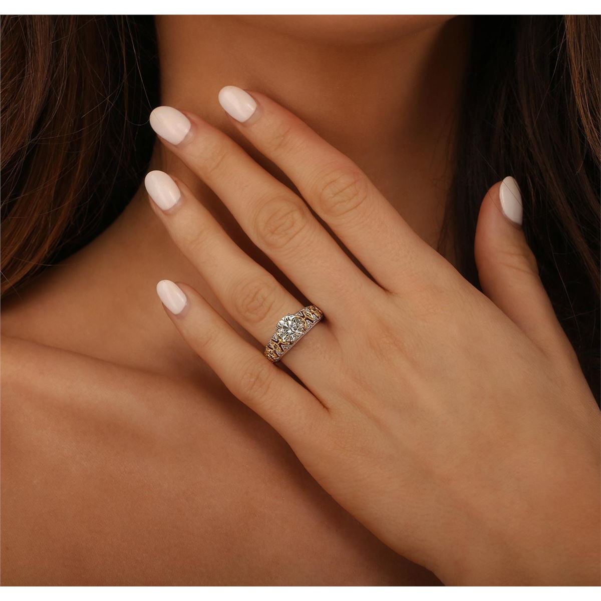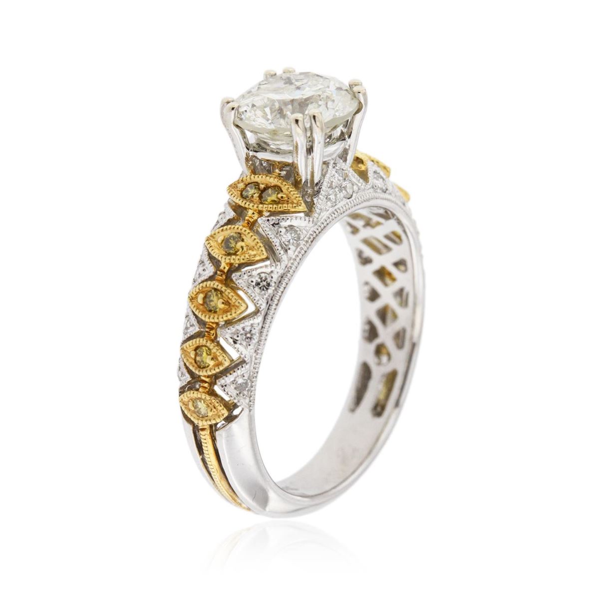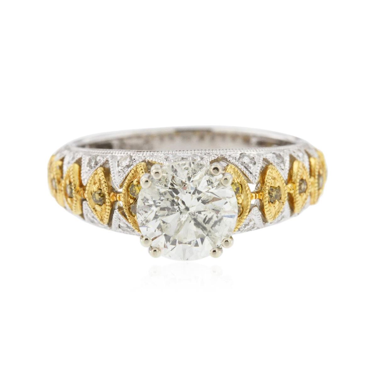 One electronically tested 18KT white and yellow gold ladies cast & assembled diamond ring. Condition is new, good workmanship. The featured diamond is supported by elaborate white and yellow diamond shoulders, completed by a three and one-half millimeter wide band. Bright polish finish with milgrain detailing throughout. Identified with markings of "18K". Containing: One prong set round brilliant cut diamond, measuring 7.20 - 7.20 x 4.85mm (depth est.) approximate weight of 1.63ct. Graded in the setting. Clarity: I-1 . Color: L Depth 67.4%. Table 59.7%. Twenty-Two bead set round brilliant cut diamonds, measuring 1.30 - 1.00 x 0.69mm (depth est.) approximate. Total Weight of 22 Stones = 0.22ct. Graded in the setting. Clarity: VS-2 to SI-1 . Color: G - I Twelve bead set round brilliant cut diamonds, measuring 1.40 - 1.30 x 0.81mm (depth est.) approximate. Total Weight of 12 Stones = 0.20ct. Indications of laboratory enhanced color. Graded in the setting. Clarity: VS-2 to SI-2 .. Total Weight of Diamonds 2.05ct.. Total Weight of Ring 5.76 grams. AIG Appraised at $22,775.00.