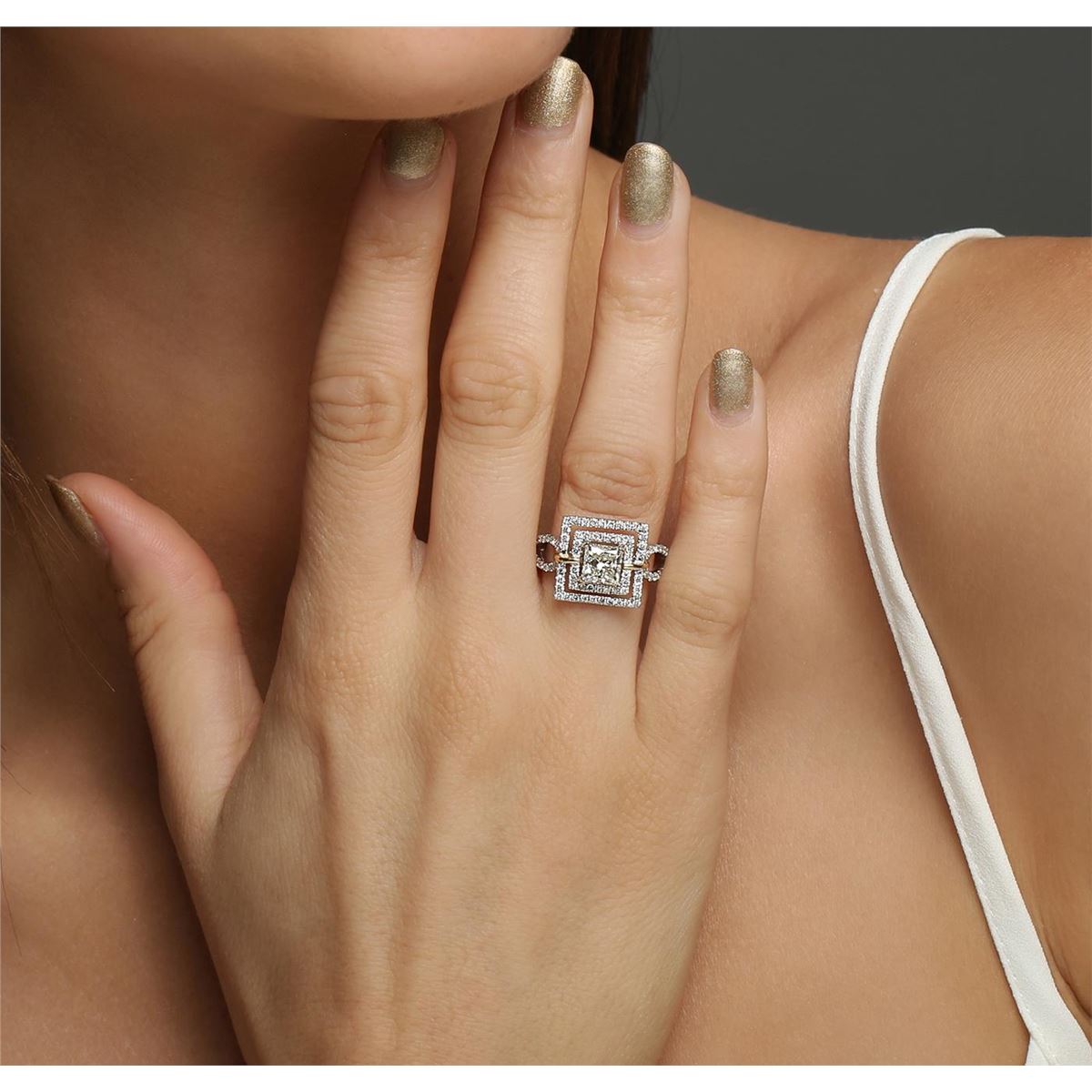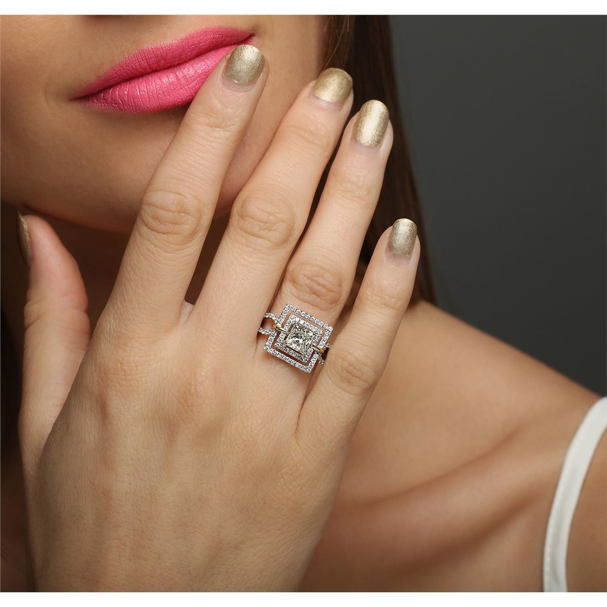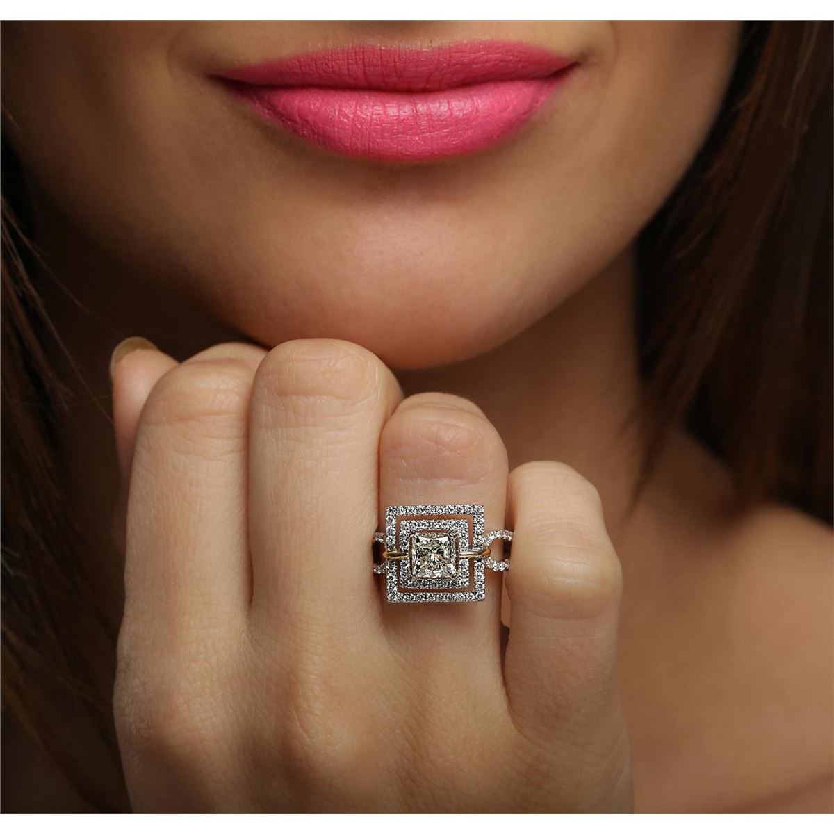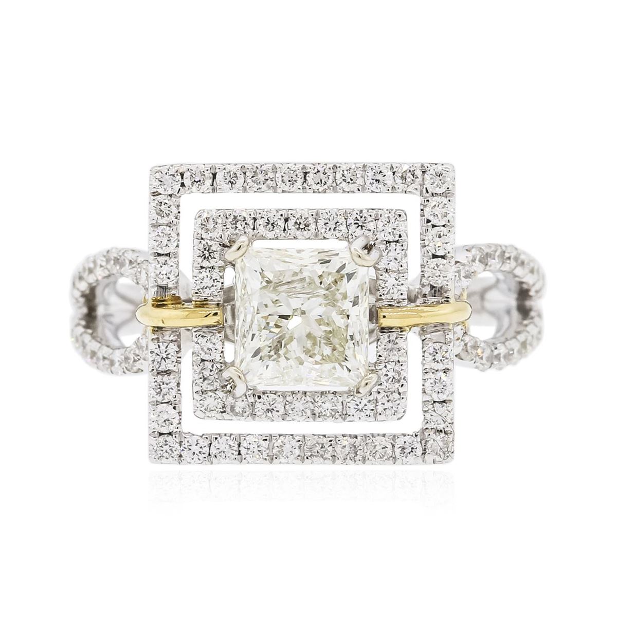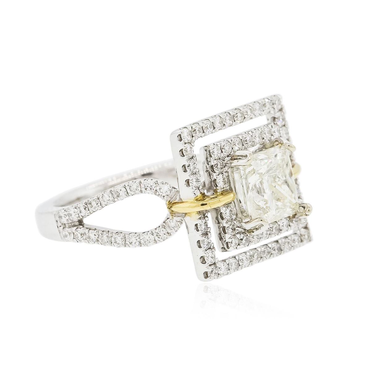 One electronically tested 18KT white and yellow gold ladies combination cast & assembled engagement ring with a bright polish finish. Identified with markings of "18K". Condition is new. Containing: One prong set princess cut diamond, measuring 6.10 x 5.95 x 4.46mm (depth est.) approximate weight of 1.33ct. Clarity: I-1. Color: K, Cut is Good. Ninety prong set round brilliant cut diamonds, measuring 1.20 - 1.20 x 0.72mm (depth est.) approximate total weight of 90 Stones = 0.76ct. Clarity: SI-1 to I-1. Color: H - I, Cut is Good. All diamonds are graded in the mounting, unless otherwise stated. Total Weight of Diamonds 2.09ct. Total Weight of Ring 6.10 grams. GGL Appraised at $19,925.00.