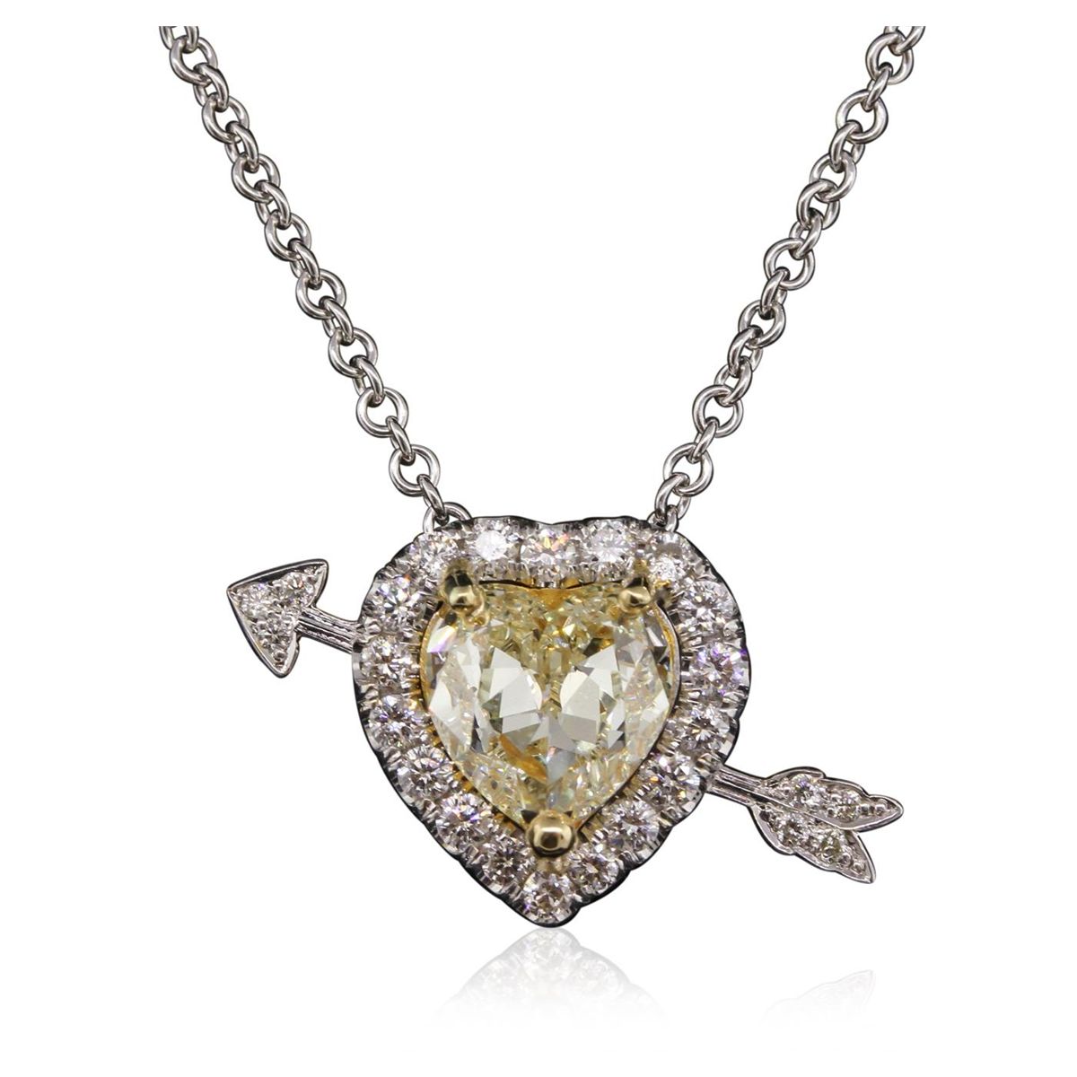 One electronically tested 18KT yellow & white gold ladies cast & assembled diamond "Heart with Arrow" pendant with chain. Condition is new, good workmanship. The slide pendant features a heart shaped pendant composed of a heart shaped diamond mounted in an 18KT yellow gold basket set within a diamond bezel, accented with an 18KT white gold arrow through it. The pendant is supported by an eighteen inch length 18KT white gold designer style chain terminating in a lobster claw clasp. Bright polish finish. Containing: One prong set heart shaped cut diamond, measuring 8.00 x 7.07 x 4.45mm (depth est.), 17.00.%. GTCF approximate weight of 1.81ct with a faint blue fluorescence. Diamond Grading Report attached. Graded in the setting. Clarity: VS-2. Depth: 62.9%. Table 63.7%. Eighteen prong set round brilliant cut diamonds, measuring 1.80 - 1.50 x 0.99mm (depth est.) approximate. Total Weight of 18 Stones = 0.41ct. Graded in the setting. Clarity: VS-1 to SI-1. Color: F - H Seven bead set round brilliant cut diamonds, measuring 1.00 - 1.00 x 0.60mm (depth est.) approximate. Total Weight of 7 Stones = 0.03ct. Graded in the setting. Clarity: SI-1 to I-1. Color: H - J. Total Weight of Diamonds 2.25ct. Total Weight of Pendant With Chain 7.40 grams. AIG Appraised at $22,040.00.