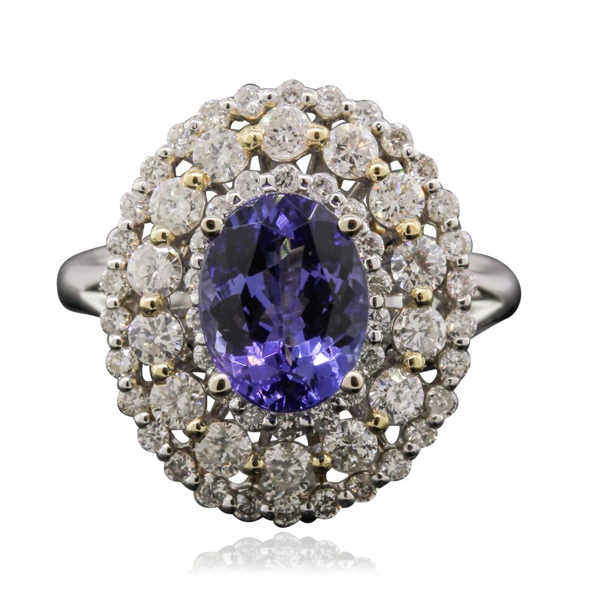 One electronically tested 18KT white and yellow gold Ladies combination cast & assembled fancy ring with a bright polish finish. Identified with markings of "18K". Condition is new. Containing: Eighteen prong set round brilliant cut diamonds, measuring 1.20 - 1.20 x 0.72mm (depth est.) approximate. Total Weight of 18 Stones = 0.15ct. Clarity: I-1. Color: G - H, Cut is Good. Thirty prong set round brilliant cut diamonds, measuring 1.30 - 1.30 x 0.78mm (depth est.) approximate. Total Weight of 30 Stones = 0.30ct. Clarity: I-1. Color: G - H, Cut is Good. Fourteen prong set round brilliant cut diamonds, measuring 2.20 - 2.20 x 1.32mm (depth est.) approximate. Total Weight of 14 Stones = 0.65ct. Clarity: I-1. Color: G - H, Cut is Good. One prong set oval modified mixed cut natural tanzanite, measuring 9.00 x 7.00 x 4.55mm, approximate weight of 2.28ct., clarity is eye clean, type I, medium light, very slightly grayish, violet color, (GIA V 4/3), cut is very good. Colored gemstones are presumed to have been subjected to commonly used color/clarity enhancement processes. Total Weight of Colored Stones 2.28ct. Total Weight of Diamonds 1.10ct. Total Weight of Ring 8.00 grams. GGL Appraised at $7,550.00.