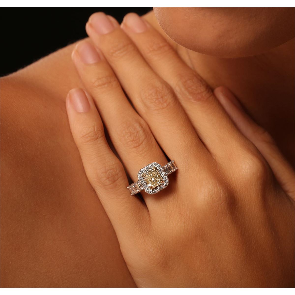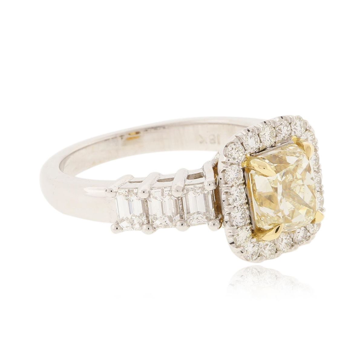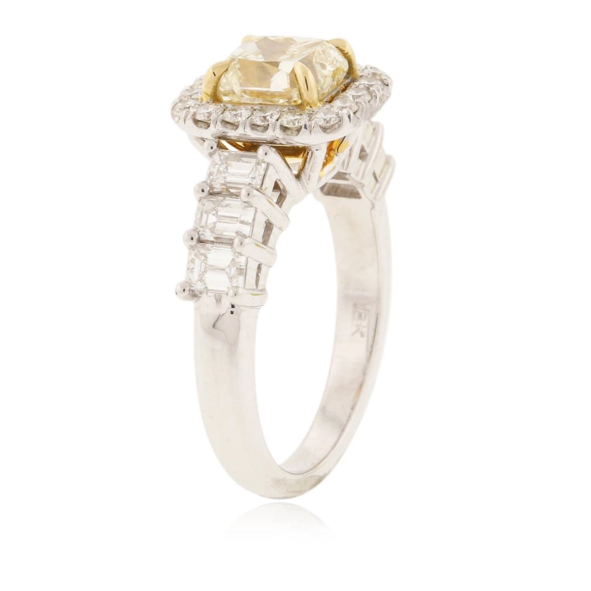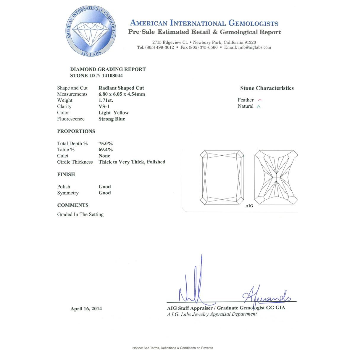 One electronically tested 18KT two-tone, yellow and white gold ladies cast & assembled diamond ring with a bright polish finish. Condition is new, good workmanship. The featured diamond is mounted in an 18KT yellow gold basket set within a 18KT white gold diamond bezel, supported by diamond set shoulders and completed by a two and one-half millimeter wide band. Identified with markings of "18K". Containing: One prong set radiant shaped cut diamond, measuring 6.80 x 6.05 x 4.54mm (depth est.), 8.00.%. GTCF approximate weight of 1.71ct with a strong blue fluorescence. Diamond Grading Report attached. Graded in the setting. Clarity: VS-1. Depth: 75.0%. Table 69.4%. Eighteen prong set round brilliant cut diamonds, measuring 1.80 - 1.70 x 1.05mm (depth est.) approximate. Total Weight of 18 Stones = 0.45ct. Graded in the setting. Clarity: VS-2 to SI-2. Color: G - I Six prong set emerald shaped cut diamonds, measuring 3.50 x 2.40 x 1.61mm (depth est.) approximate. Total Weight of 6 Stones = 0.84ct. Graded in the setting. Clarity: VVS-2 to VS-2. Color: F - H. Total Weight of Diamonds 3.00ct. Total Weight of Ring 7.70 grams. AIG Appraised at $25,720.00.