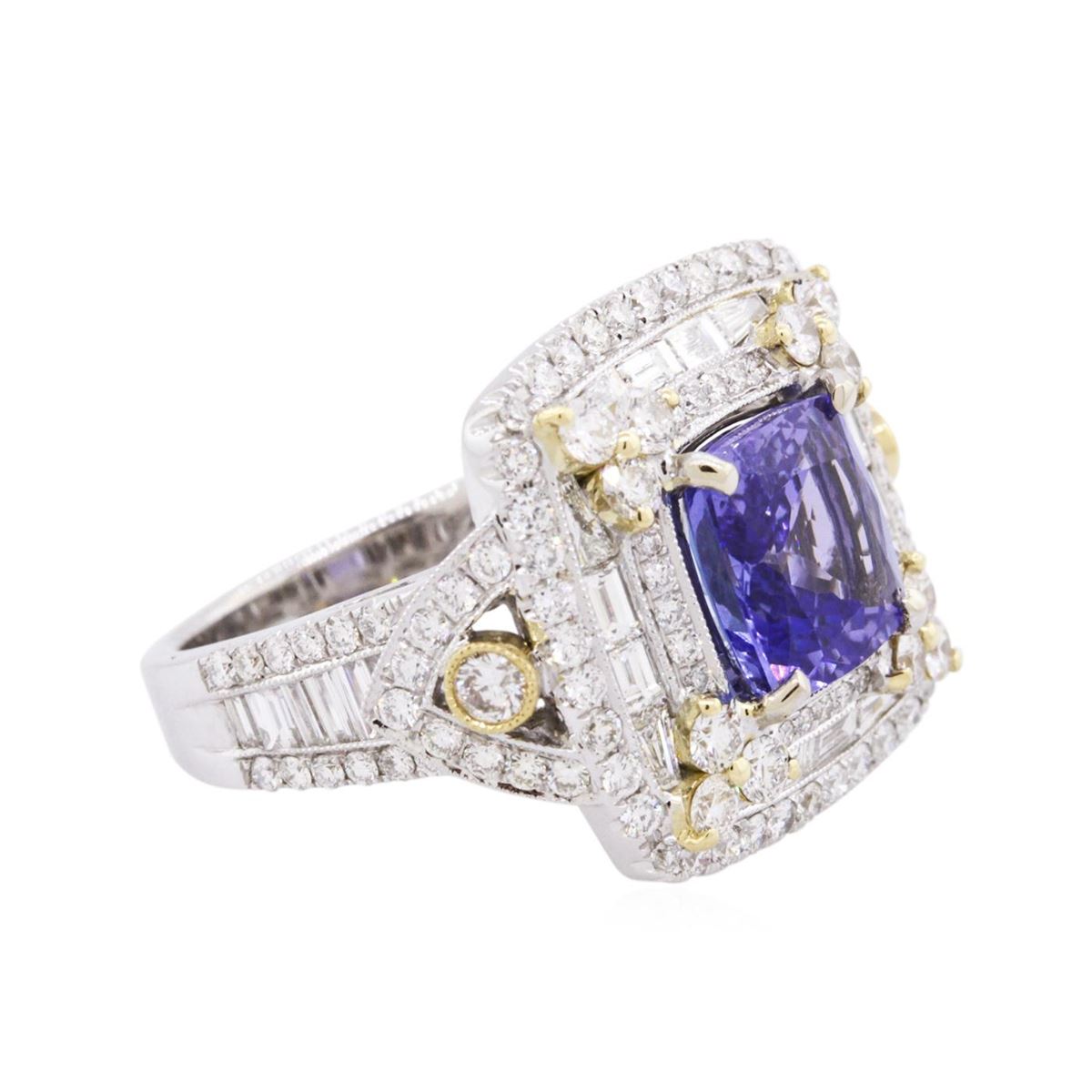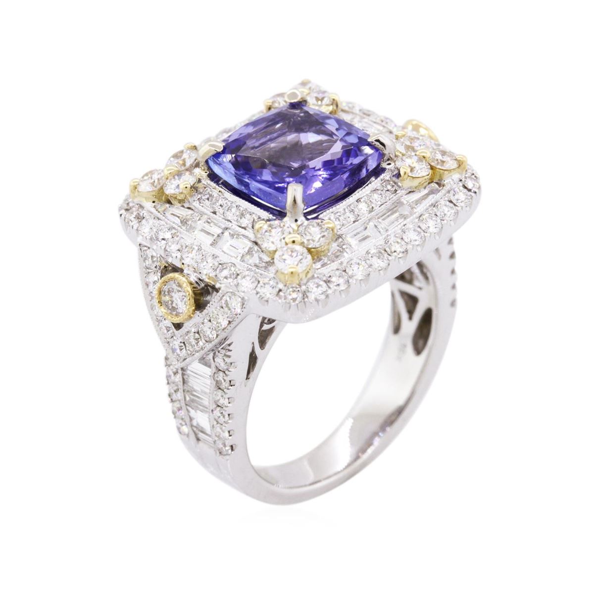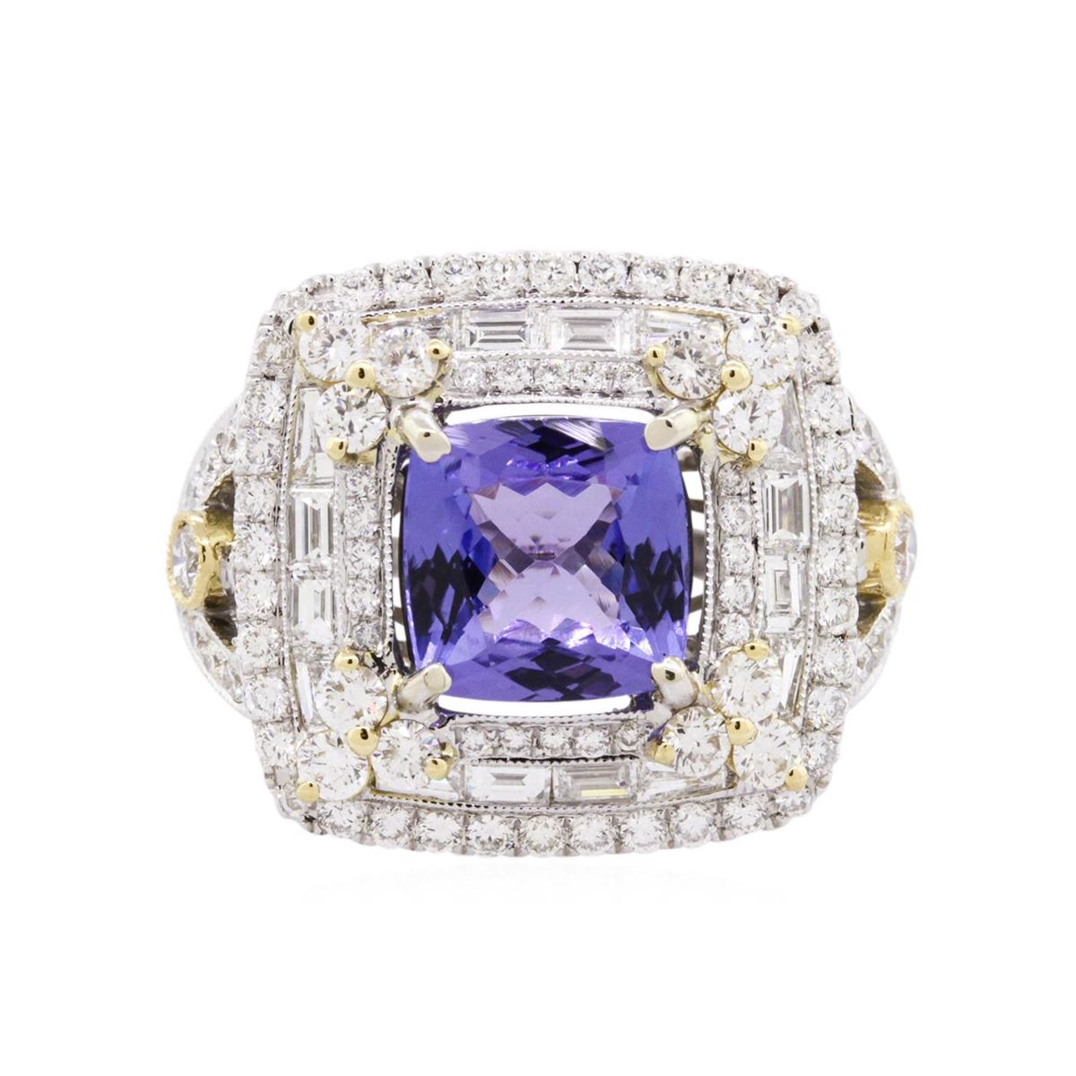 One electronically tested 18KT white and yellow gold ladies combination cast & assembled tanzanite and diamond ring with a flat shank with a bright polish finish. Identified with markings of "18K". Condition is new. Containing: One prong set square cushion modified brilliant cut natural tanzanite, measuring 8.96 x 8.92 x 5.08mm, approximate weight of 3.20ct., clarity is eye clean, type I, medium, very slightly grayish, violet color, (GIA V 5/3), cut is good. Two bezel set round brilliant cut diamonds, measuring 2.90 - 2.90 x 1.74mm (depth est.) approximate total weight of 2 Stones = 0.18ct. Clarity: SI-1 to SI. Color: L, Cut is Good. Twelve prong set round brilliant cut diamonds, measuring 2.20 - 2.20 x 1.32mm (depth est.) approximate total weight of 12 Stones = 0.47ct. Clarity: SI-1. Color: L, Cut is Good. One Hundred prong set round brilliant cut diamonds, measuring 1.30 - 1.20 x 0.75mm (depth est.) approximate total weight of 100 Stones = 0.71ct. Clarity: SI-1 to I-1. Color: I - J, Cut is Good. Twenty-Eight channel set baguette cut diamonds, measuring from 2.00 x 1.20 x 1.02mm (depth est.) to 3.00 x 1.50 x 1.28mm (depth est.) approximate total weight of 28 Stones = 0.99ct. Clarity: VS-2 to SI-1. Color: I - J, Cut is Good. Colored gemstones are presumed to have been subjected to commonly used enhancement processes. All diamonds and colored gemstones are graded in the mounting, unless otherwise stated. Total Weight of Colored Stones 3.20ct. Total Weight of Diamonds 2.35ct. Total Weight of Ring 12.90 grams. GGL Appraised at $16,045.00.