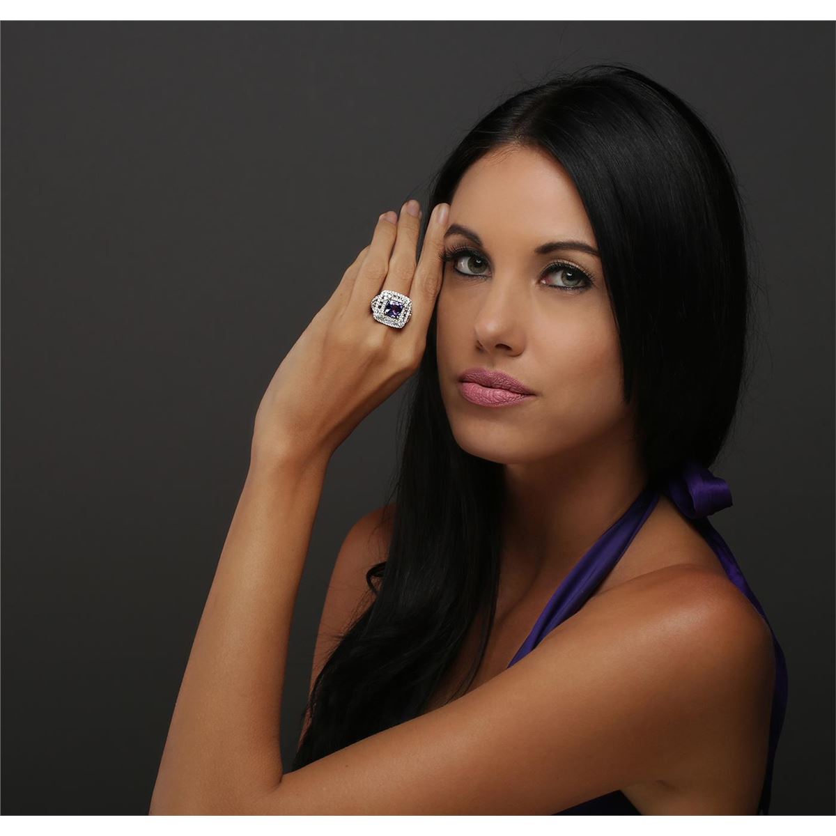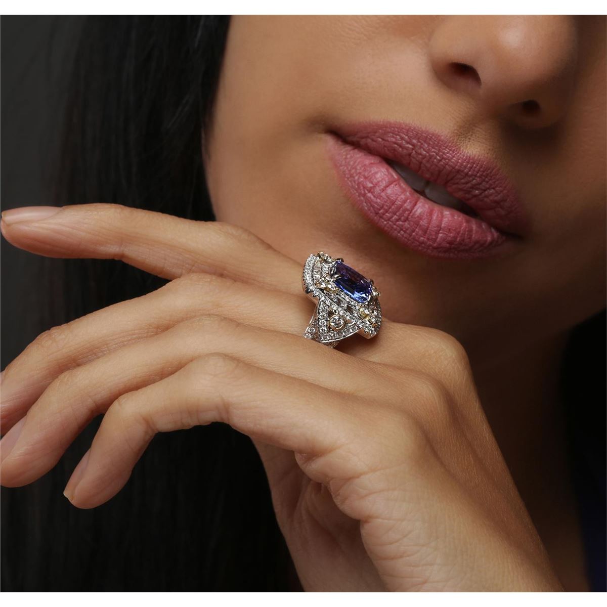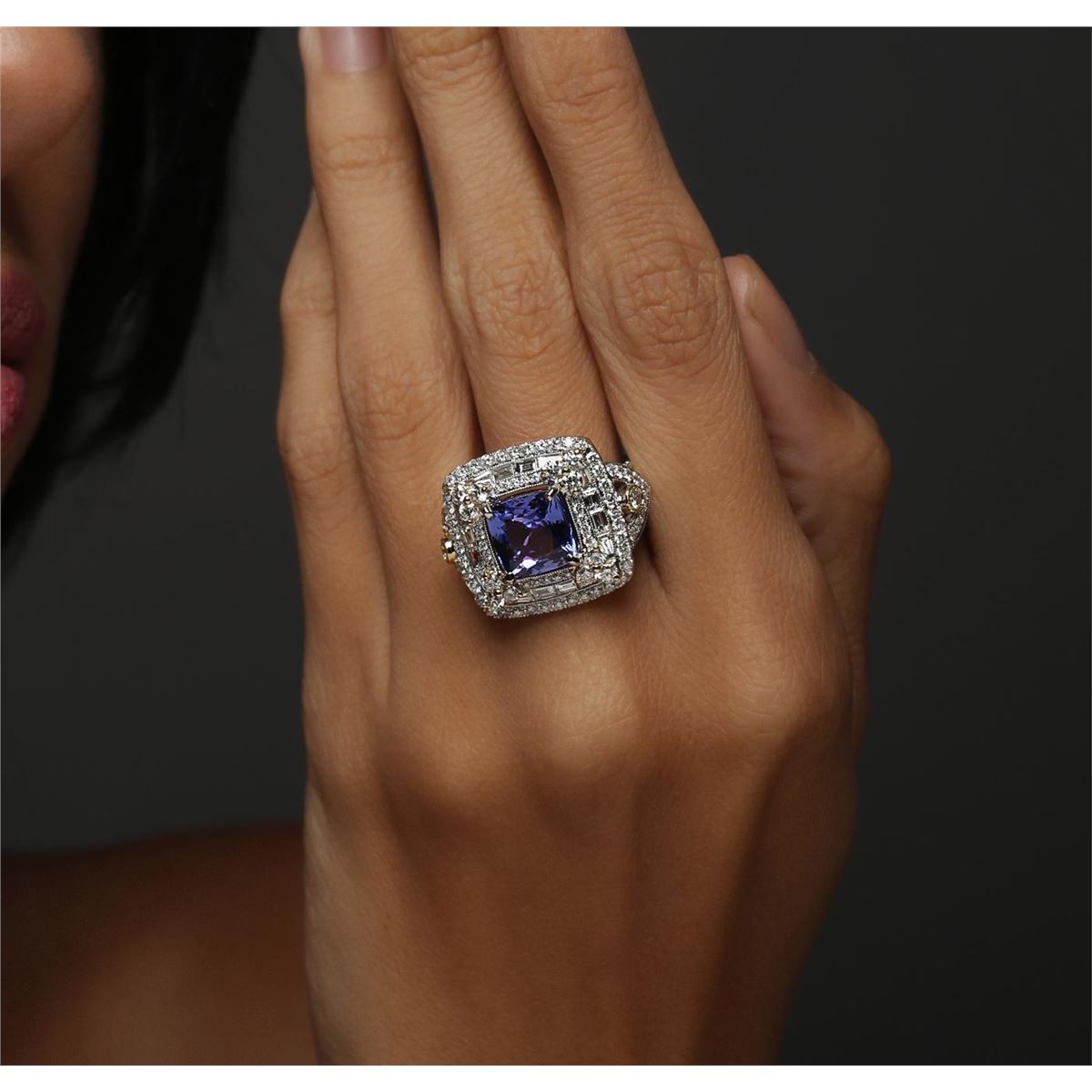 One electronically tested 18KT white and yellow gold ladies combination cast & assembled tanzanite and diamond ring with a flat shank with a bright polish finish. Identified with markings of "18K". Condition is new. Containing: One prong set square cushion modified brilliant cut natural tanzanite, measuring 8.96 x 8.92 x 5.08mm, approximate weight of 3.20ct., clarity is eye clean, type I, medium, very slightly grayish, violet color, (GIA V 5/3), cut is good. Two bezel set round brilliant cut diamonds, measuring 2.90 - 2.90 x 1.74mm (depth est.) approximate total weight of 2 Stones = 0.18ct. Clarity: SI-1 to SI. Color: L, Cut is Good. Twelve prong set round brilliant cut diamonds, measuring 2.20 - 2.20 x 1.32mm (depth est.) approximate total weight of 12 Stones = 0.47ct. Clarity: SI-1. Color: L, Cut is Good. One Hundred prong set round brilliant cut diamonds, measuring 1.30 - 1.20 x 0.75mm (depth est.) approximate total weight of 100 Stones = 0.71ct. Clarity: SI-1 to I-1. Color: I - J, Cut is Good. Twenty-Eight channel set baguette cut diamonds, measuring from 2.00 x 1.20 x 1.02mm (depth est.) to 3.00 x 1.50 x 1.28mm (depth est.) approximate total weight of 28 Stones = 0.99ct. Clarity: VS-2 to SI-1. Color: I - J, Cut is Good. Colored gemstones are presumed to have been subjected to commonly used enhancement processes. All diamonds and colored gemstones are graded in the mounting, unless otherwise stated. Total Weight of Colored Stones 3.20ct. Total Weight of Diamonds 2.35ct. Total Weight of Ring 12.90 grams. GGL Appraised at $16,045.00.