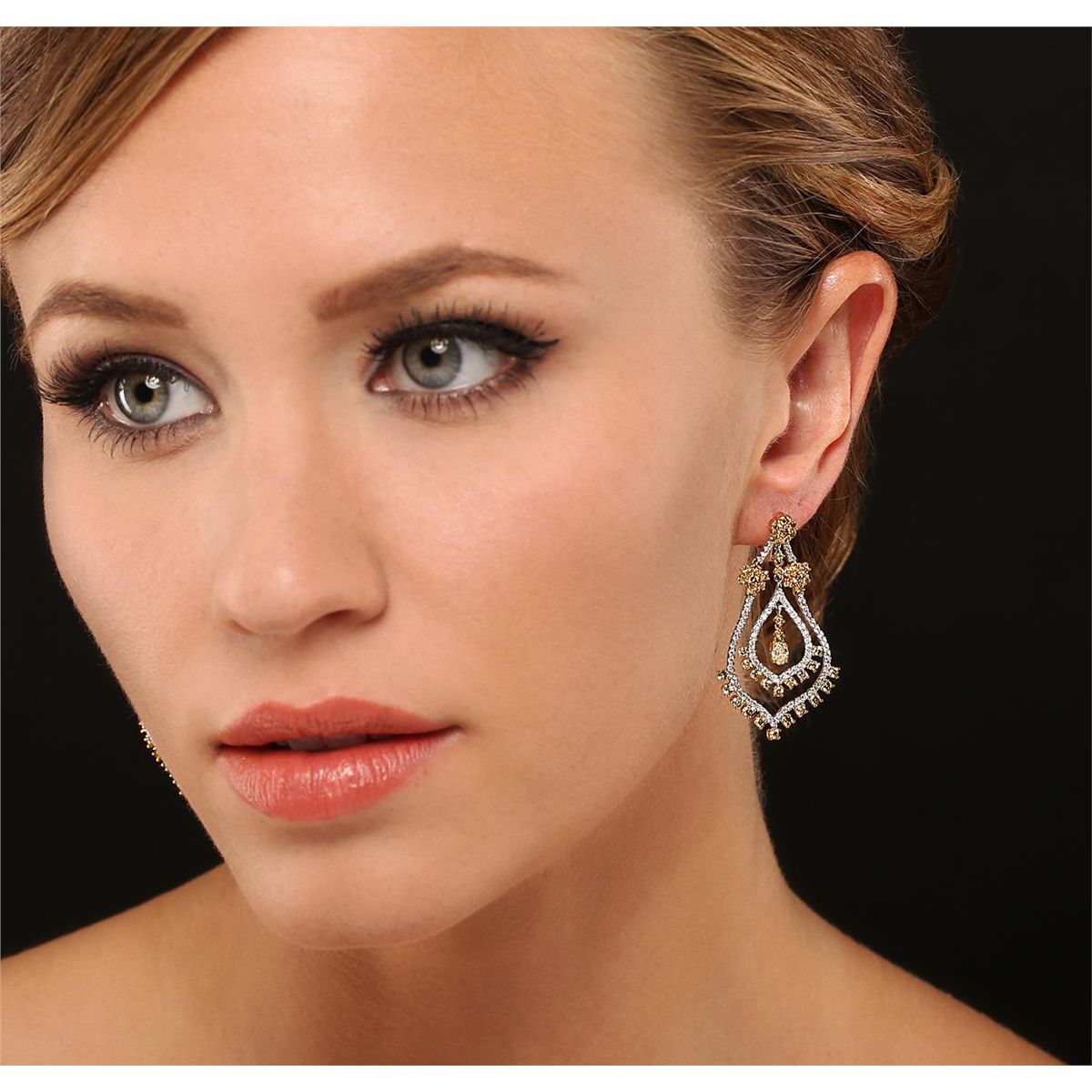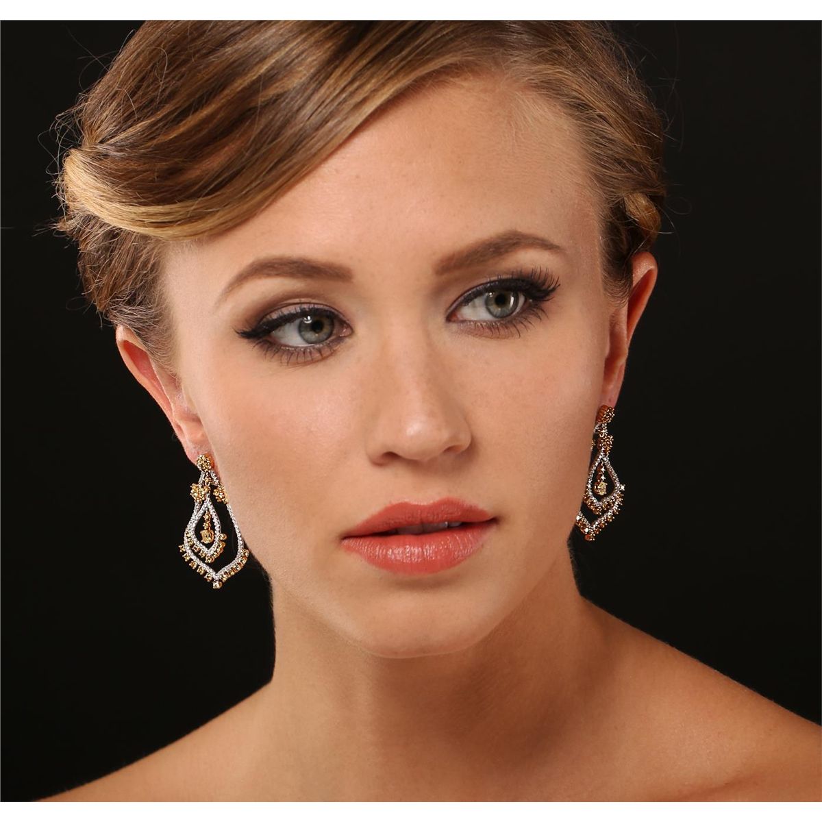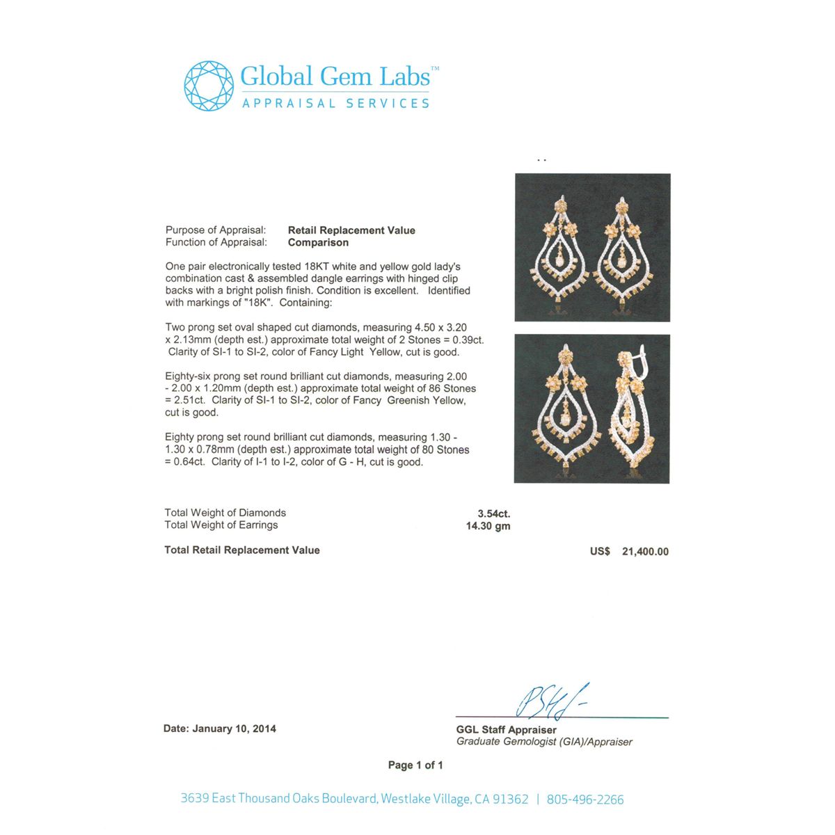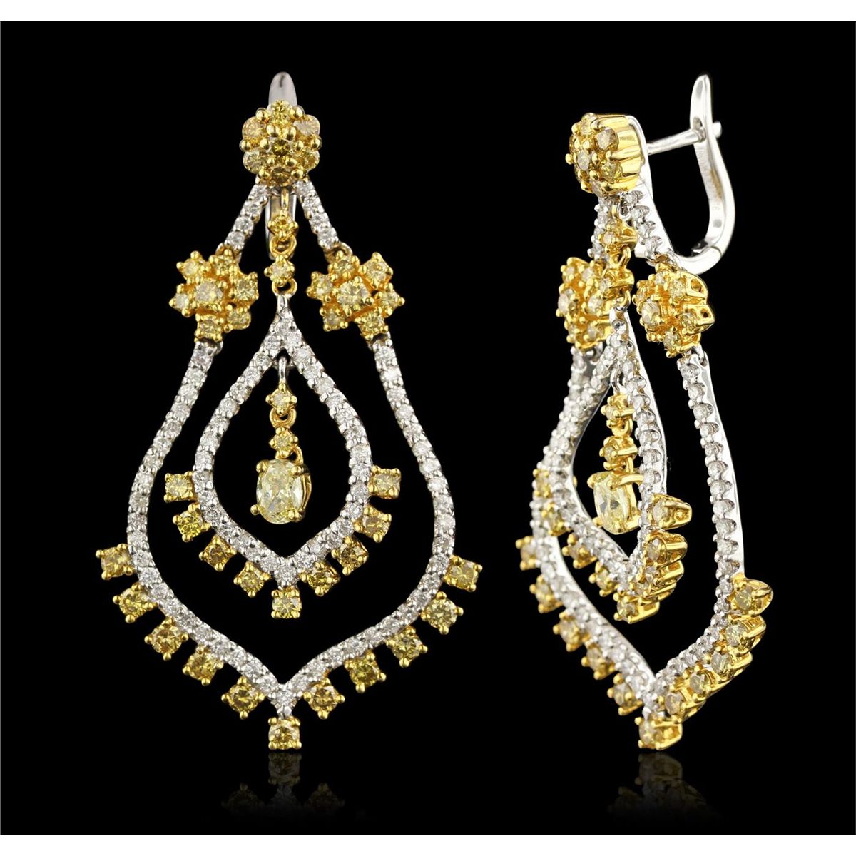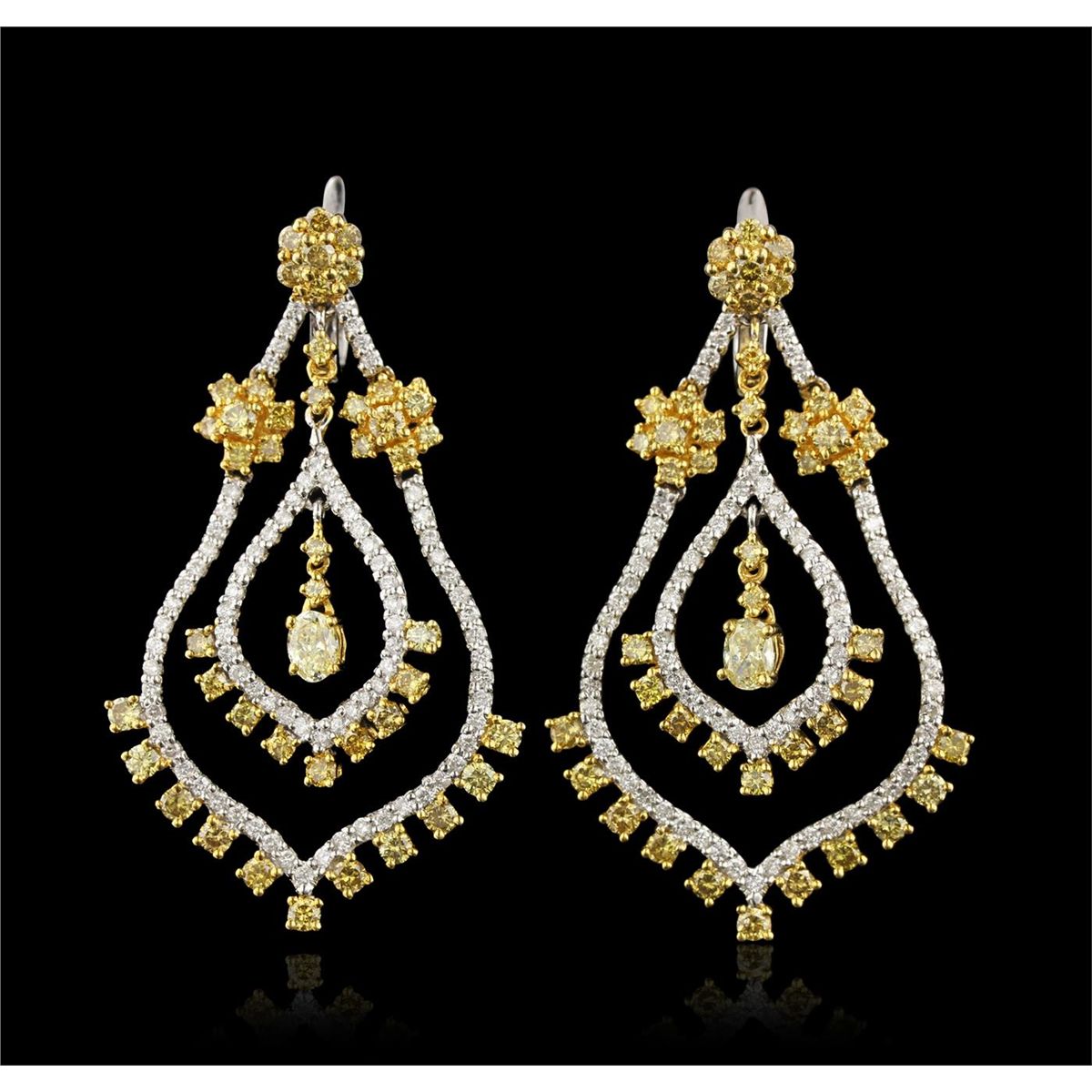 One pair electronically tested 18KT white and yellow gold Ladies combination cast & assembled dangle earrings with hinged clip backs with a bright polish finish. Identified with markings of "18K". Condition is excellent. Containing: Two prong set oval shaped cut diamonds, measuring 4.50 x 3.20 x 2.13mm (depth est.) approximate total weight of 2 Stones = 0.39ct. Clarity of SI-1 to SI-2, Cut is Good. Eighty-Six prong set round brilliant cut diamonds, measuring 2.00 - 2.00 x 1.20mm (depth est.) approximate total weight of 86 Stones = 2.51ct. Clarity of SI-1 to SI-2, Cut is Good. Eighty prong set round brilliant cut diamonds, measuring 1.30 - 1.30 x 0.78mm (depth est.) approximate total weight of 80 Stones = 0.64ct. Clarity of I-1 to I-2, Color of G - H, Cut is Good. Total Weight of Diamonds 3.54ct. Total Weight of Earrings 14.30gm. GGL Appraised at $21,400.00.