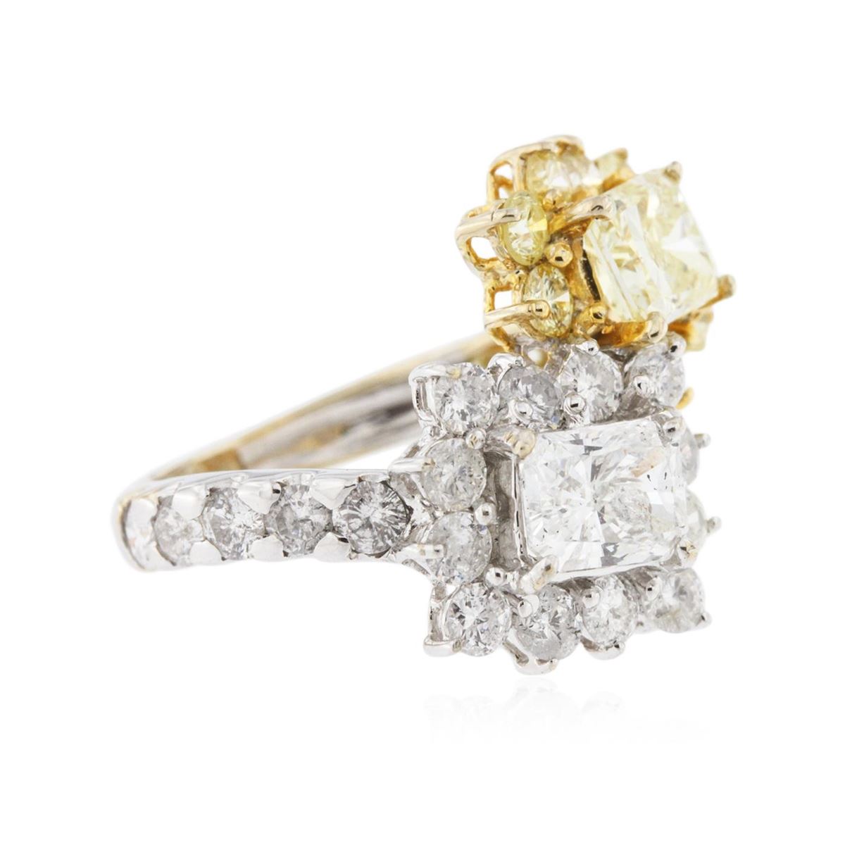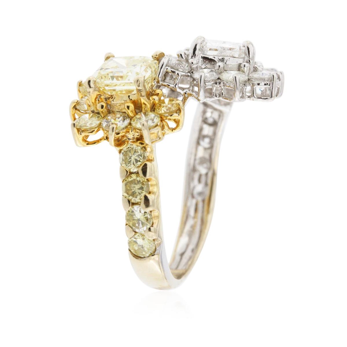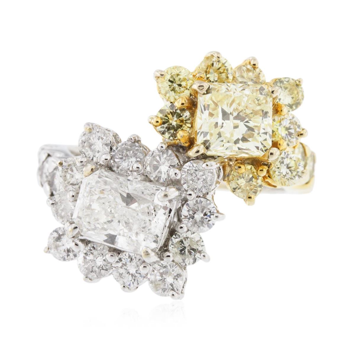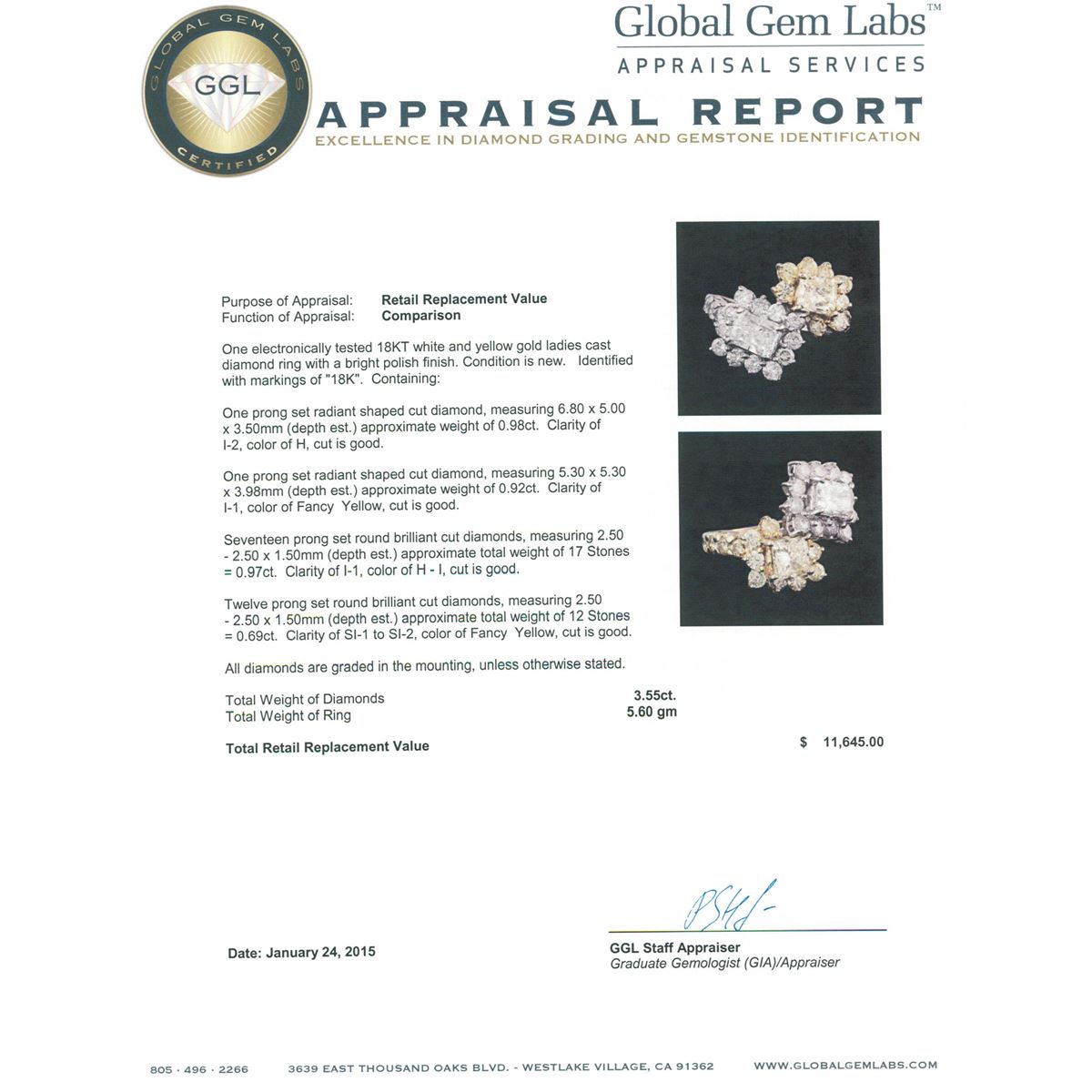 One electronically tested 18KT white and yellow gold ladies cast diamond ring with a bright polish finish. Identified with markings of "18K". Condition is new. Containing: One prong set radiant shaped cut diamond, measuring 6.80 x 5.00. x 3.50mm (depth est.) approximate weight of 0.98ct. Clarity: I-2. Color: H, Cut is Good. One prong set radiant shaped cut diamond, measuring 5.30 x 5.30 x 3.98mm (depth est.) approximate weight of 0.92ct. Clarity: I-1, Cut is Good. Seventeen prong set round brilliant cut diamonds, measuring 2.50 - 2.50 x 1.50mm (depth est.) approximate total weight of 17 Stones = 0.97ct. Clarity: I-1. Color: H - I, Cut is Good. Twelve prong set round brilliant cut diamonds, measuring 2.50 - 2.50 x 1.50mm (depth est.) approximate total weight of 12 Stones = 0.69ct. Clarity: SI-1 to SI-2, Cut is Good. All diamonds are graded in the mounting, unless otherwise stated. Total Weight of Diamonds 3.55ct. Total Weight of Ring 5.60 grams. GGL Appraised at $11,645.00.