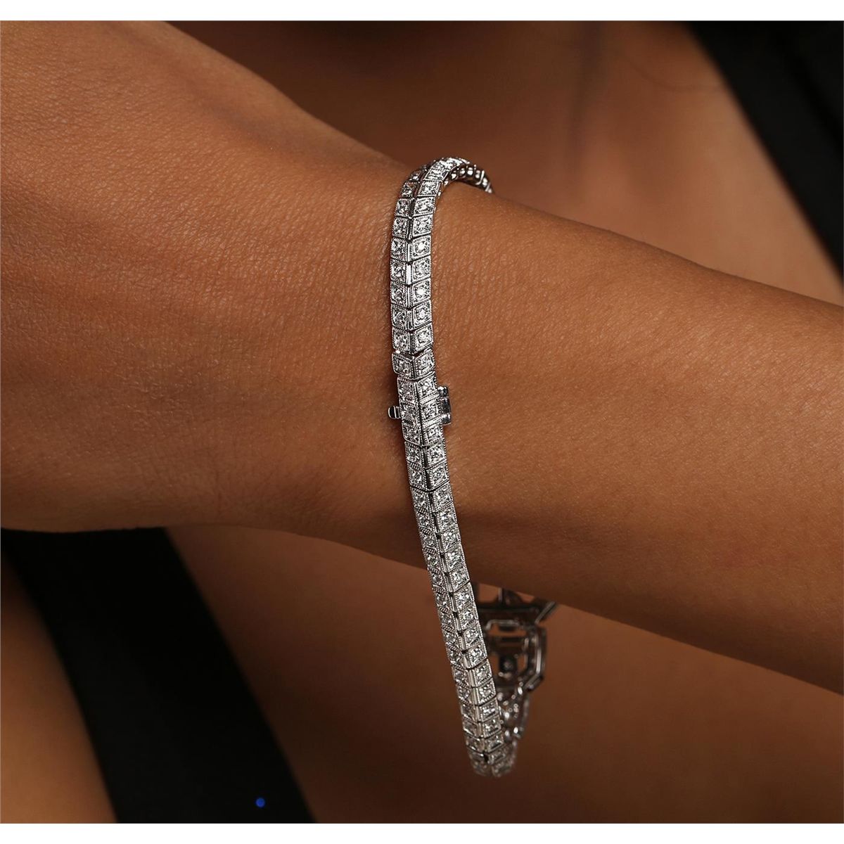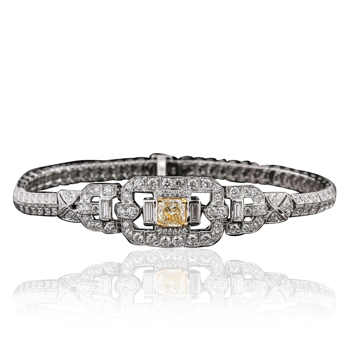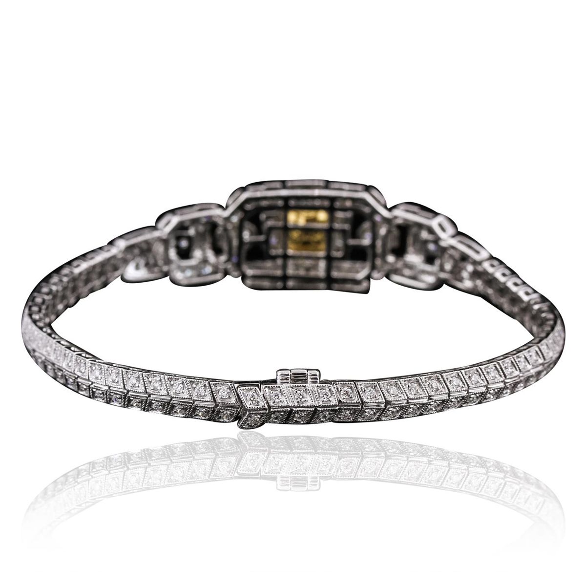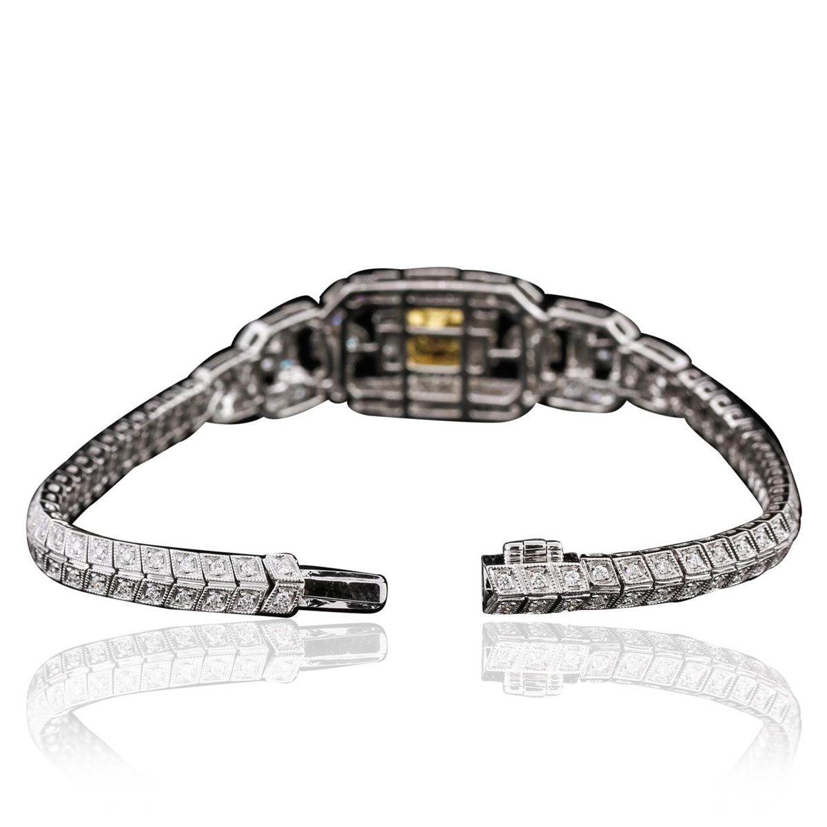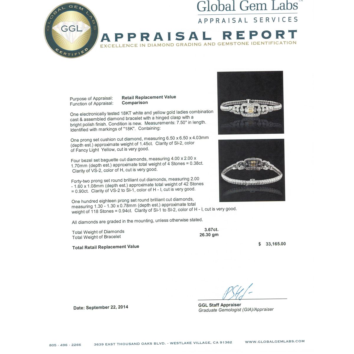 One electronically tested 18KT white and yellow gold ladies combination cast & assembled diamond bracelet with a hinged clasp with a bright polish finish. Measurements: 7.50" in length. Identified with markings of "18K". Condition is new. Containing: One prong set cushion cut diamond, measuring 6.50 x 6.50 x 4.03mm (depth est.) approximate weight of 1.45ct. Clarity: SI-2, Cut is Very Good. Four bezel set baguette cut diamonds, measuring 4.00 x 2.00 x 1.70mm (depth est.) approximate total weight of 4 Stones = 0.38ct. Clarity: VS-2. Color: H, Cut is Very Good. Forty-Two prong set round brilliant cut diamonds, measuring 2.00 - 1.60 x 1.08mm (depth est.) approximate total weight of 42 Stones = 0.90ct. Clarity: VS-2 to SI-1. Color: H - I, Cut is Very Good. One Hundred Eighteen prong set round brilliant cut diamonds, measuring 1.30 - 1.30 x 0.78mm (depth est.) approximate total weight of 118 Stones = 0.94ct. Clarity: SI-1 to SI-2. Color: H - I, Cut is Very Good. All diamonds are graded in the mounting, unless otherwise stated. Total Weight of Diamonds 3.67ct. Total Weight of Bracelet 26.30 grams. GGL Appraised at $33,165.00.