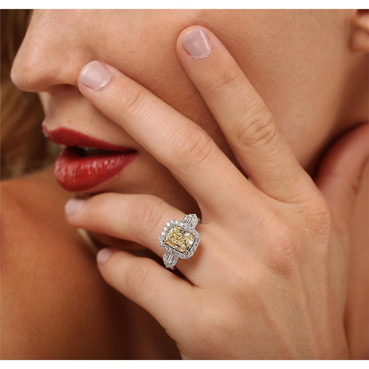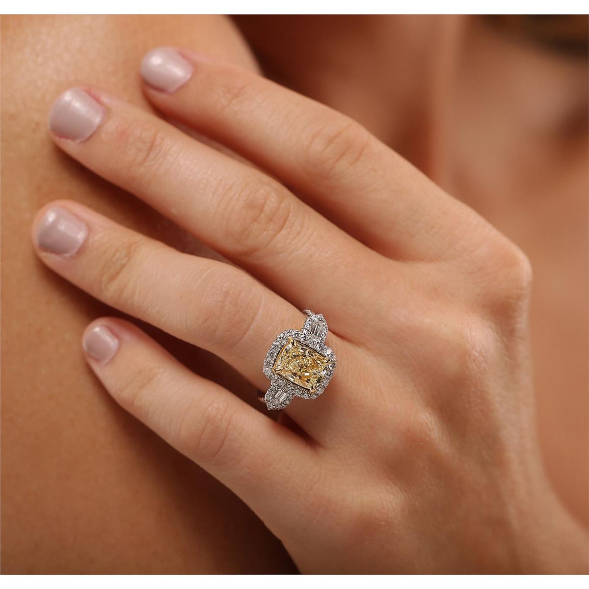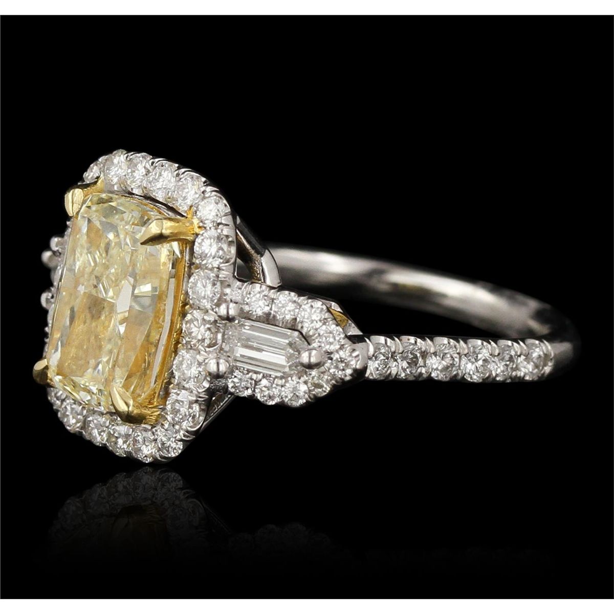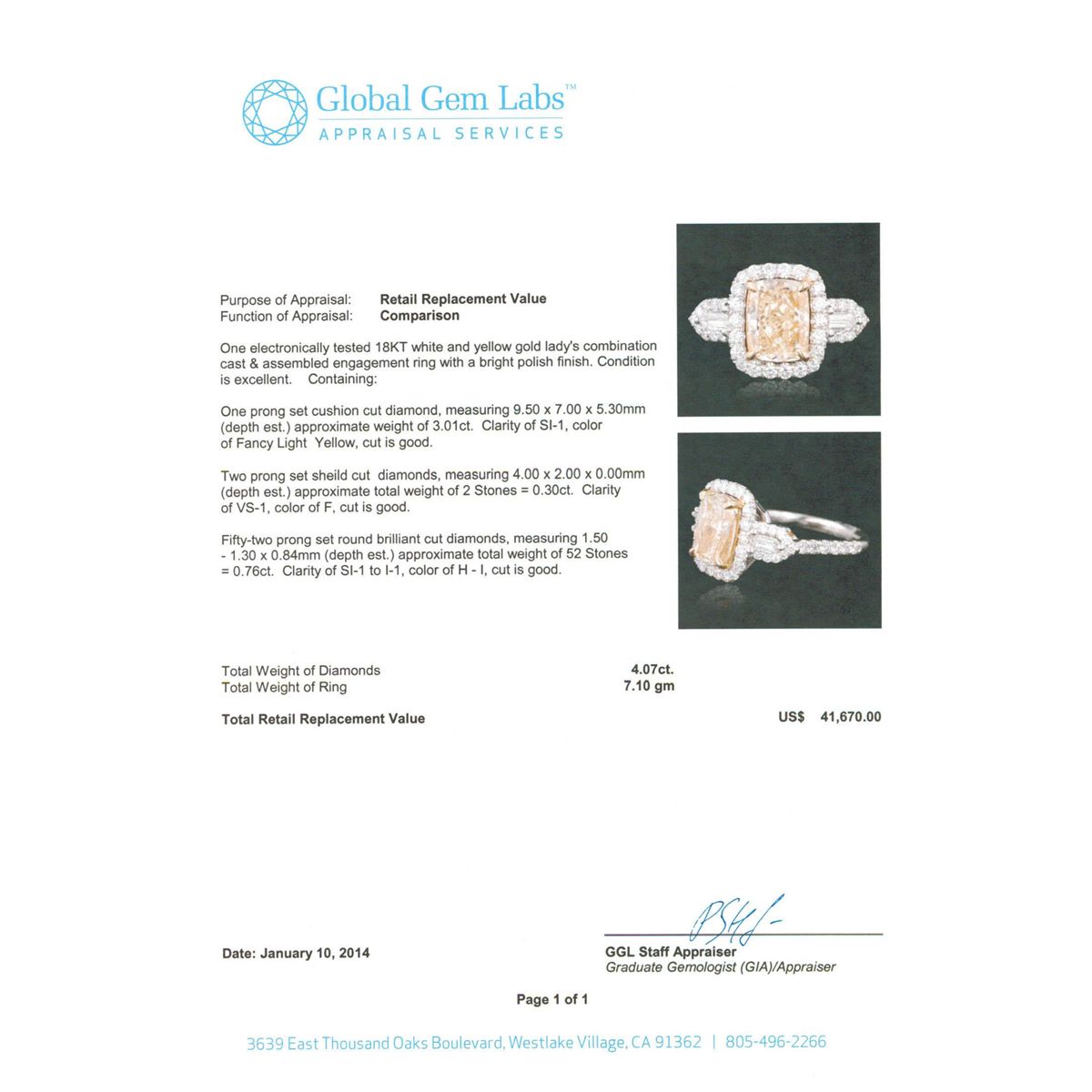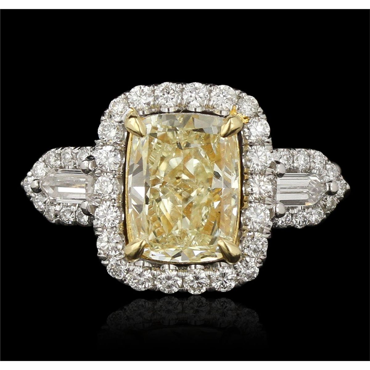 One electronically tested 18KT white and yellow gold Ladies combination cast & assembled engagement ring with a bright polish finish. Condition is excellent. Containing: One prong set cushion cut diamond, measuring 9.50 x 7.00 x 5.30mm (depth est.) approximate weight of 3.01ct. Clarity of SI-1, Cut is Good. Two prong set shield cut diamonds, measuring 4.00 x 2.00 x 0.00mm (depth est.) approximate total weight of 2 Stones = 0.30ct. Clarity of VS-1, Color of F, Cut is Good. Fifty-Two prong set round brilliant cut diamonds, measuring 1.50 - 1.30 x 0.84mm (depth est.) approximate total weight of 52 Stones = 0.76ct. Clarity of SI-1 to I-1, Color of H - I, Cut is Good. Total Weight of Diamonds 4.07ct. Total Weight of Ring 7.10gm. GGL Appraised at $41,670.00.