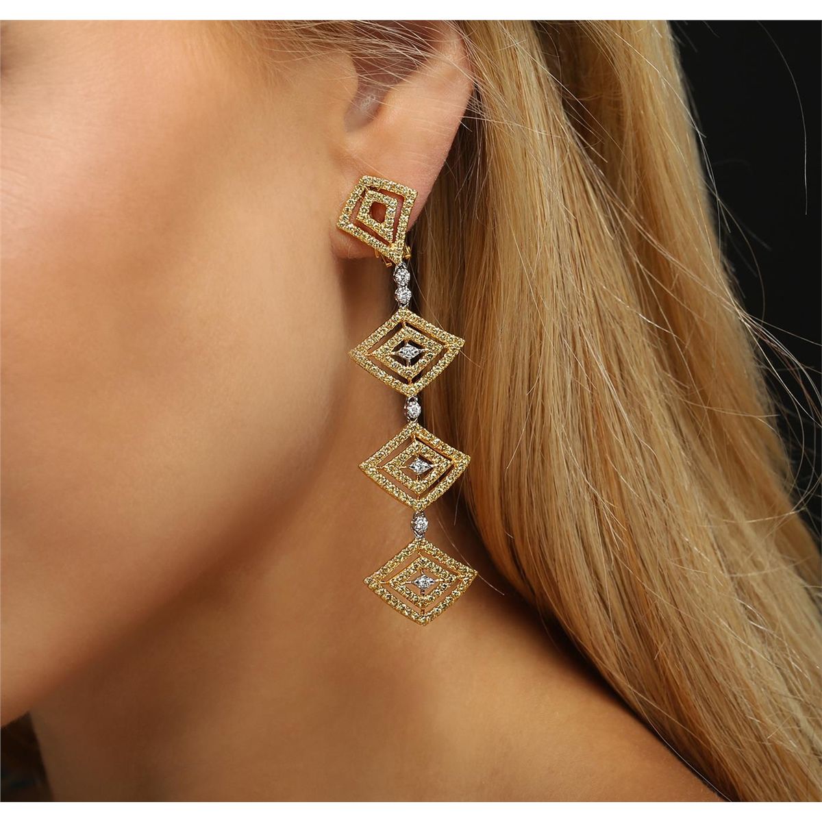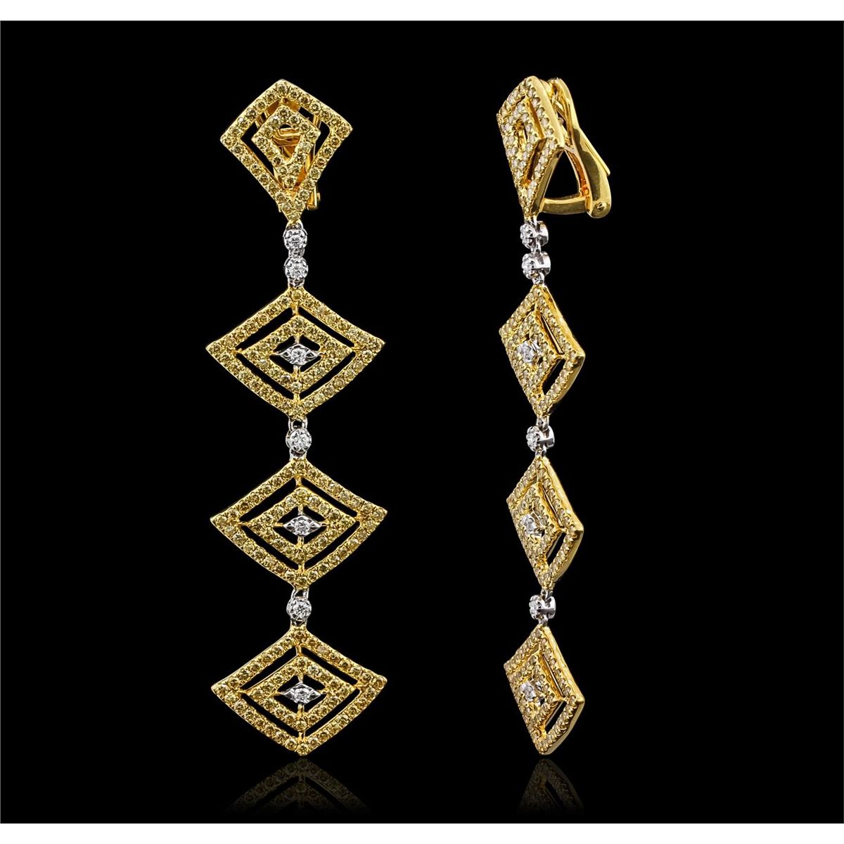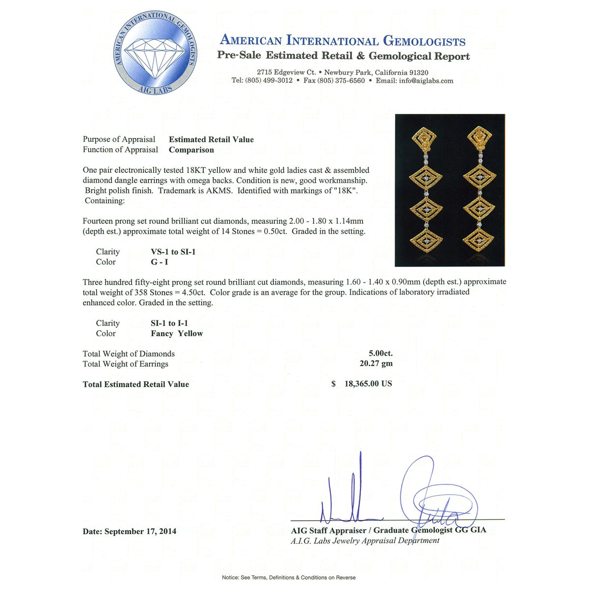 One pair electronically tested 18KT yellow and white gold ladies cast & assembled diamond dangle earrings with omega backs. Bright polish finish. Trademark is AKMS. Identified with markings of "18K". Condition is new, good workmanship. Containing: Fourteen prong set round brilliant cut diamonds, measuring 2.00 - 1.80 x 1.14mm (depth est.) approximate total weight of 14 Stones = 0.50ct. Graded in the setting. Clarity: VS-1 to SI-1. Color: G - I Three Hundred Fifty-Eight prong set round brilliant cut diamonds, measuring 1.60 - 1.40 x 0.90mm (depth est.) approximate total weight of 358 Stones = 4.50ct. Color grade is an average for the group. Indications of laboratory irradiated enhanced color. Graded in the setting. Clarity: SI-1 to I-1. Total Weight of Diamonds 5.00ct. Total Weight of Earrings 20.27gm. AIG Appraised at $18,365.00.