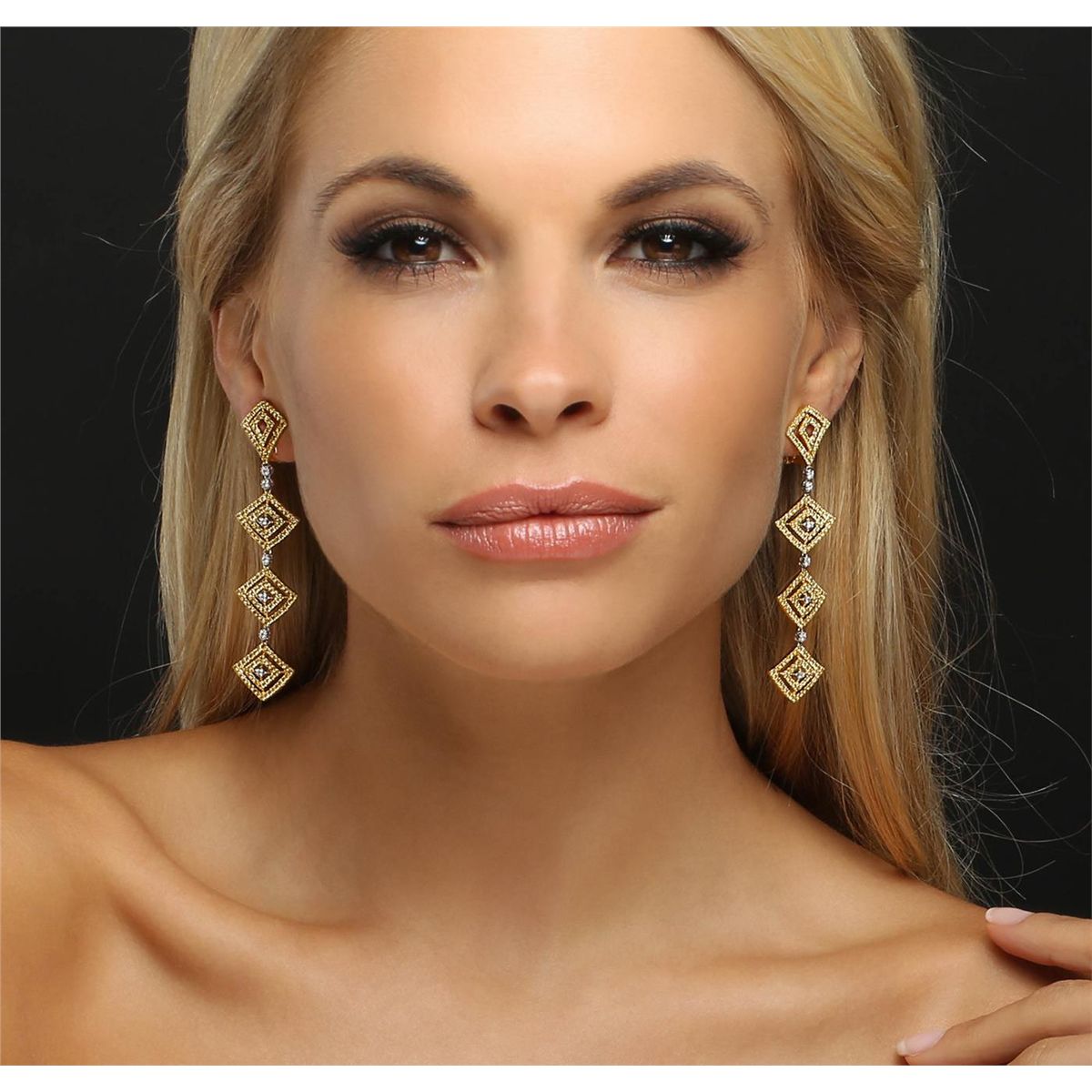 One pair electronically tested 18KT yellow and white gold ladies cast & assembled diamond dangle earrings with omega backs. Bright polish finish. Trademark is AKMS. Identified with markings of "18K". Condition is new, good workmanship. Containing: Fourteen prong set round brilliant cut diamonds, measuring 2.00 - 1.80 x 1.14mm (depth est.) approximate total weight of 14 Stones = 0.50ct. Graded in the setting. Clarity: VS-1 to SI-1. Color: G - I Three Hundred Fifty-Eight prong set round brilliant cut diamonds, measuring 1.60 - 1.40 x 0.90mm (depth est.) approximate total weight of 358 Stones = 4.50ct. Color grade is an average for the group. Indications of laboratory irradiated enhanced color. Graded in the setting. Clarity: SI-1 to I-1. Total Weight of Diamonds 5.00ct. Total Weight of Earrings 20.27gm. AIG Appraised at $18,365.00.
