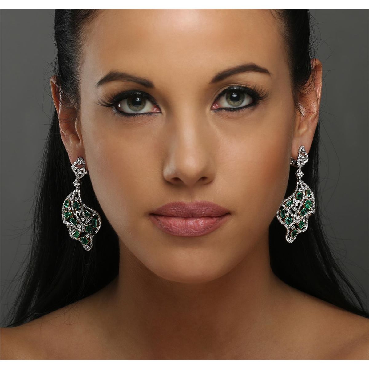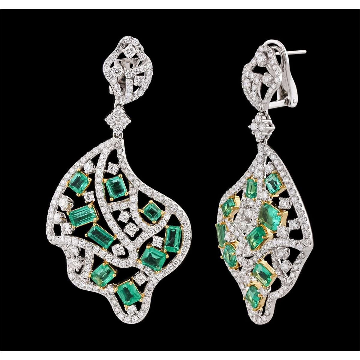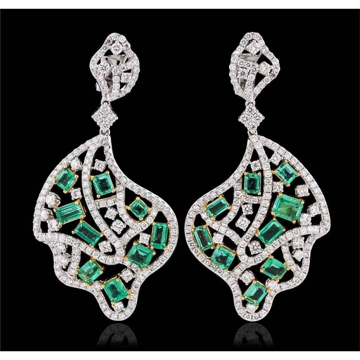 One pair electronically tested 18KT white & Yellow Gold ladies cast & assembled emerald & diamond dangle earrings with a bright finish. Two and one quarter inch over all length. Trademark is AKMS. Identified with markings of "18K". Condition is good. Containing: Eighteen prong set rectangular step cut natural emeralds, measuring 4.20 x 3.30 x 2.15mm, approximate total weight of 5.51ct., clarity is slightly included, type III, medium, moderately strong, very slightly bluish green color, (GIA vslbG 5/4), cut is good. The measurements reflect the overall average for the group. Transmitting light with no distortion, transparent. Naturally occurring internal & external characteristics are present. Graded in the setting. Three Hundred Eighteen prong set round brilliant cut diamonds, measuring 2.20 - 1.50 x 1.11mm (depth est.) approximate total weight of 318 Stones = 5.48ct. Graded in the setting. Clarity: SI-1 to I-1. Color: G - I. Total Weight of Colored Stones 5.51ct. Total Weight of Diamonds 5.48ct. Total Weight of Dangle Earrings 25.30 grams. AIG Appraised at $34,000.00.