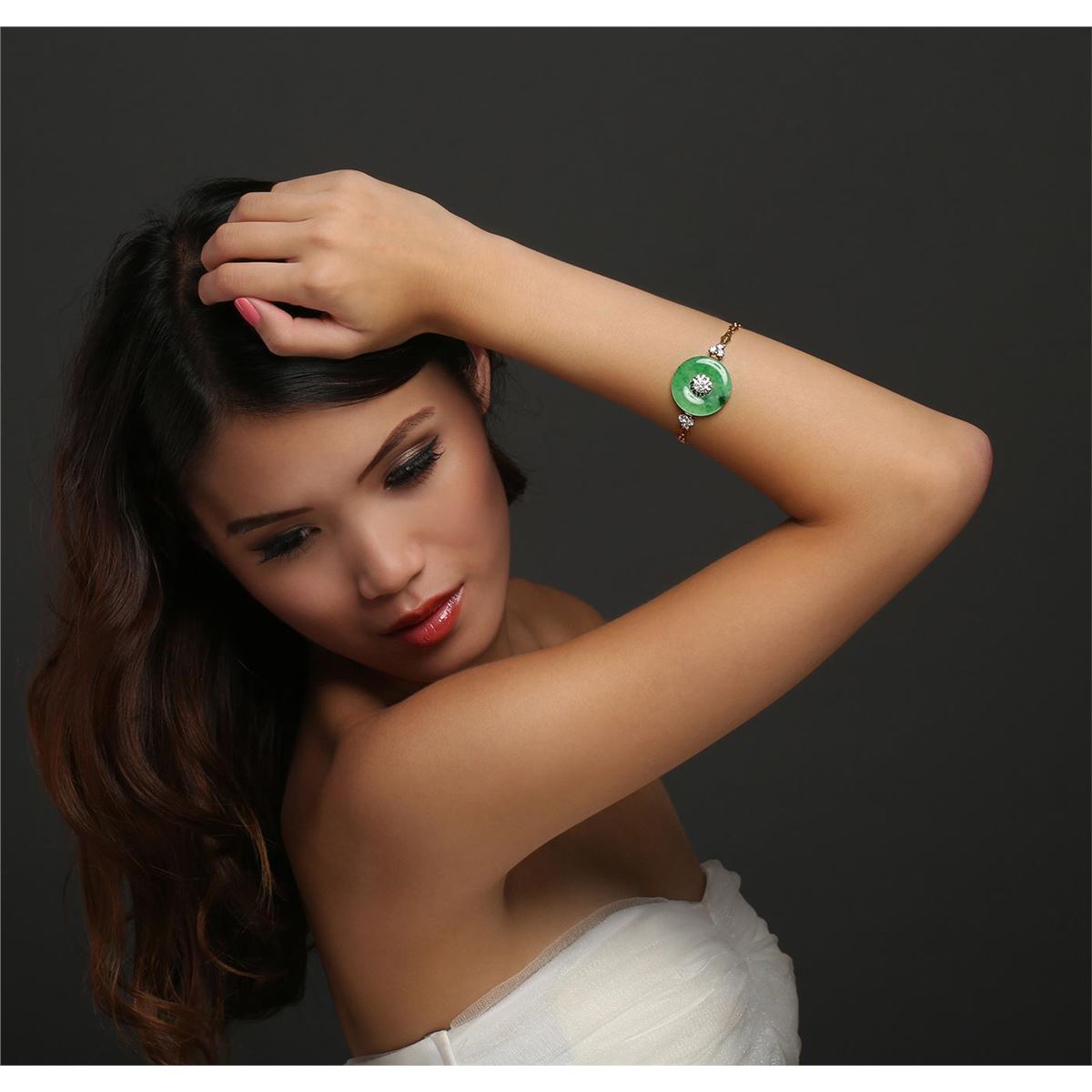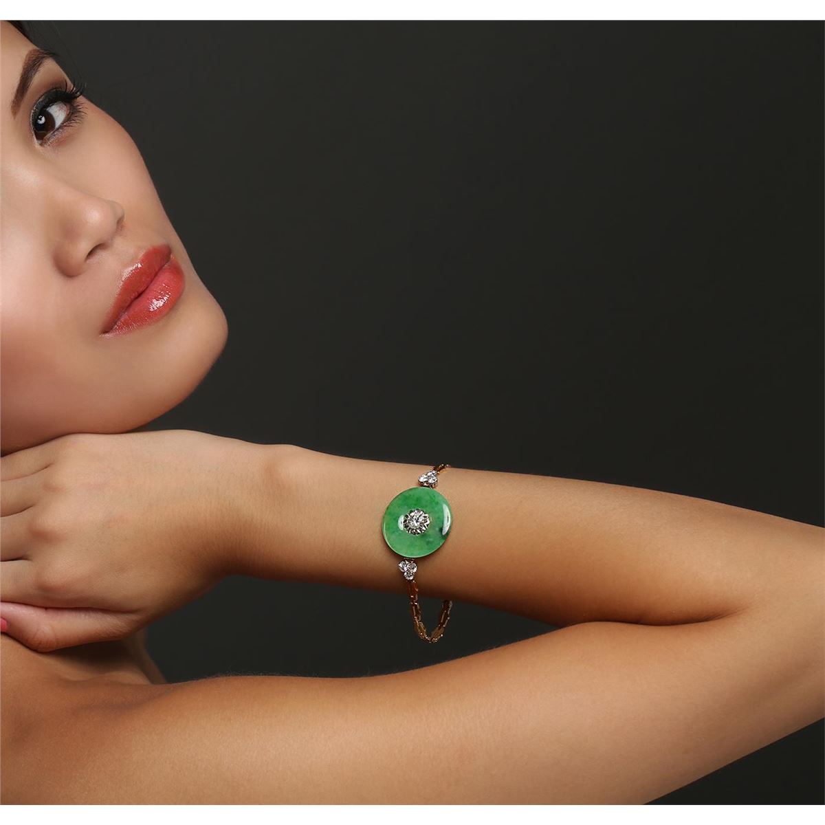 One electronically tested 18KT yellow and white gold ladies cast & assembled jadeite and diamond bracelet with a bright polish finish. Seven inch length bracelet features a jadeite donut with a diamond accent supported by a diamond trio on either side, completed by a clasp with safety. Identified with markings of "18K". Condition is good. Containing: One donut shape cabochon Jadeite, measuring (27.00 x 27.00.) 1.51mm, approximate weight 6.86ct. good dark apple green with fine medium tone, visible contrast, translucent, good proportion, good polish and good finish Transmitting light somewhat diffusely, translucent. Naturally occurring internal & external characteristics are present. Graded in the setting. Jadeite is commonly impregnated to improve the color and texture. Evidence that may confirm this is typically lacking. One prong set round brilliant cut diamond, measuring 6.25 - 6.20 x 4.00mm (depth est.) approximate weight of 1.04ct. Graded in the setting. Clarity: I-1. Color: M. Depth 64.2%. Table 62.6%. Six prong set round brilliant cut diamonds, measuring 3.60 - 3.50 x 2.13mm (depth est.) approximate total weight of 6 Stones = 1.08ct. Graded in the setting. Clarity: SI-2 to I-1. Color: H - J. Total Weight of Diamonds 2.12ct. Total Weight of Jade 6.86ct. Total Weight of Bracelet 17.31 grams. AIG Appraised at $18,100.00.