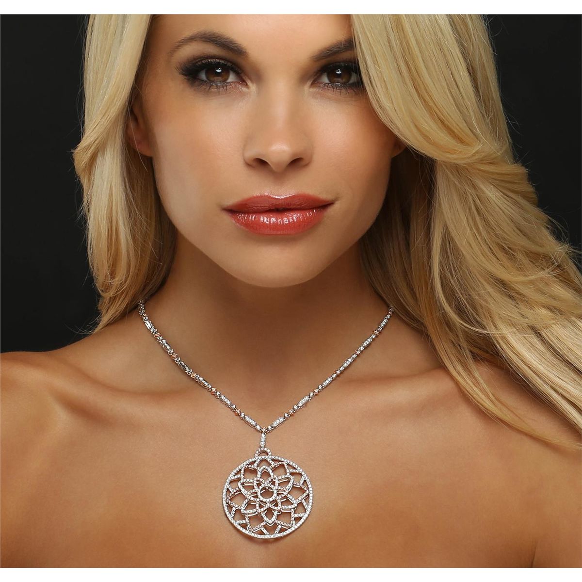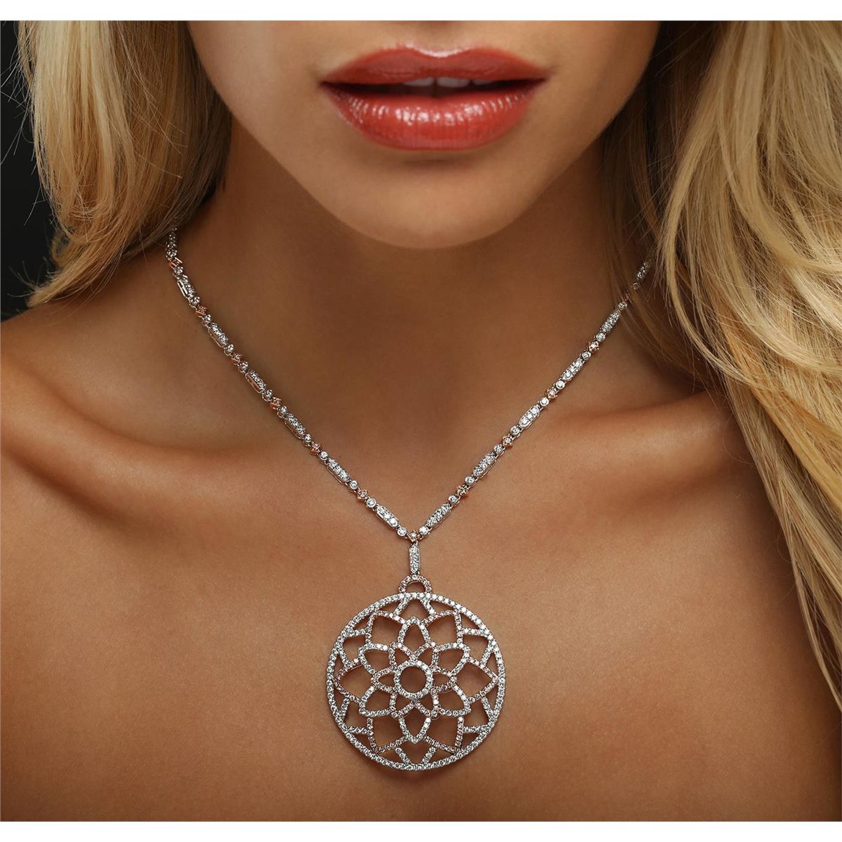 One electronically tested 18KT white & rose gold ladies cast & assembled diamond necklace with a bright finish. The necklace features a forty five millimeter diameter disk set throughout with ribbons of diamonds. The disk pendant is supported by a twenty two inch length diamond set neck chain. Identified with markings of "18K". Condition is good. Containing: Three Hundred Sixty-Five prong set round brilliant cut diamonds, measuring 1.70 - 1.50 x 0.99mm (depth est.) approximate total weight of 365 Stones = 6.40ct. Graded in the setting. Clarity: VS-2 to SI-2. Color: G - H One Hundred Fifty-Four prong set round brilliant cut diamonds, measuring 1.45 - 1.40 x 0.86mm (depth est.) approximate total weight of 154 Stones = 1.98ct. Graded in the setting. Clarity: SI-1 to I-1. Total Weight of Diamonds 8.38ct. Total Weight of Necklace 34.91 grams. AIG Appraised at $38,900.00.