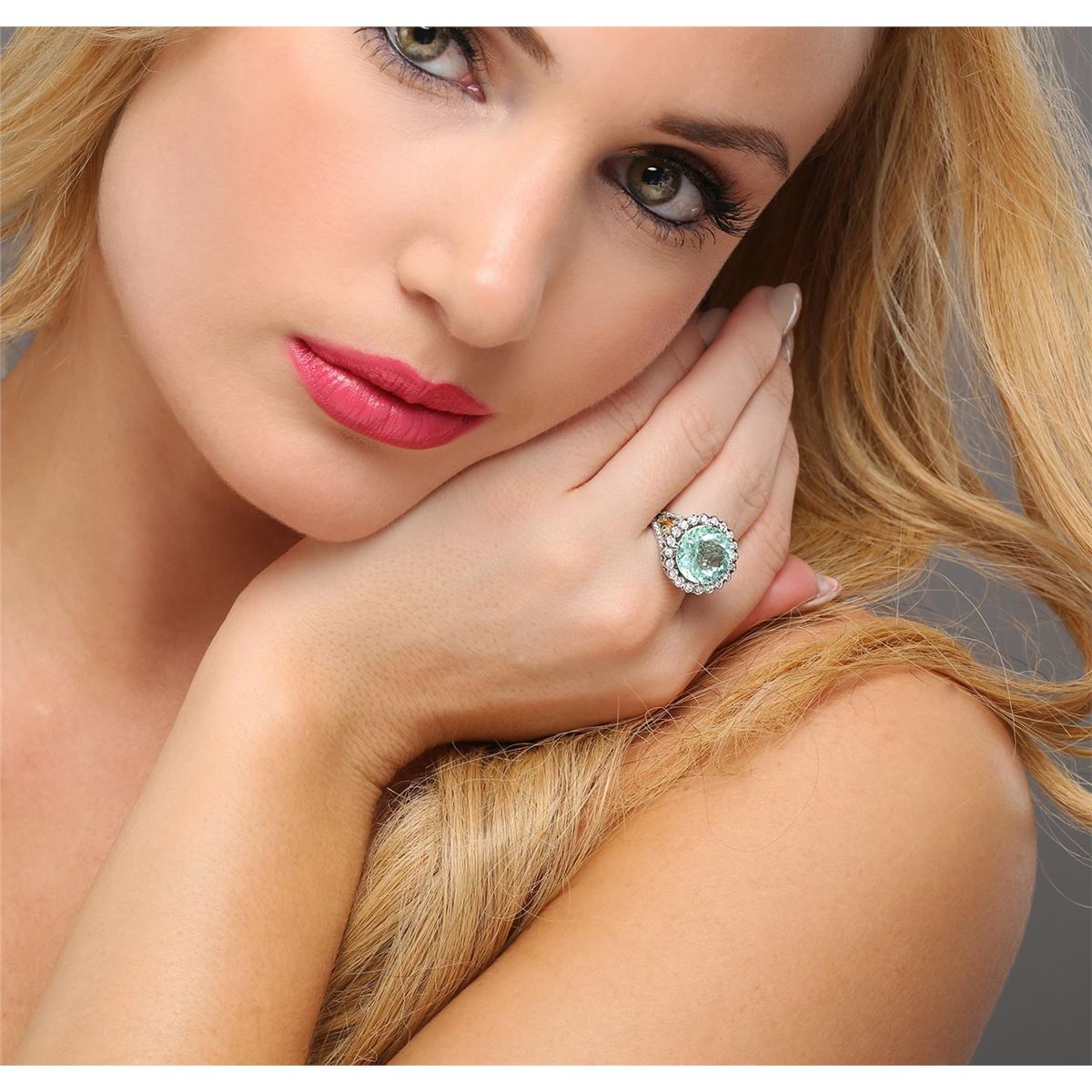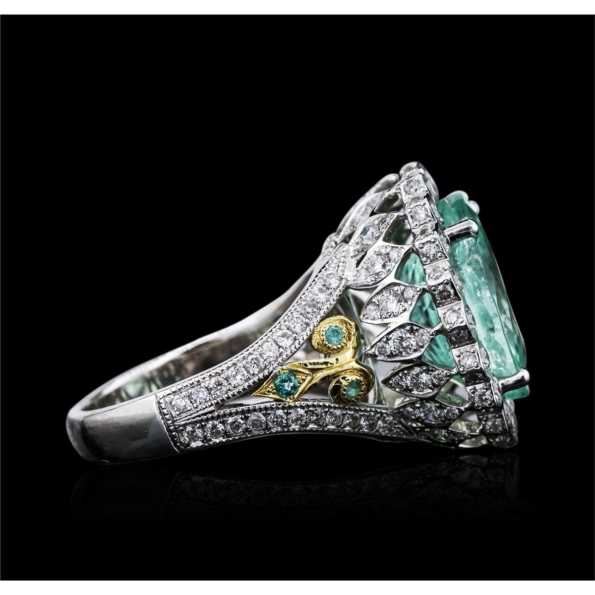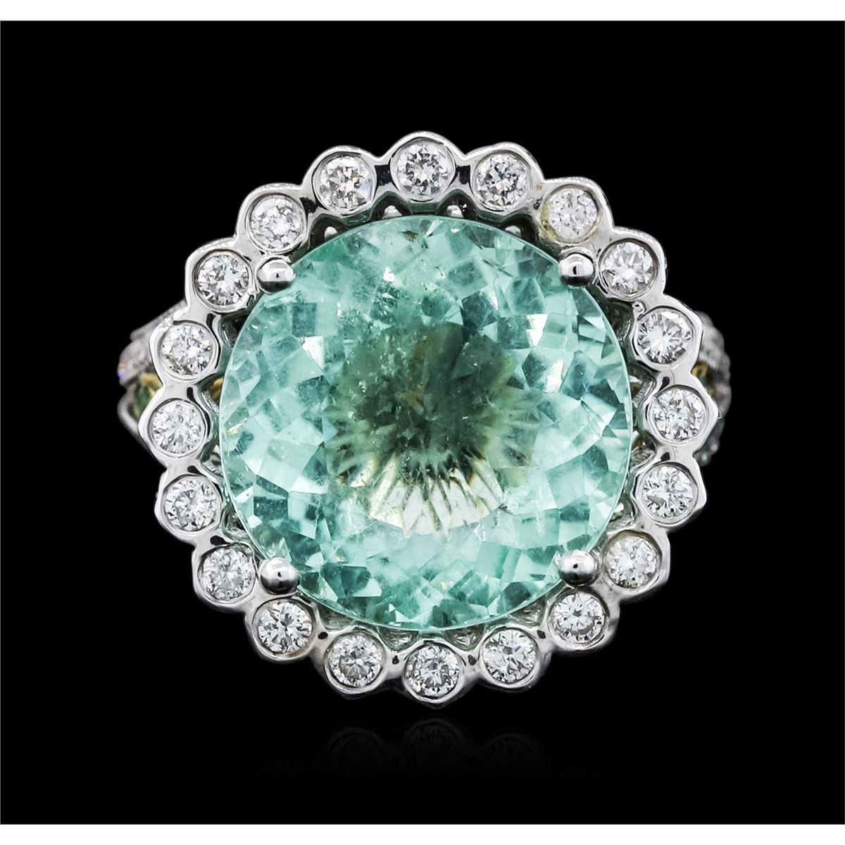 One electronically tested 18KT white and yellow gold ladies combination cast & assembled tourmaline and diamond ring with a bright polish finish. Identified with markings of "18K". Condition is new. Containing: One prong set round modified mixed cut natural paraiba tourmaline, measuring 12.98 - 13.02 x 8.45 mm, approximate weight of 8.71ct., clarity is moderately included, light, very slightly grayish, bluish green color, (GIA bG 3/3), cut is good. One Hundred Forty-Eight prong set round brilliant cut diamonds, measuring 1.50 - 1.00 x 0.75mm (depth est.) approximate total weight of 148 Stones = 1.05ct. Clarity: SI-2 to I-2. Color: I - J, Cut is Good.  Six bead set round modified brilliant cut natural paraiba tourmalines, measuring 1.30 - 1.30 x 0.85 mm, approximate total weight of 0.06ct., clarity is heavily included, medium light, moderately strong, bluish green color, (GIA bG 4/4), cut is good. Colored gemstones are presumed to have been subjected to commonly used enhancement processes. All diamonds and colored gemstones are graded in the mounting, unless otherwise stated. Total Weight of Colored Stones 8.77ct. Total Weight of Diamonds 1.05ct. Total Weight of Ring 9.10 grams. GGL Appraised at $39,165.00.