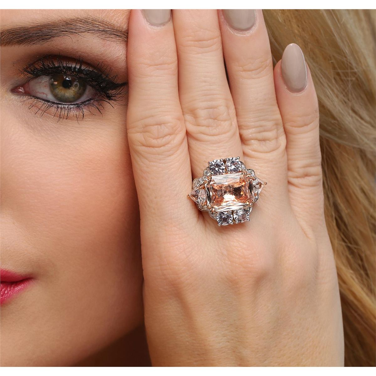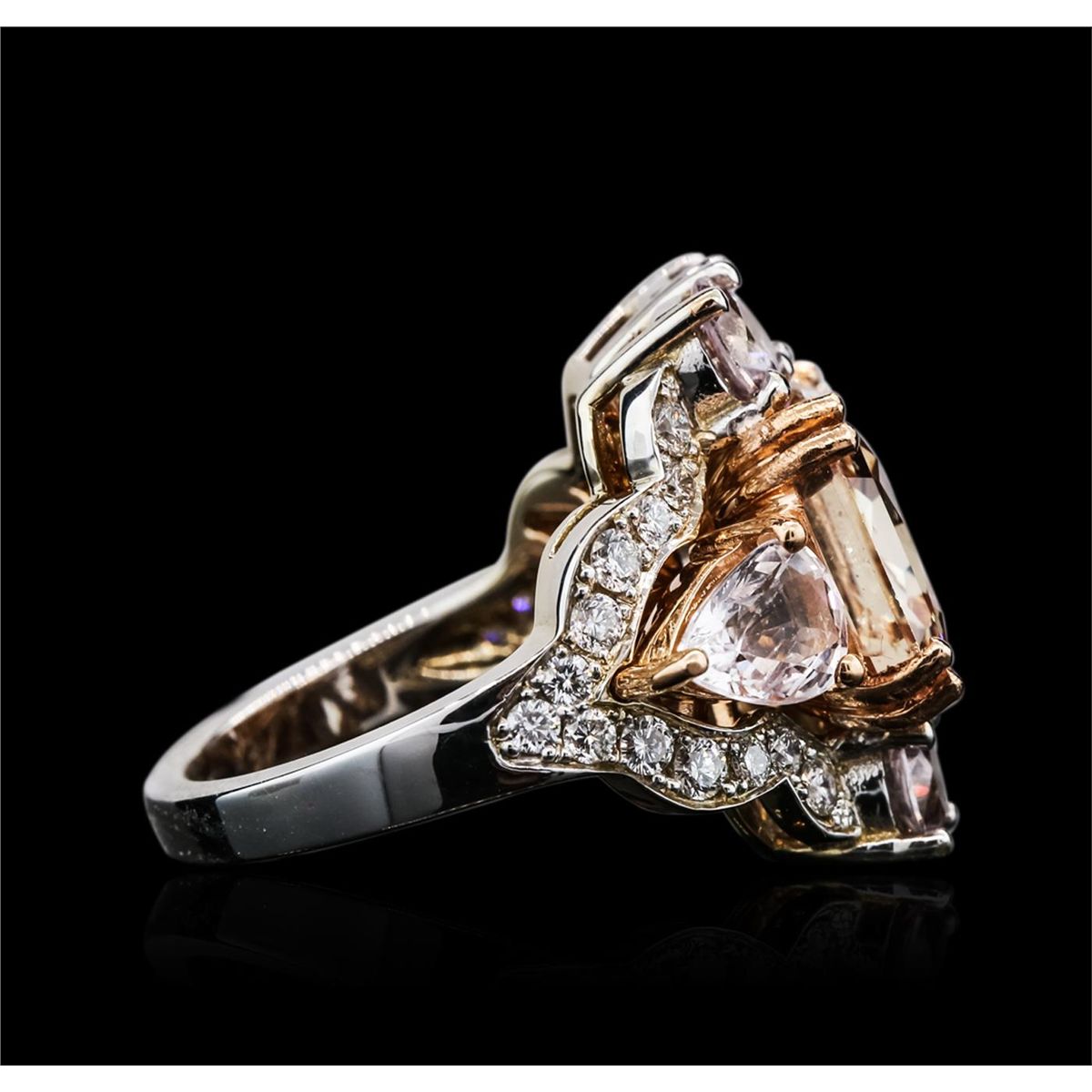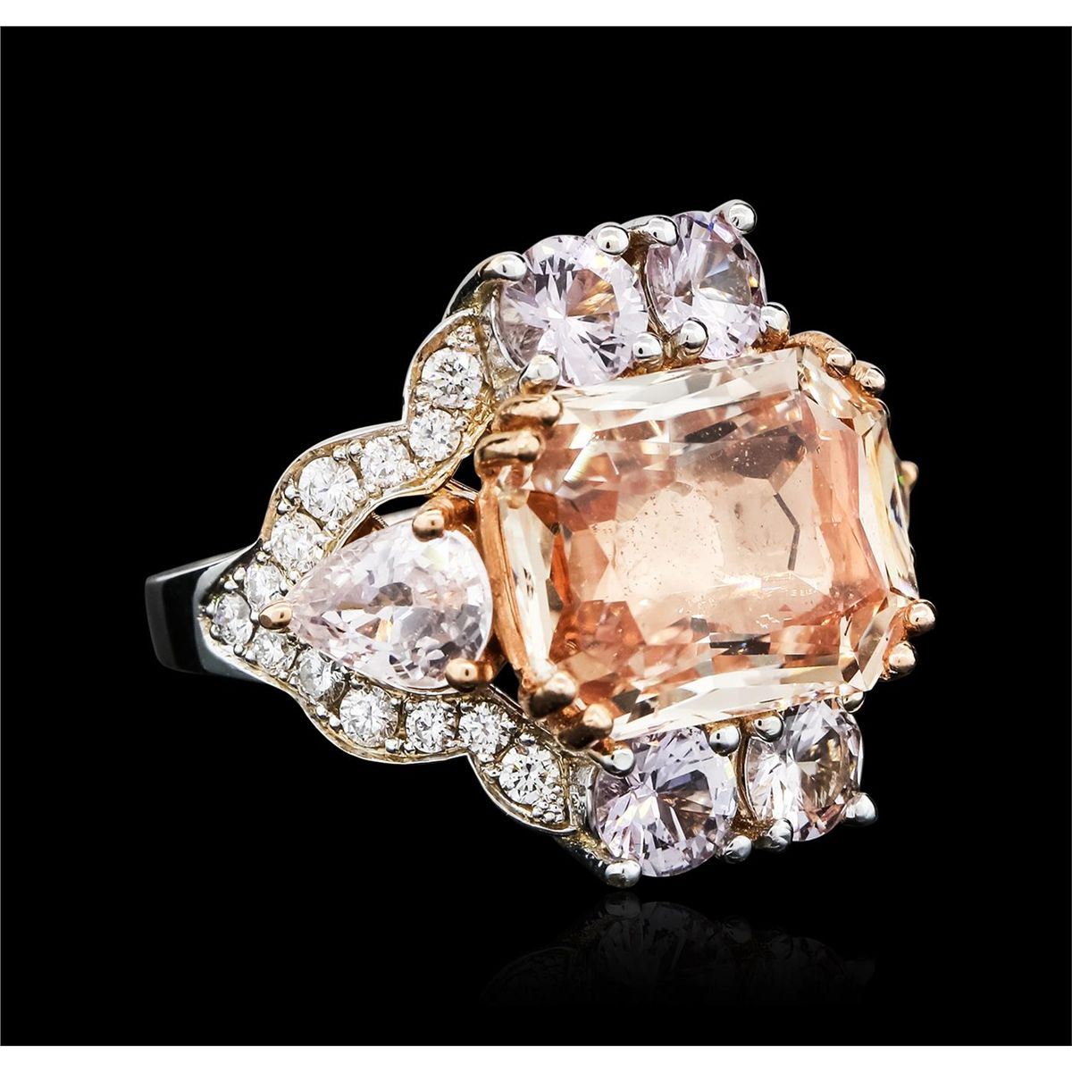 One electronically tested 18KT white and rose gold ladies cast & assembled multi color sapphire and diamond ring with a bright polish finish. The featured orange sapphire is supported by a stylized white sapphire and diamond bezel, completed by a two and one-half millimeter wide band. Identified with markings of "18K". Condition is new, good workmanship. Containing: One prong set octagonal modified brilliant cut natural orange sapphire, measuring 14.97 x 11.34 x 6.00mm, 6%. bulge factor, approximate weight of 11.23ct., clarity is slightly included, type II, medium, slightly brownish, orange color, (GIA O 5/2), cut is good. Transmitting light with a minimum of distortion, transparent. Naturally occurring internal & external characteristics are present. GIA Gemological Report attached. Graded mounted in the GIA Laboratory, Report #2161470950.Two prong set pear brilliant cut natural white sapphires, measuring 7.00 x 5.30 x 3.00mm, approximate total weight of 1.88ct., clarity is slightly included, colorless, very slightly grayish, white color, (GIA W 0/3), cut is good. Transmitting light with a minimum of distortion, transparent. Naturally occurring internal & external characteristics are present. Measurements & the color grade are an average for the pair. Graded in the setting. Four prong set round brilliant cut natural white sapphires, measuring 5.10 - 5.00 x 2.30 mm, approximate total weight of 2.02ct., clarity is slightly included, colorless, very slightly grayish, white color, (GIA W 0/3), cut is good. Transmitting light with a minimum of distortion, transparent. Naturally occurring internal & external characteristics are present. Color grade is an average for the group. Graded in the setting. Twenty-Six bead set round brilliant cut diamonds, measuring 1.90 - 1.80 x 1.11mm (depth est.) approximate total weight of 26 Stones = 0.70ct. Graded in the setting. Clarity: VS-1 to SI-1. Color: G - I. Total Weight of Colored Stones 15.13ct. Total Weight of Diamonds 0.70ct. Total Weight of Ring 14.99 grams. AIG Appraised at $47,490.00.