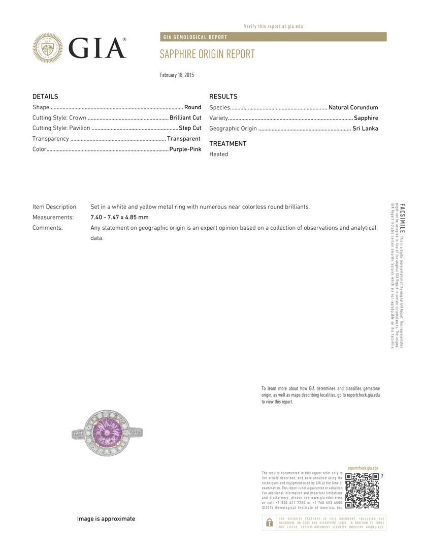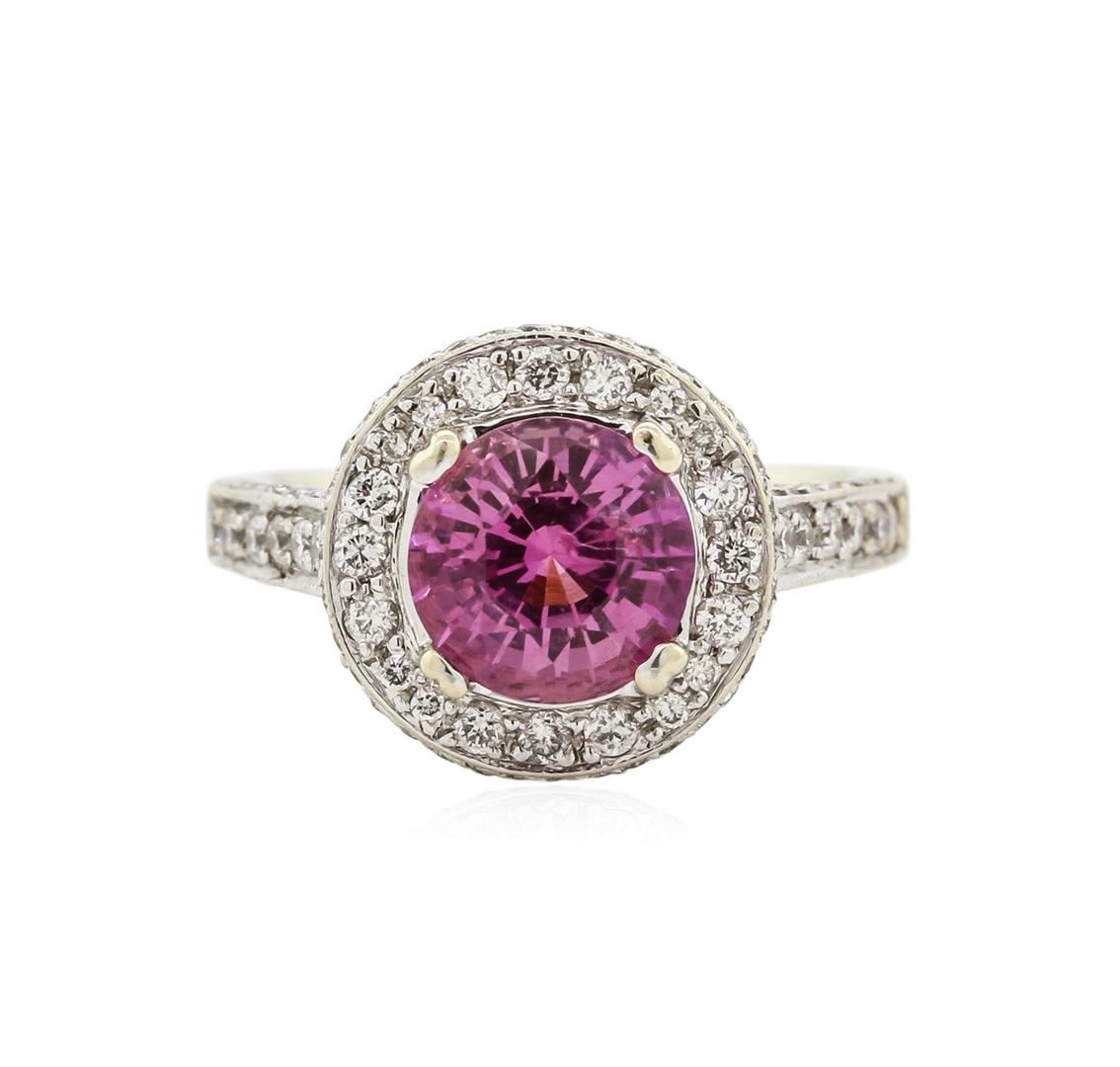 One electronically tested 18KT white and yellow gold ladies cast sapphire and diamond ring with a bright polish finish. Identified with markings of "18K". Condition is very good. Containing: One prong set round modified brilliant cut natural pink sapphire, measuring 7.40 - 7.47 x 4.85 mm, approximate weight of 2.12ct., clarity is eye clean, type II, medium light, very slightly grayish, purple red color, (GIA PR 4/3), cut is good. GIA report: 6177010915.One Hundred Thirty-Four prong set round brilliant cut diamonds, measuring 1.40 - 1.10 x 0.75mm (depth est.) approximate total weight of 134 Stones = 0.95ct. Clarity: SI-2 to I-1. Color: H - I, Cut is Good. Colored gemstones are presumed to have been subjected to commonly used enhancement processes. All diamonds and colored gemstones are graded in the mounting, unless otherwise stated. Total Weight of Colored Stones 2.12ct. Total Weight of Diamonds 0.95ct. Total Weight of Ring 5.80 grams. GGL Appraised at $7,370.00.