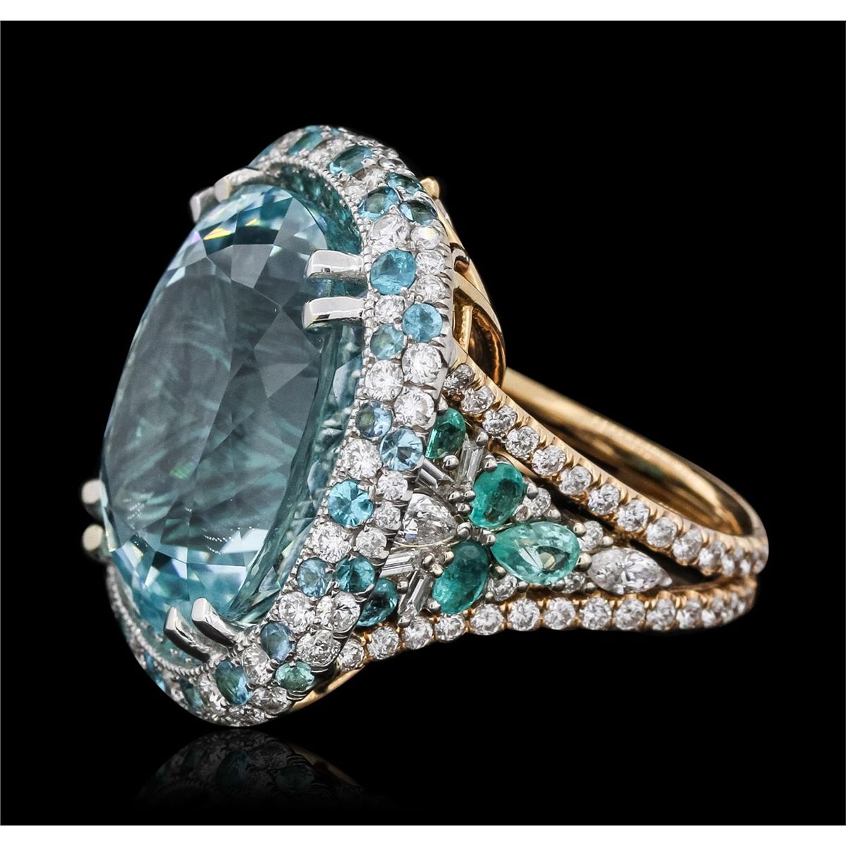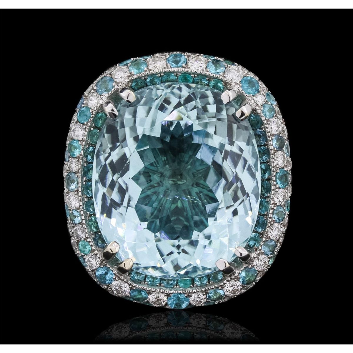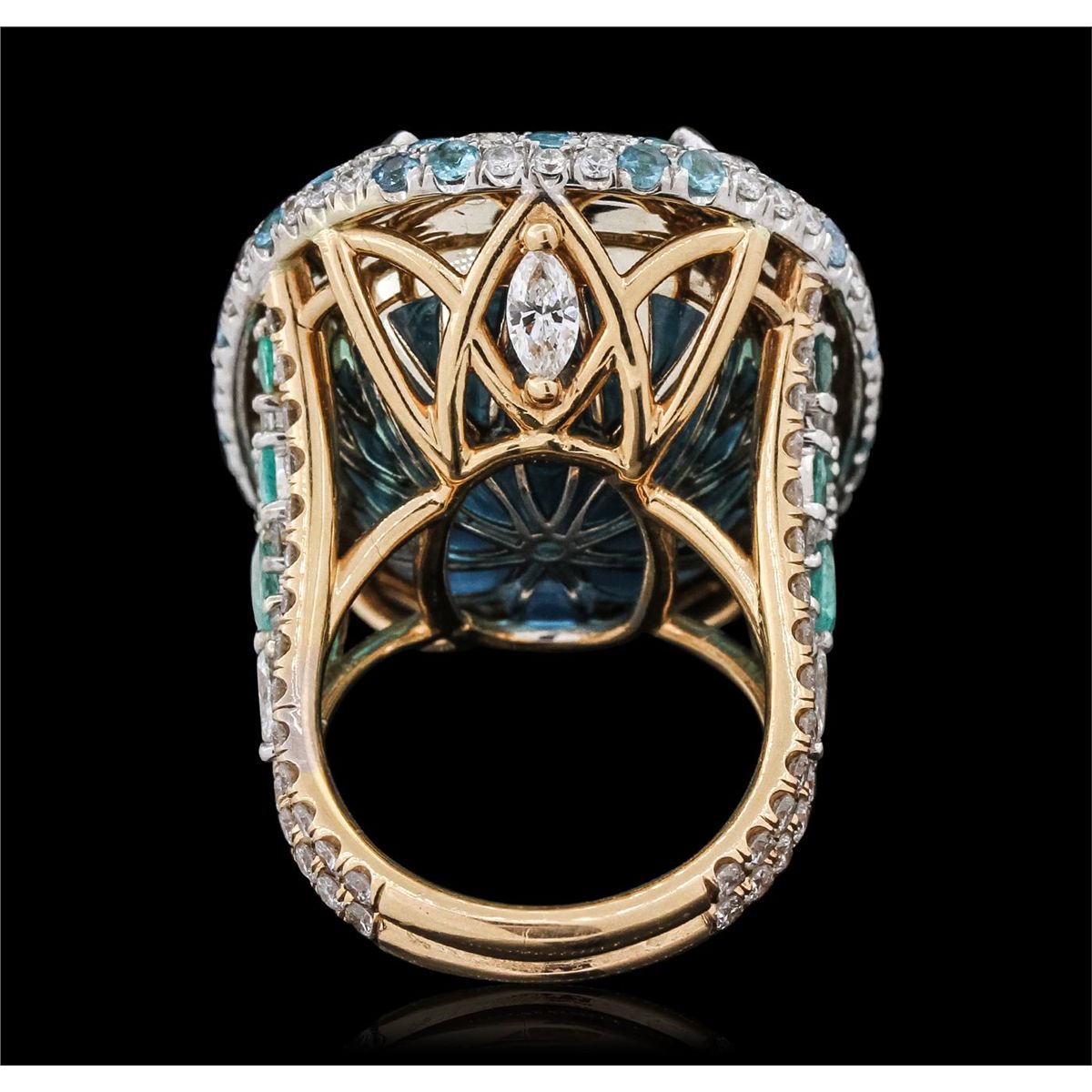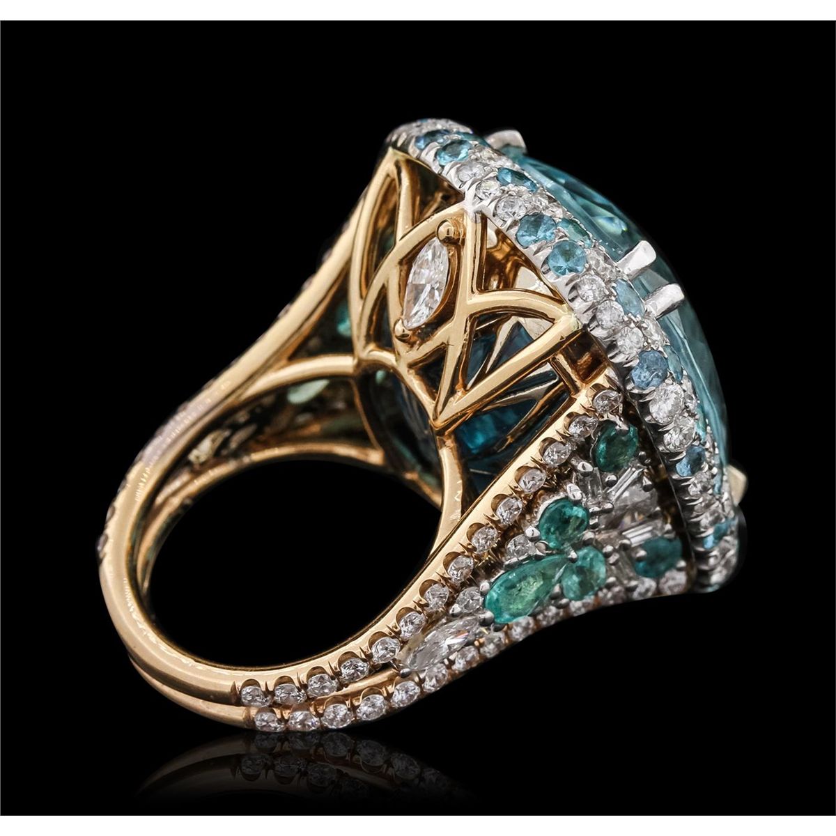 One polished, stamped, and tested 18K yellow & white gold ring mounted with: 1 genuine Paraiba tourmaline center stone weighing 37.07 carat, 74 adjacent genuine Paraiba tourmalines weighing 2.52 carats, and 129 genuine diamonds weighing 3.03 carats. This item weighs 30.2 grams, condition is new, excellent workmanship. Main gemstone - GIA Report No.: 1156268006. Identity: Paraiba tourmaline. Species: natural tourmaline. Shape: oval. Cutting style: modified brilliant cut. Measurements: 22.23 x 18.98 x 12.33 mm. Weight: 37.07 carat. Color: greenish blue. Cut grade: excellent. Adjacent gemstones on ring - Identity: Paraiba tourmaline. Species: natural tourmaline. Shape: pear/oval/round. Quantity: 74 tourmalines. Measurements: 1.8 - 2.5 mm (68 round); 5 x 3 mm (2 pear); 4 x 3 mm (4 oval). Total weight: 2.52 carats. Color: greenish blue. Adjacent gemstones on ring - Identity: natural diamond. Cut - baguette/marquise/pear/round. Quantity: 129 diamonds. Total weight: 3.03 carats. Clarity grade: VS1-SI2. Color grade: G-H. Refractive index: 2.418. Hardness: 10. Paraiba Tourmaline Weight: 39.59cts. Diamond Weight: 3.03cts. Weight of Item: 30.2 grams. Gold Content: 18K yellow & white gold. AIGLAppraised at $510,350.00.