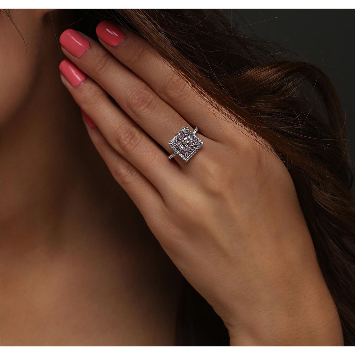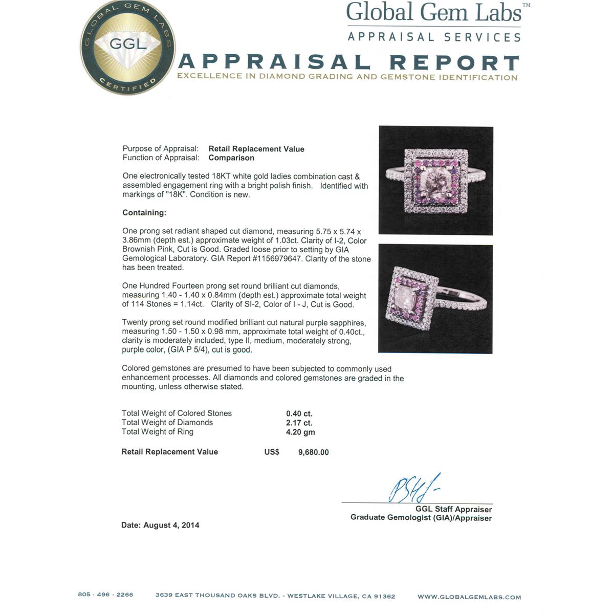 One electronically tested 18KT white gold ladies combination cast & assembled engagement ring with a bright polish finish. Condition is new. Identified with markings of "18K". Containing: One prong set radiant shaped cut diamond, measuring 5.75 x 5.74 x 3.86mm (depth est.) approximate weight of 1.03ct. Clarity: I-2, Color is Brownish Pink, Cut is Good. Graded loose prior to setting by GIA Gemological Laboratory GIA Report #1156979647. Clarity of the stone has been treated. One Hundred Fourteen prong set round brilliant cut diamonds, measuring 1.40 - 1.40 x 0.84mm (depth est.) approximate. Total Weight of 114 Stones = 1.14ct. Clarity: SI-2. Color: I - J, Cut is Good. Twenty prong set round modified brilliant cut natural purple sapphires, measuring 1.50 - 1.50 x 0.98 mm, approximate. Total Weight of 0.40ct., clarity is moderately included, type II, medium, moderately strong, purple color, (GIA P 5/4), cut is good. Colored gemstones are presumed to have been subjected to commonly used enhancement processes. All diamonds and colored gemstones are graded in the mounting, unless otherwise stated. Total Weight of Colored Stones 0.40ct. Total Weight of Diamonds 2.17ct. Total Weight of Ring 4.20 grams. GGL Appraised at $9,680.00.