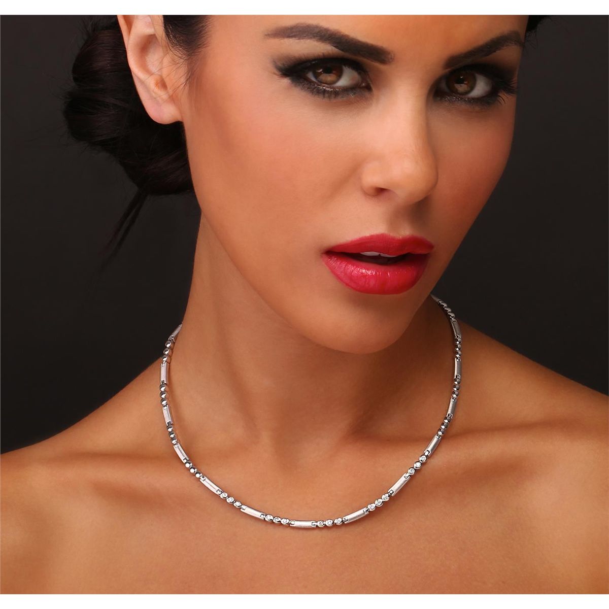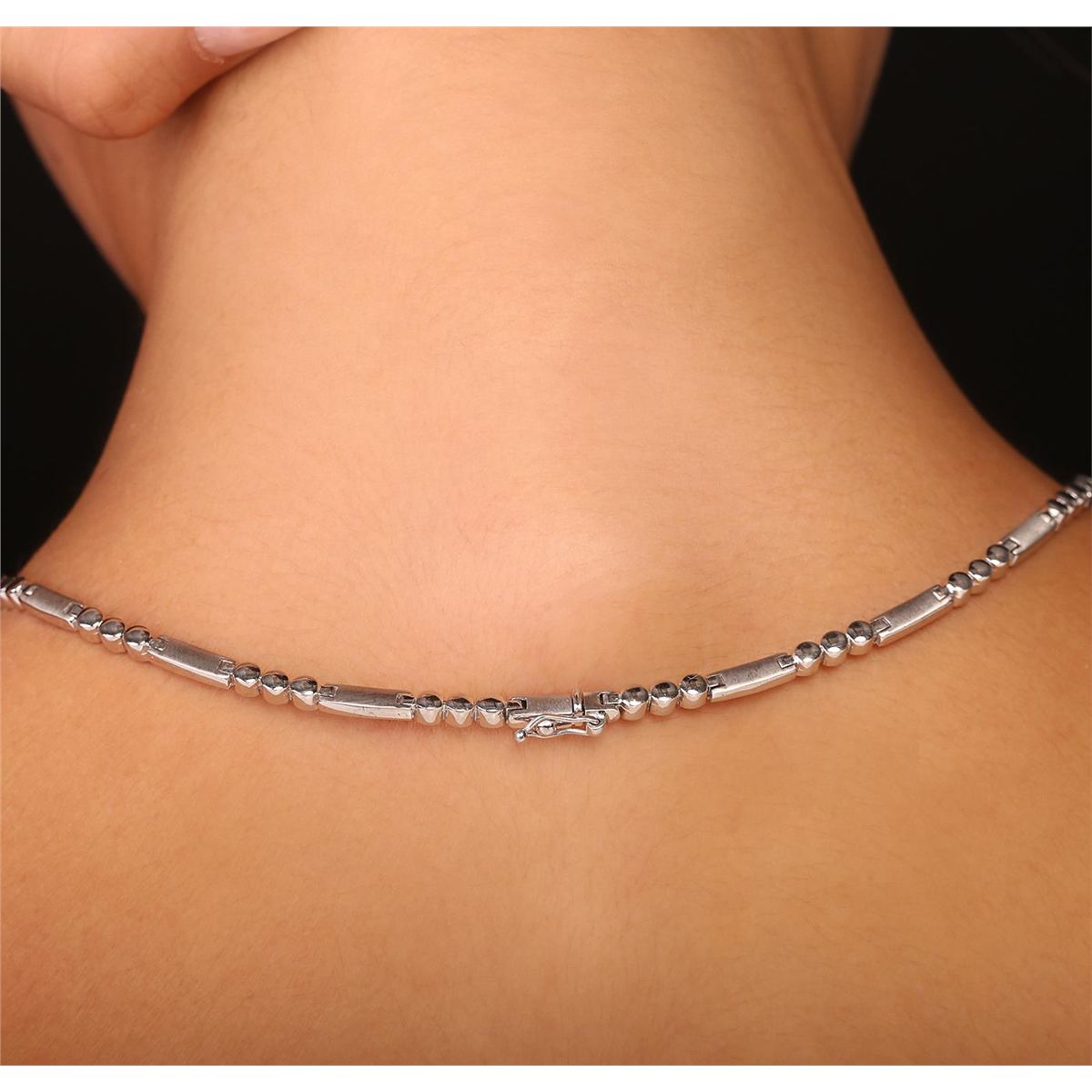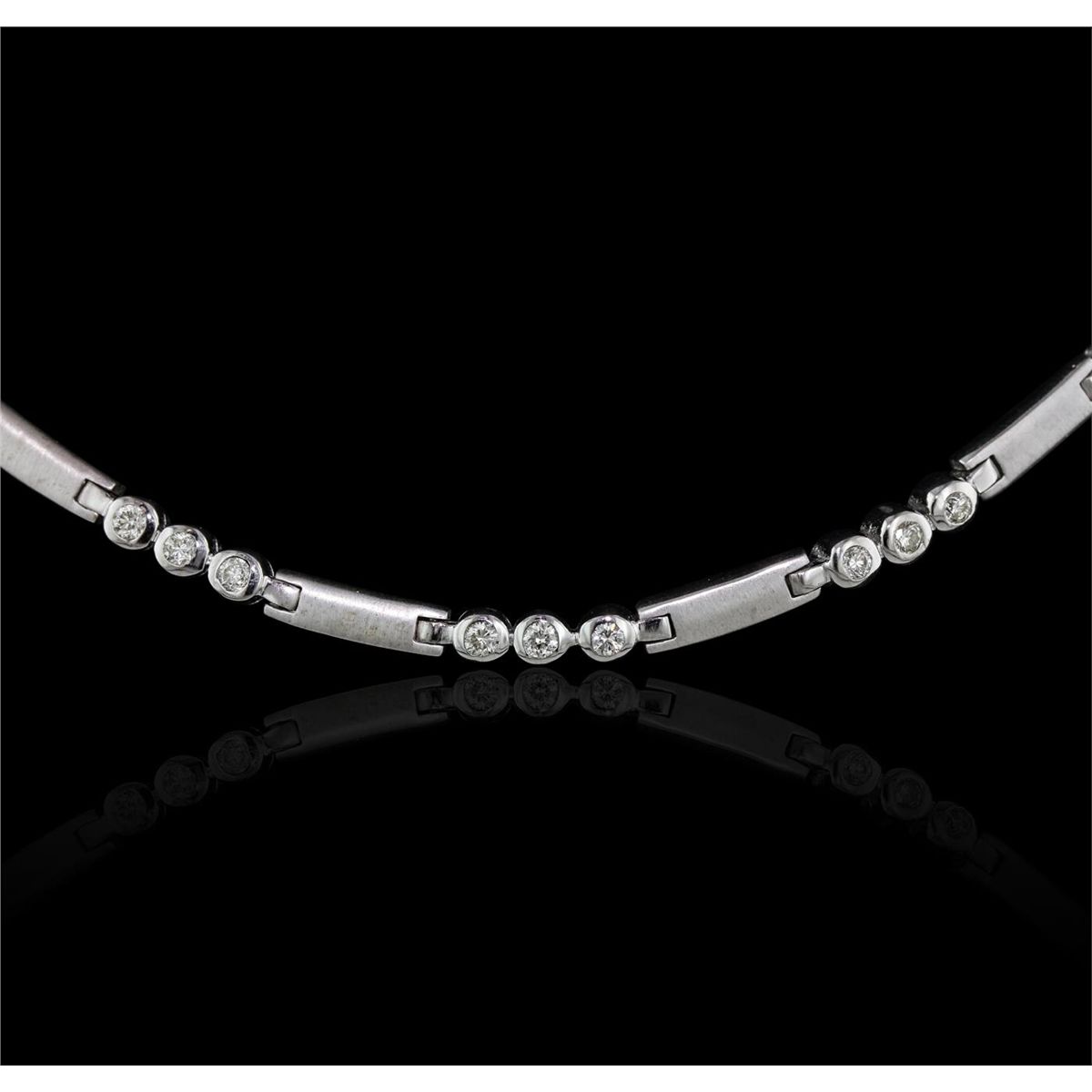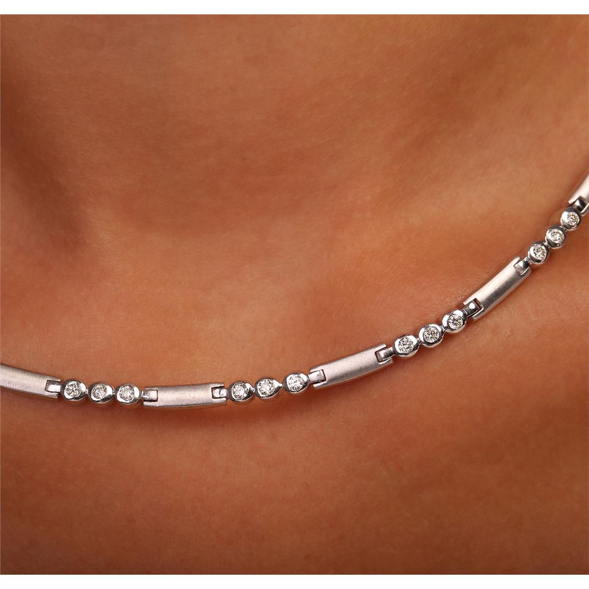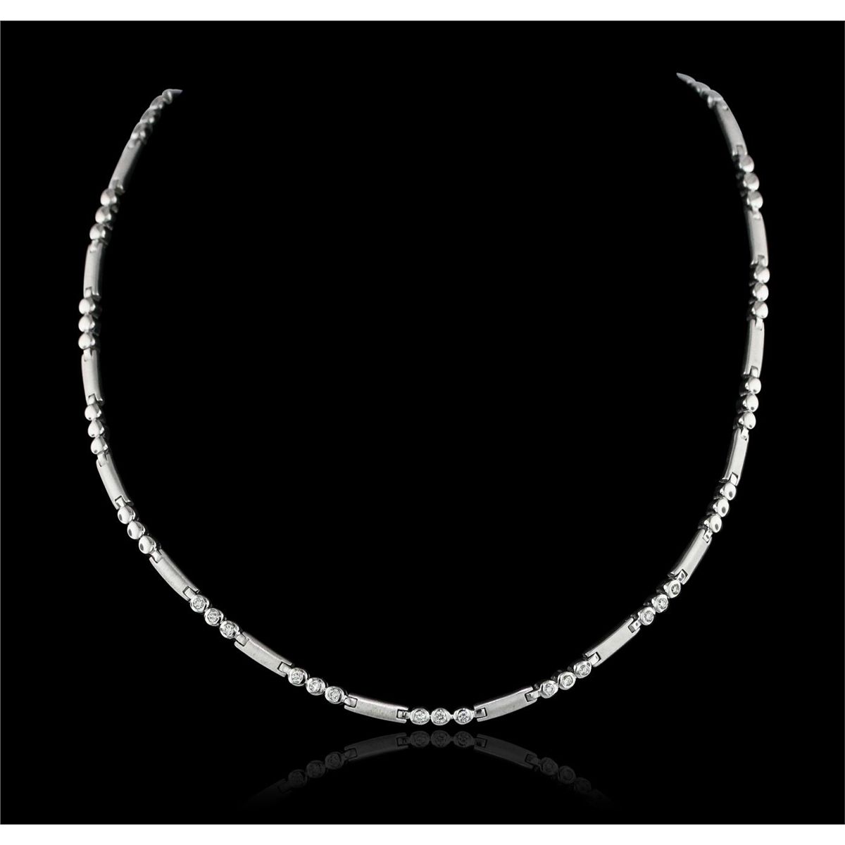One electronically tested 18KT white gold Ladies combination cast & assembled necklace with a hidden box clasp with a bright polish finish. Condition is very good. Measurements: 17" in length. Identified with markings of "750". Containing: Fifteen bezel set round brilliant cut diamonds, measuring 2.00 - 2.00 x 1.20mm (depth est.) approximate. Total Weight of 15 Stones = 0.44ct. Clarity: SI-2 to I-1. Color: K - L, Cut is Good. Diamonds graded in the mounting. Total Weight of Diamonds 0.44ct. Total Weight of Necklace 30.30 grams. GGL Appraised at $7,810.00.