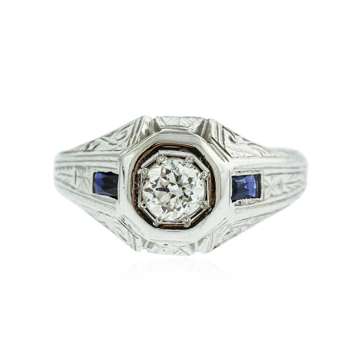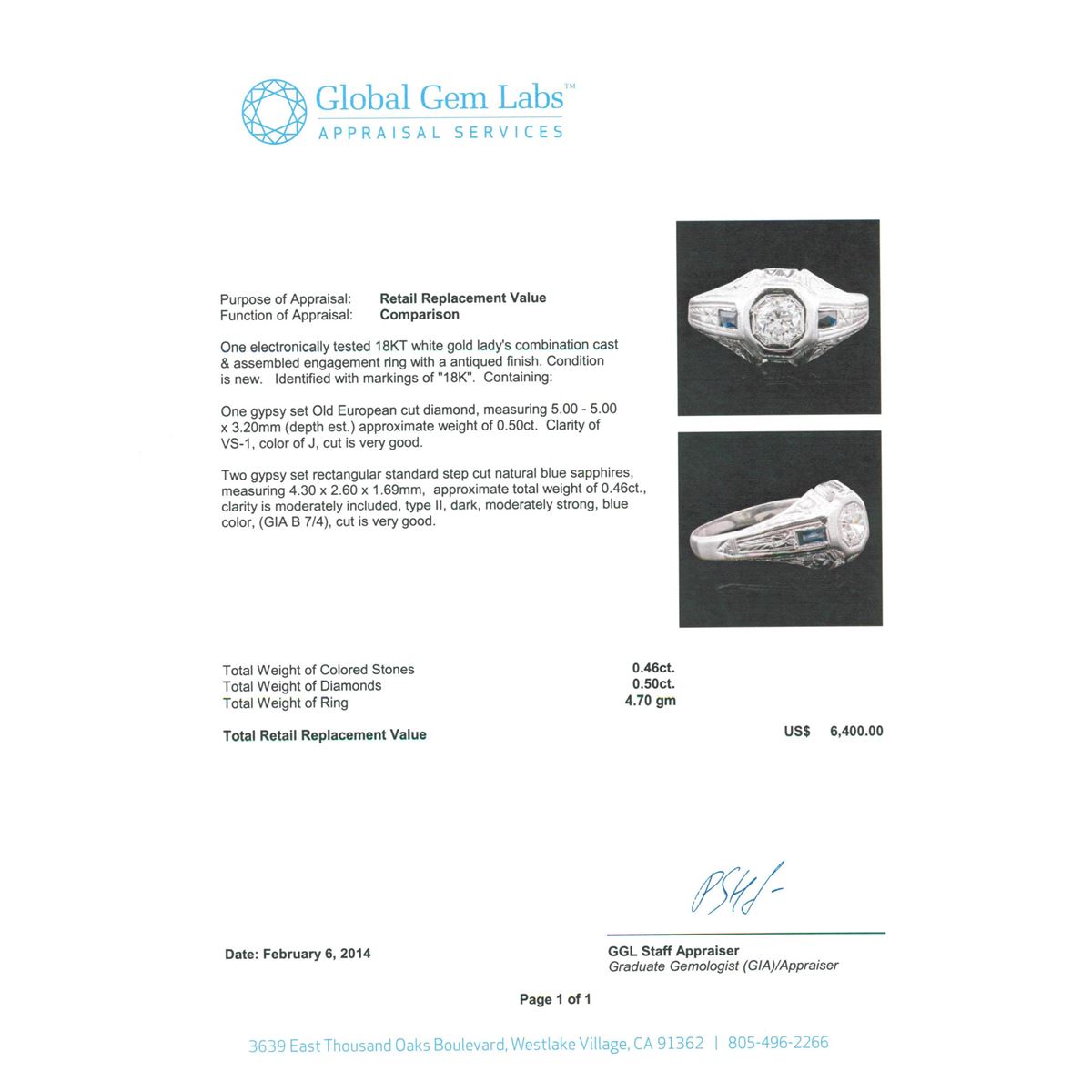 One electronically tested 18KT white gold Ladies combination cast & assembled engagement ring with a antiqued finish. Identified with markings of "18K". Condition is new. Containing: One gypsy set Old European cut diamond, measuring 5.00 - 5.00 x 3.20mm (depth est.) approximate weight of 0.50ct. Clarity of VS-1, Color of J, Cut is Very Good. Two gypsy set rectangular standard step cut natural blue sapphires, measuring 4.30 x 2.60 x 1.69mm, approximate total weight of 0.46ct., clarity is moderately included, type II, dark, moderately strong, blue color, (GIA B 7/4), cut is very good. Total Weight of Colored Stones 0.46ct. Total Weight of Diamonds 0.50ct. Total Weight of Ring 4.70gm. GGL Appraised at $6,400.00.