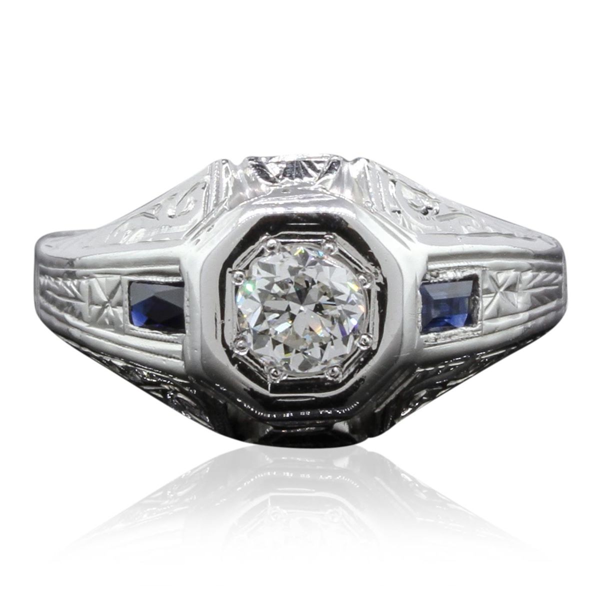 One electronically tested 18KT white gold Ladies combination cast & assembled engagement ring with a antiqued finish. Identified with markings of "18K". Condition is new. Containing: One gypsy set Old European cut diamond, measuring 5.00 - 5.00 x 3.20mm (depth est.) approximate weight of 0.50ct. Clarity of VS-1, Color of J, Cut is Very Good. Two gypsy set rectangular standard step cut natural blue sapphires, measuring 4.30 x 2.60 x 1.69mm, approximate total weight of 0.46ct., clarity is moderately included, type II, dark, moderately strong, blue color, (GIA B 7/4), cut is very good. Total Weight of Colored Stones 0.46ct. Total Weight of Diamonds 0.50ct. Total Weight of Ring 4.70gm. GGL Appraised at $6,400.00.