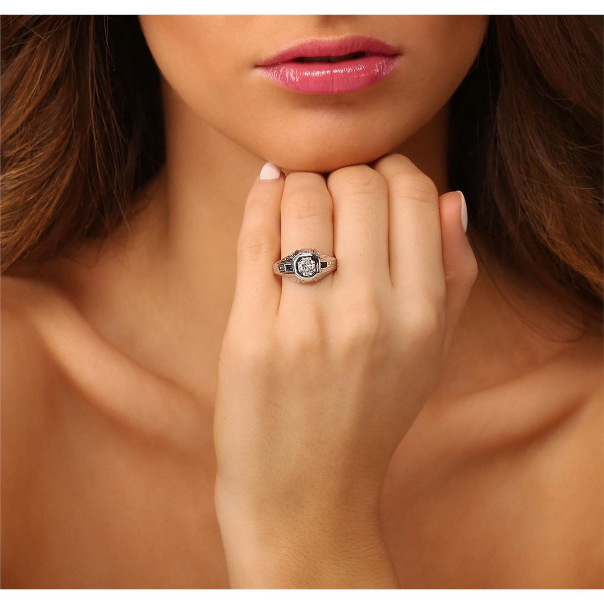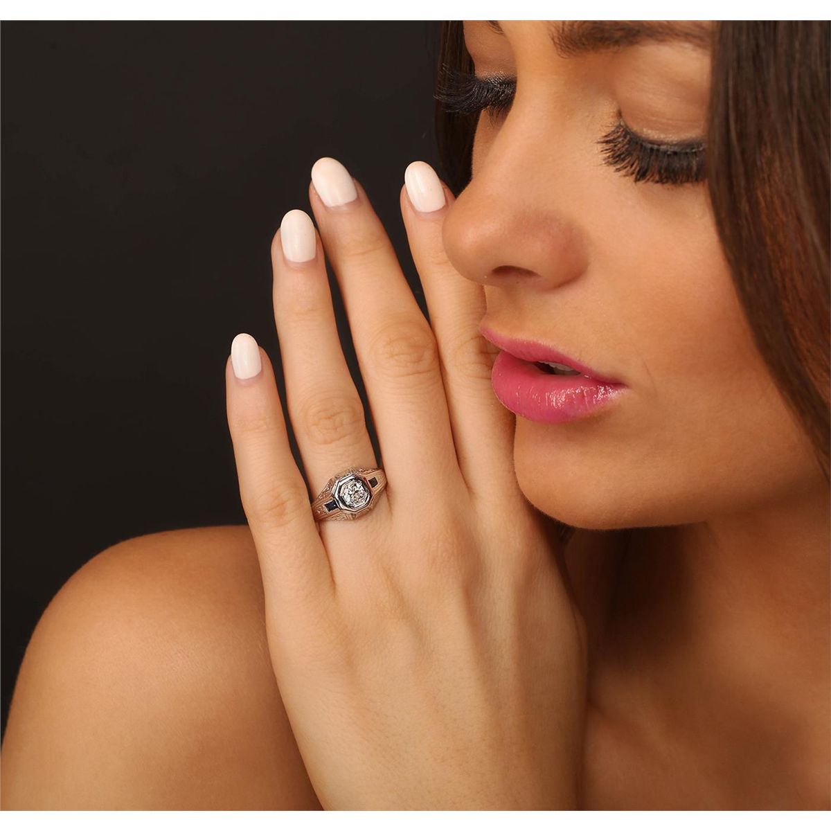 One electronically tested 18KT white gold Ladies combination cast & assembled engagement ring with a antiqued finish. Identified with markings of "18K". Condition is new. Containing: One gypsy set Old European cut diamond, measuring 5.00 - 5.00 x 3.20mm (depth est.) approximate weight of 0.50ct. Clarity of VS-1, Color of J, Cut is Very Good. Two gypsy set rectangular standard step cut natural blue sapphires, measuring 4.30 x 2.60 x 1.69mm, approximate total weight of 0.46ct., clarity is moderately included, type II, dark, moderately strong, blue color, (GIA B 7/4), cut is very good. Total Weight of Colored Stones 0.46ct. Total Weight of Diamonds 0.50ct. Total Weight of Ring 4.70gm. GGL Appraised at $6,400.00.