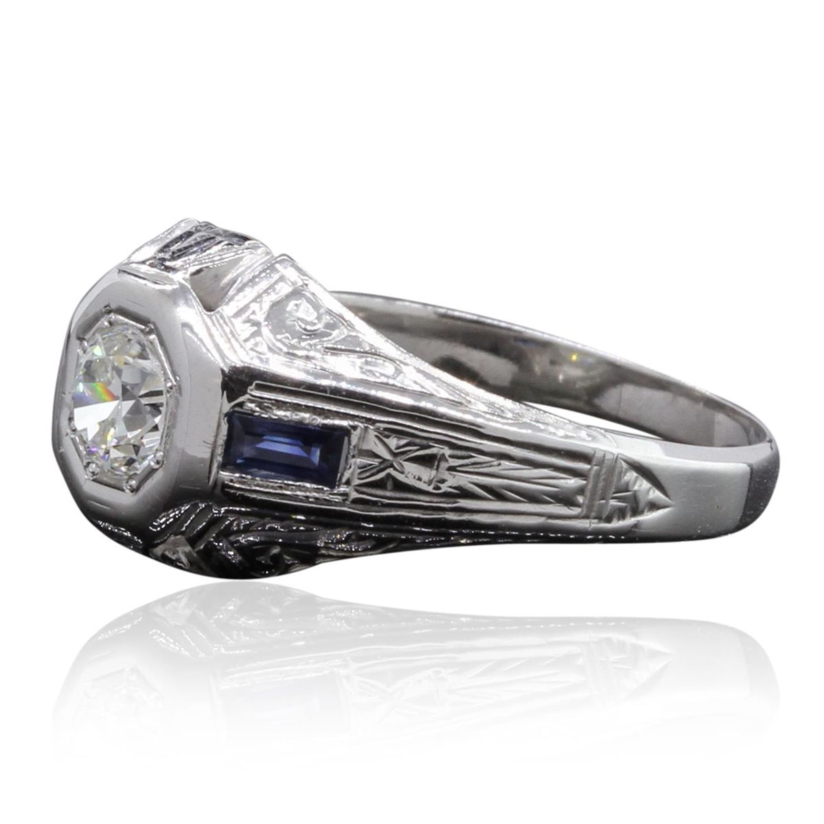 One electronically tested 18KT white gold Ladies combination cast & assembled engagement ring with a antiqued finish. Identified with markings of "18K". Condition is new. Containing: One gypsy set Old European cut diamond, measuring 5.00 - 5.00 x 3.20mm (depth est.) approximate weight of 0.50ct. Clarity of VS-1, Color of J, Cut is Very Good. Two gypsy set rectangular standard step cut natural blue sapphires, measuring 4.30 x 2.60 x 1.69mm, approximate total weight of 0.46ct., clarity is moderately included, type II, dark, moderately strong, blue color, (GIA B 7/4), cut is very good. Total Weight of Colored Stones 0.46ct. Total Weight of Diamonds 0.50ct. Total Weight of Ring 4.70gm. GGL Appraised at $6,400.00.