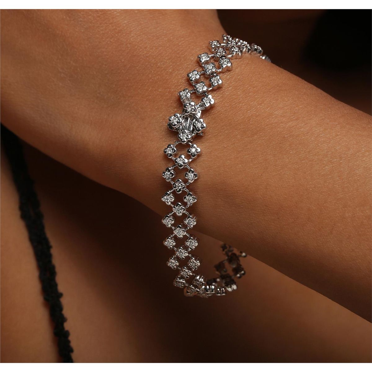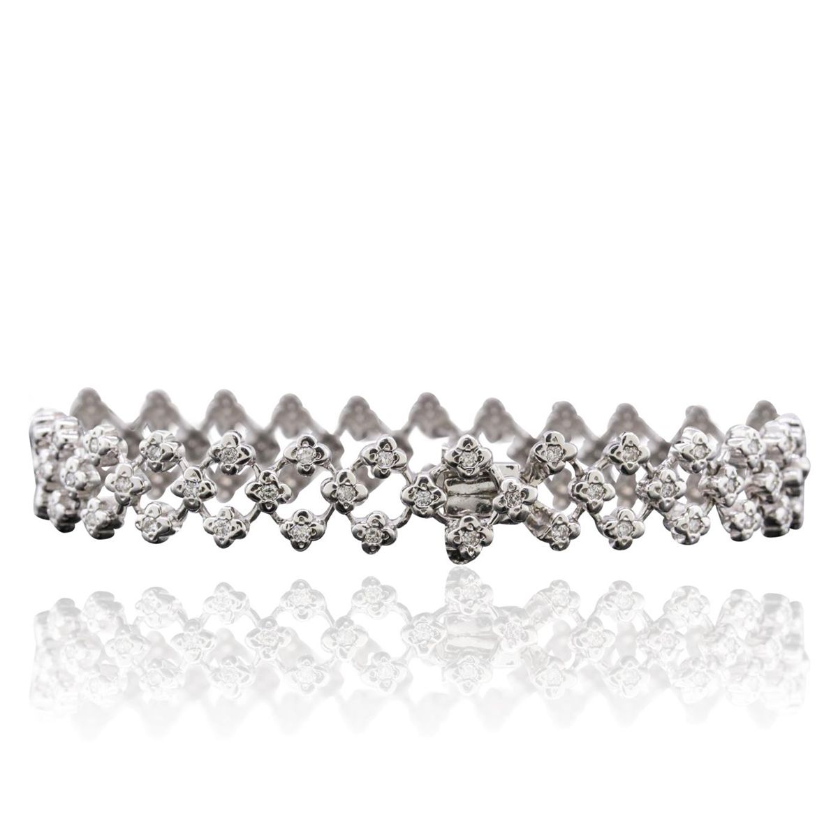 One electronically tested 18KT white gold ladies combination cast & assembled diamond bracelet with a hidden box clasp with safety closer with a bright polish finish. Measurements: 6.50" in length. Identified with markings of "18K". Condition is new. Containing: Eighty-One prong set round brilliant cut diamonds, measuring 1.30 - 1.30 x 0.78mm (depth est.) approximate total weight of 81 Stones = 0.65ct. . Clarity: I-1 to I-2. Color: H - I, Cut is Good. All diamonds are graded in the mounting, unless otherwise stated.. Total Weight of Diamonds 0.65ct.. Total Weight of Bracelet 20.20 grams. GGL Appraised at $6,125.00.