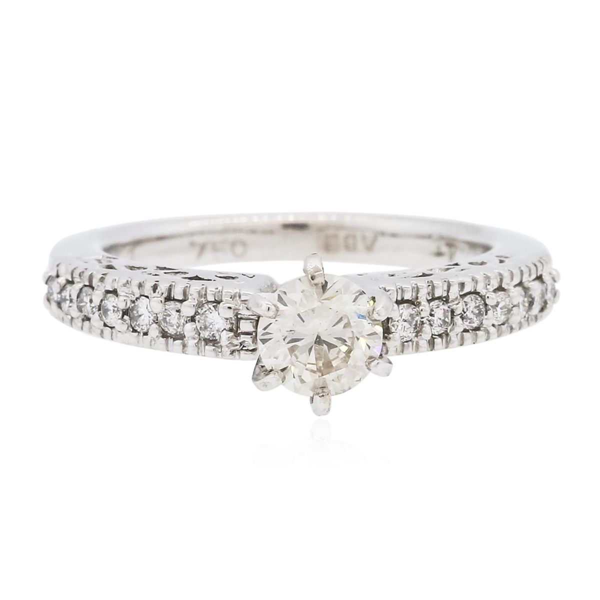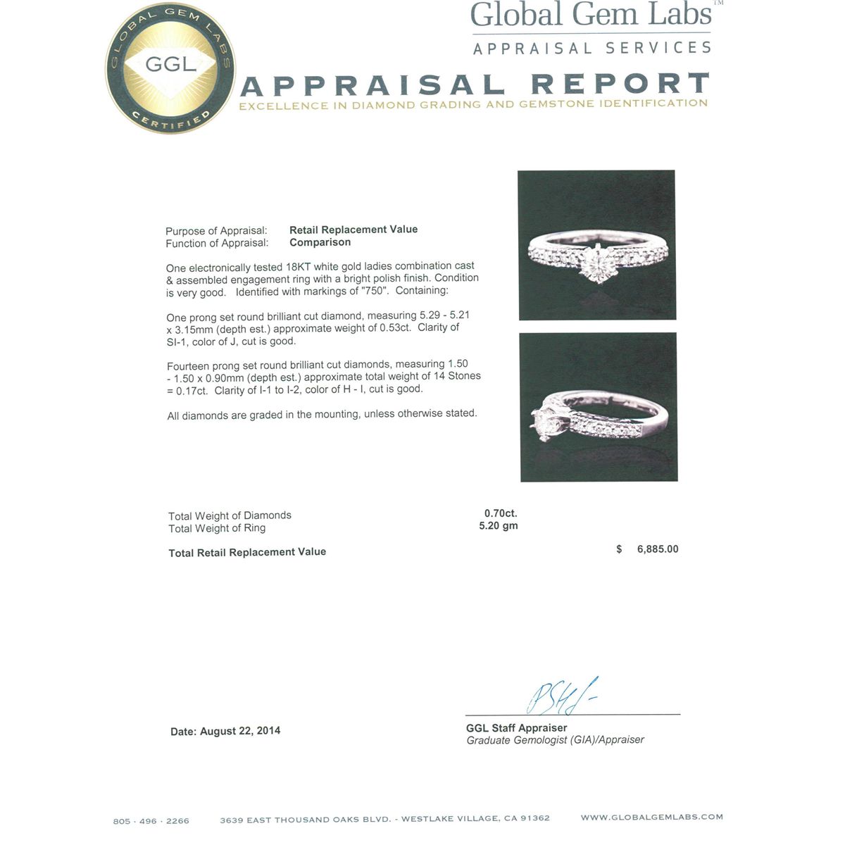 One electronically tested 18KT white gold ladies combination cast & assembled engagement ring with a bright polish finish. Identified with markings of "750". Condition is very good. Containing: One prong set round brilliant cut diamond, measuring 5.29 - 5.21 x 3.15mm (depth est.) approximate weight of 0.53ct. Clarity: SI-1. Color: J, Cut is Good. Fourteen prong set round brilliant cut diamonds, measuring 1.50 - 1.50 x 0.90mm (depth est.) approximate total weight of 14 Stones = 0.17ct. Clarity: I-1 to I-2. Color: H - I, Cut is Good. All diamonds are graded in the mounting, unless otherwise stated. Total Weight of Diamonds 0.70ct. Total Weight of Ring 5.20 grams. GGL Appraised at $6,885.00.