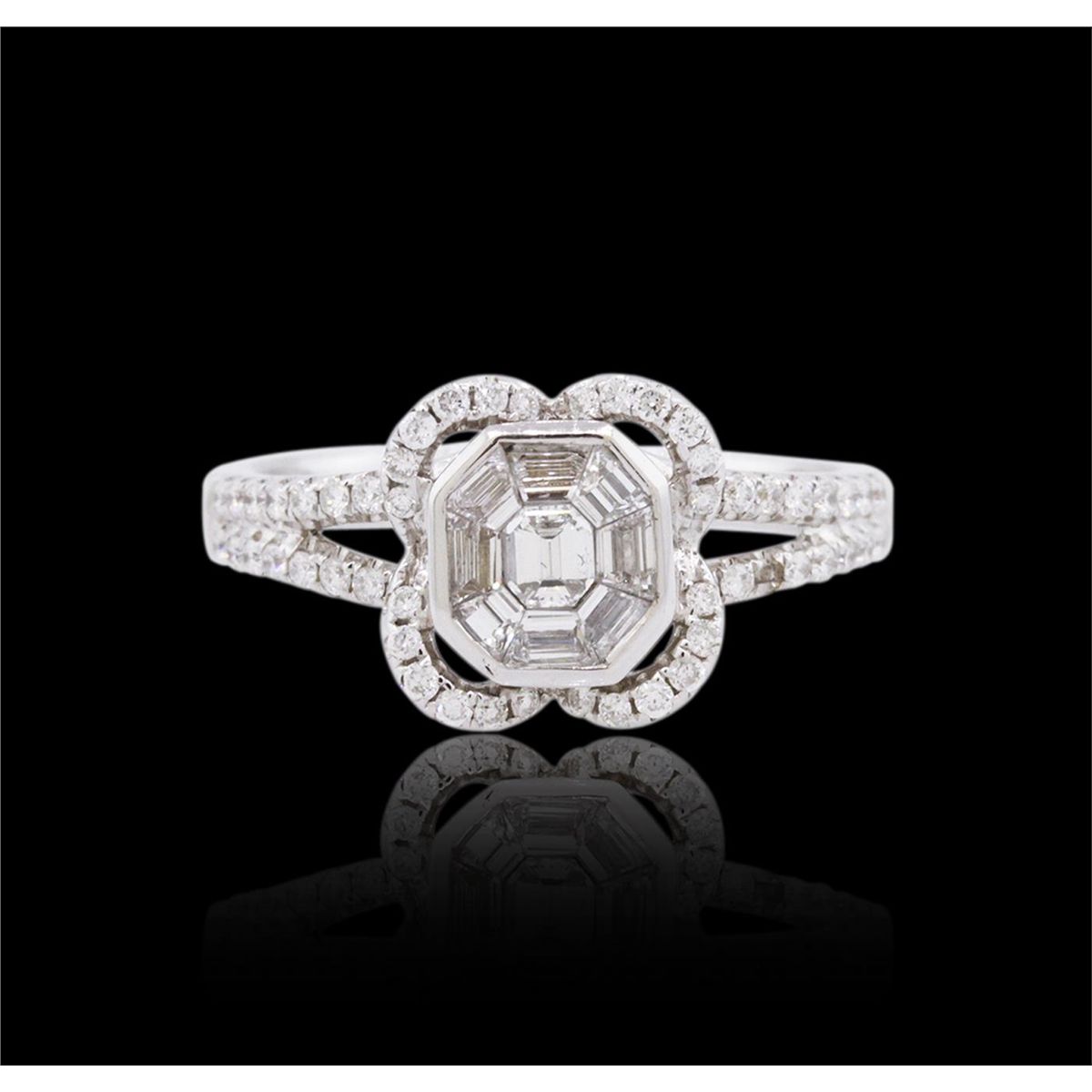 One ring featuring: 18KT white gold weighing 4.30 grams containing 65 round and baguette cut diamonds with a total weight of 0.71cts.