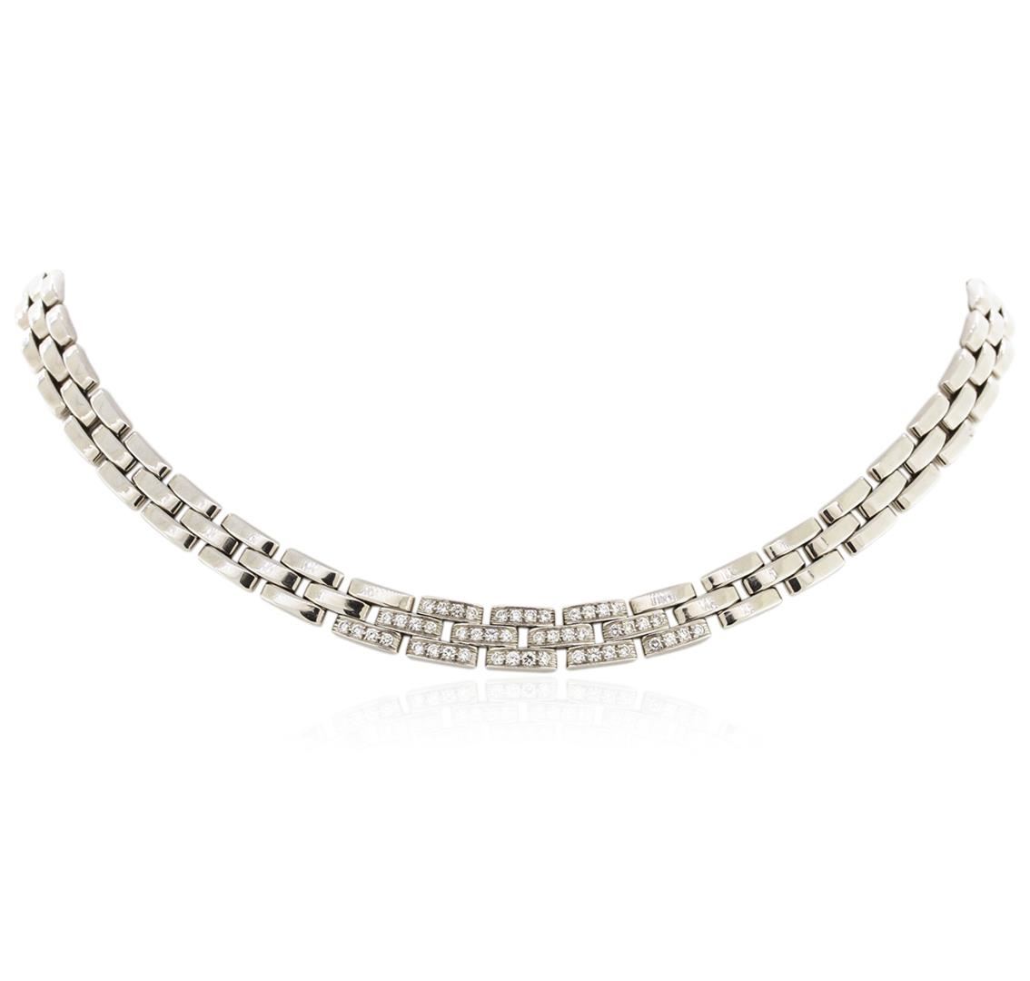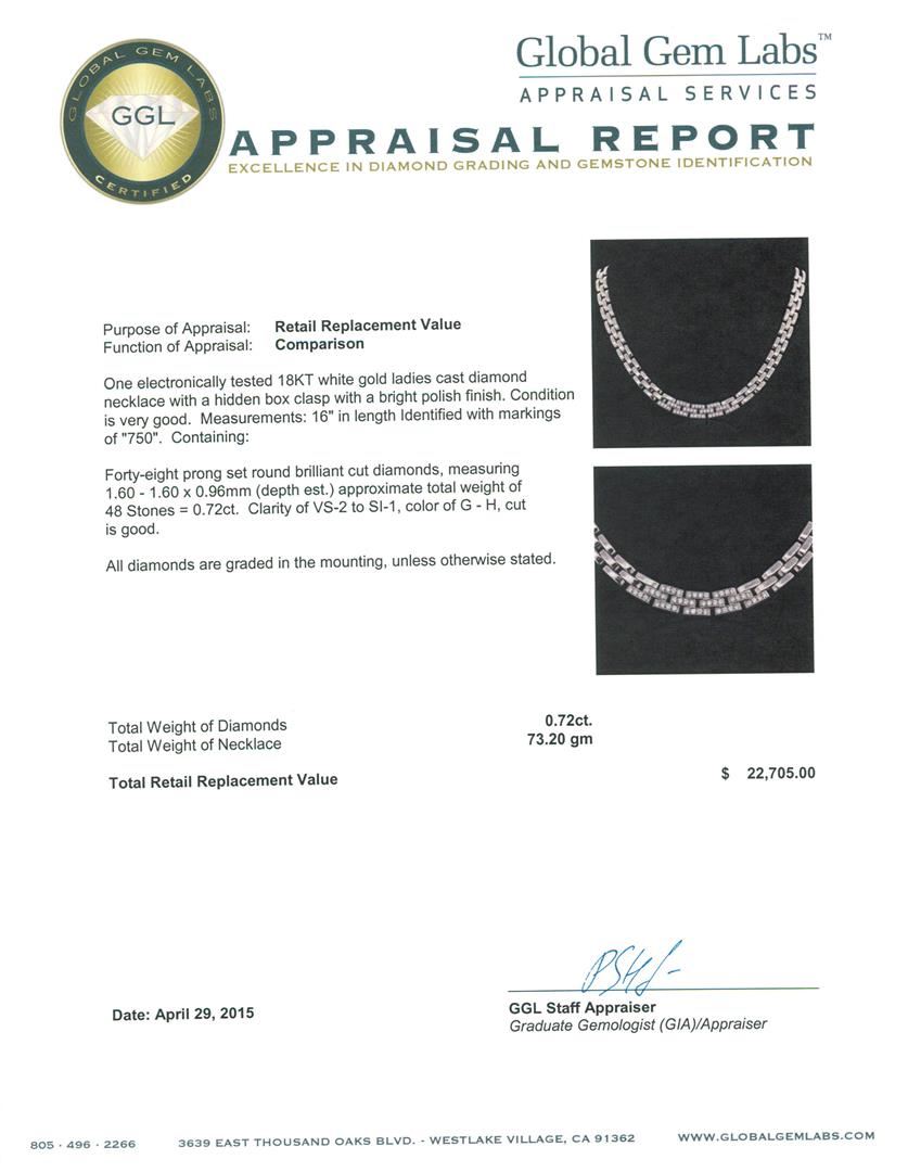 One electronically tested 18KT white gold ladies cast diamond necklace with a hidden box clasp with a bright polish finish. Measurements: 16" in length Identified with markings of "750". Condition is very good. Containing: Forty-Eight prong set round brilliant cut diamonds, measuring 1.60 - 1.60 x 0.96mm (depth est.) approximate total weight of 48 Stones = 0.72ct. Clarity: VS-2 to SI-1. Color: G - H, Cut is Good. All diamonds are graded in the mounting, unless otherwise stated. Total Weight of Diamonds 0.72ct. Total Weight of Necklace 73.20 grams. GGL Appraised at $22,705.00.