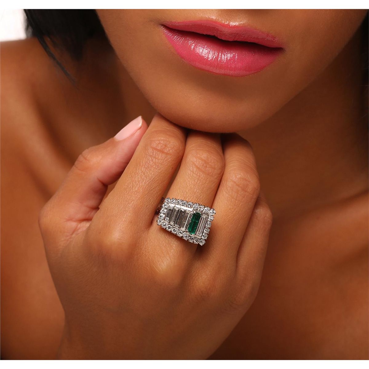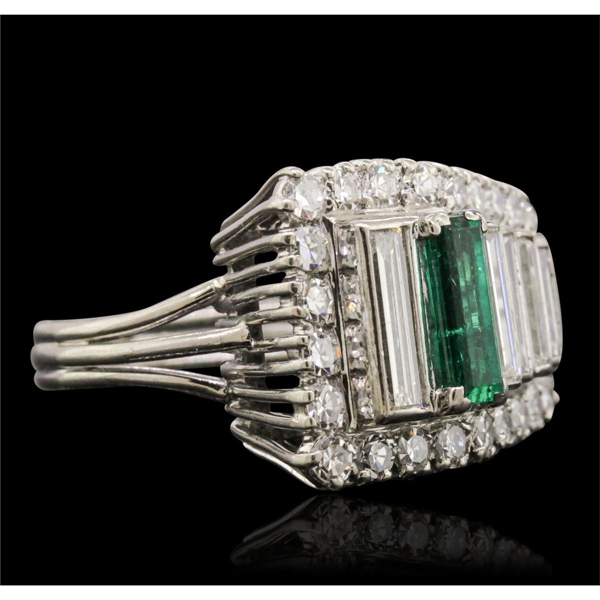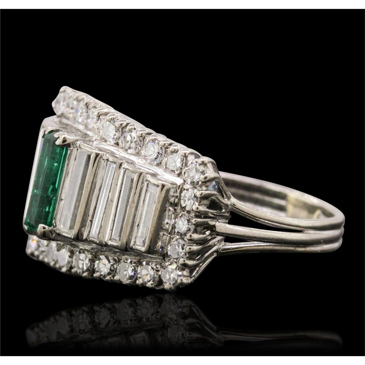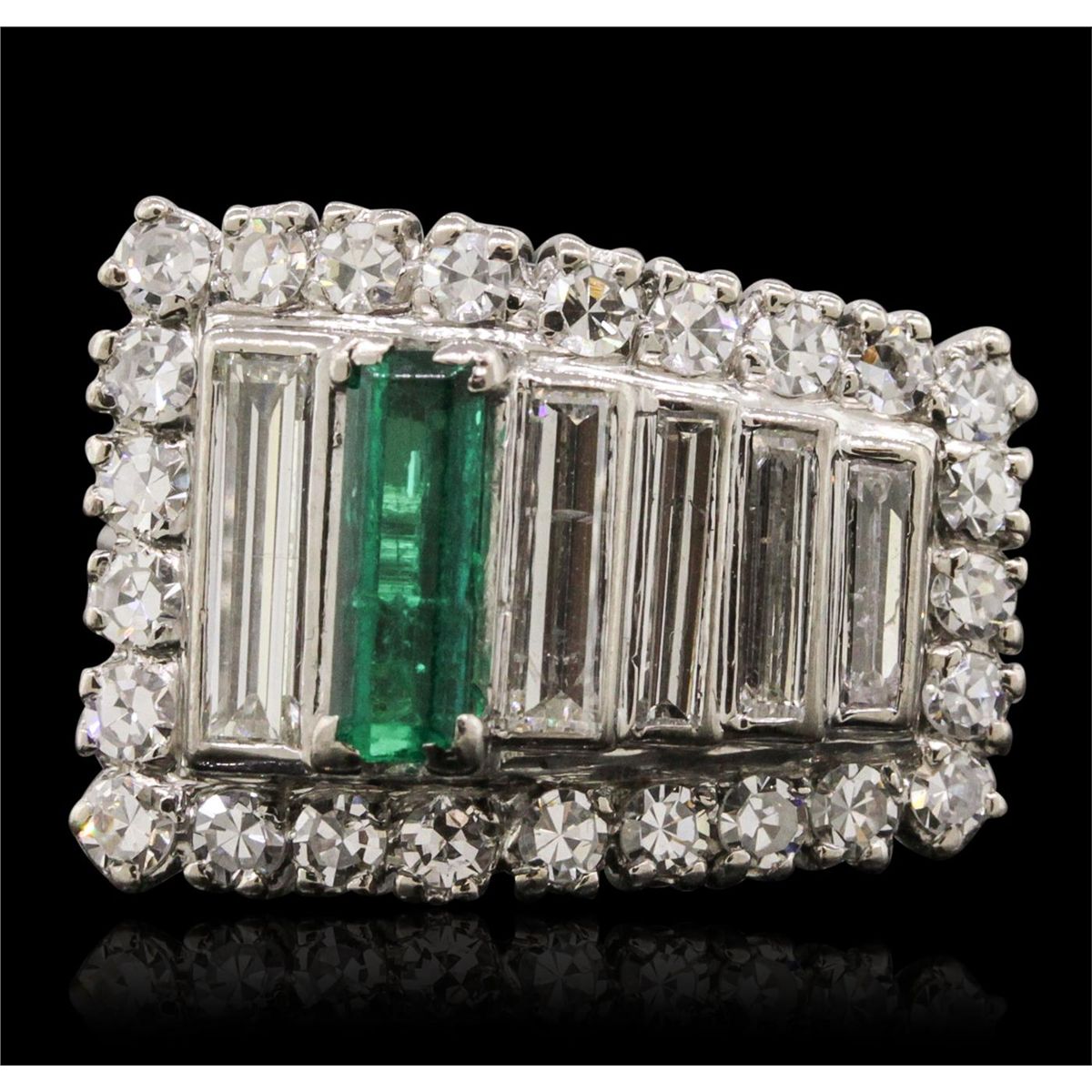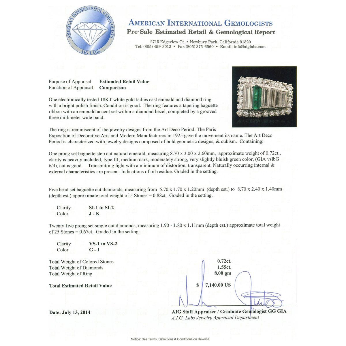One electronically tested 18KT white gold ladies cast emerald and diamond ring with a bright polish finish. The ring features a tapering baguette ribbon with an emerald accent set within a diamond bezel, completed by a grooved three millimeter wide band. The ring is reminiscent of the jewelry designs from the Art Deco Period. The Paris Exposition of Decorative Arts and Modern Manufacturers in 1925 gave the movement its name. The Art Deco Period is characterized with jewelry designs composed of bold geometric designs, & cubism. Condition is good. Containing: One prong set baguette step cut natural emerald, measuring 8.70 x 3.00 x 2.60mm, approximate weight of 0.72ct., clarity is heavily included, type III, medium dark, moderately strong, very slightly bluish green color, (GIA vslbG 6/4), cut is good. Transmitting light with a minimum of distortion, transparent. Naturally occurring internal & external characteristics are present. Indications of oil residue. Graded in the setting. Five bead set baguette cut diamonds, measuring from 5.70 x 1.70 x 1.20mm (depth est.) to 8.70 x 2.40 x 1.40mm (depth est.) approximate total weight of 5 Stones = 0.88ct. Graded in the setting. Clarity: SI-1 to SI-2. Color: J - K Twenty-Five prong set single cut diamonds, measuring 1.90 - 1.80 x 1.11mm (depth est.) approximate total weight of 25 Stones = 0.67ct. Graded in the setting. Clarity: VS-1 to VS-2. Color: G - I. Total Weight of Colored Stones 0.72ct. Total Weight of Diamonds 1.55ct. Total Weight of Ring 8.00 grams. AIG Appraised at $7,140.00.