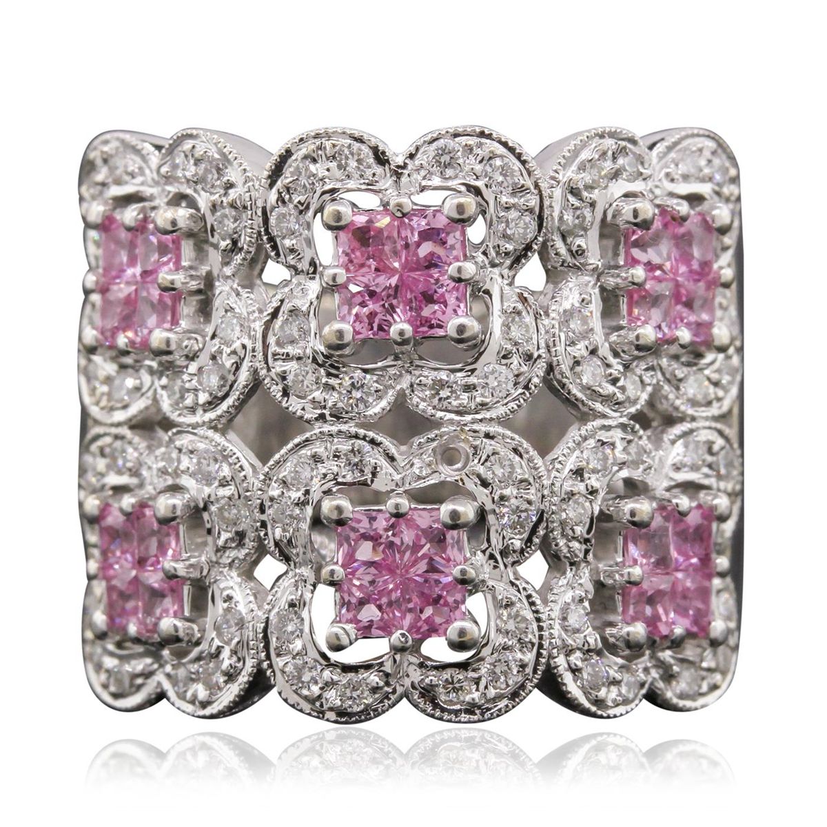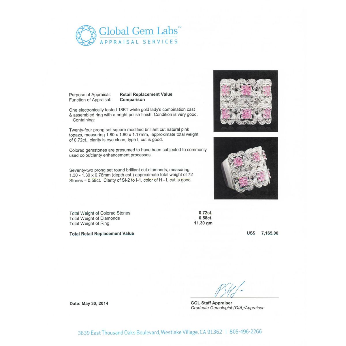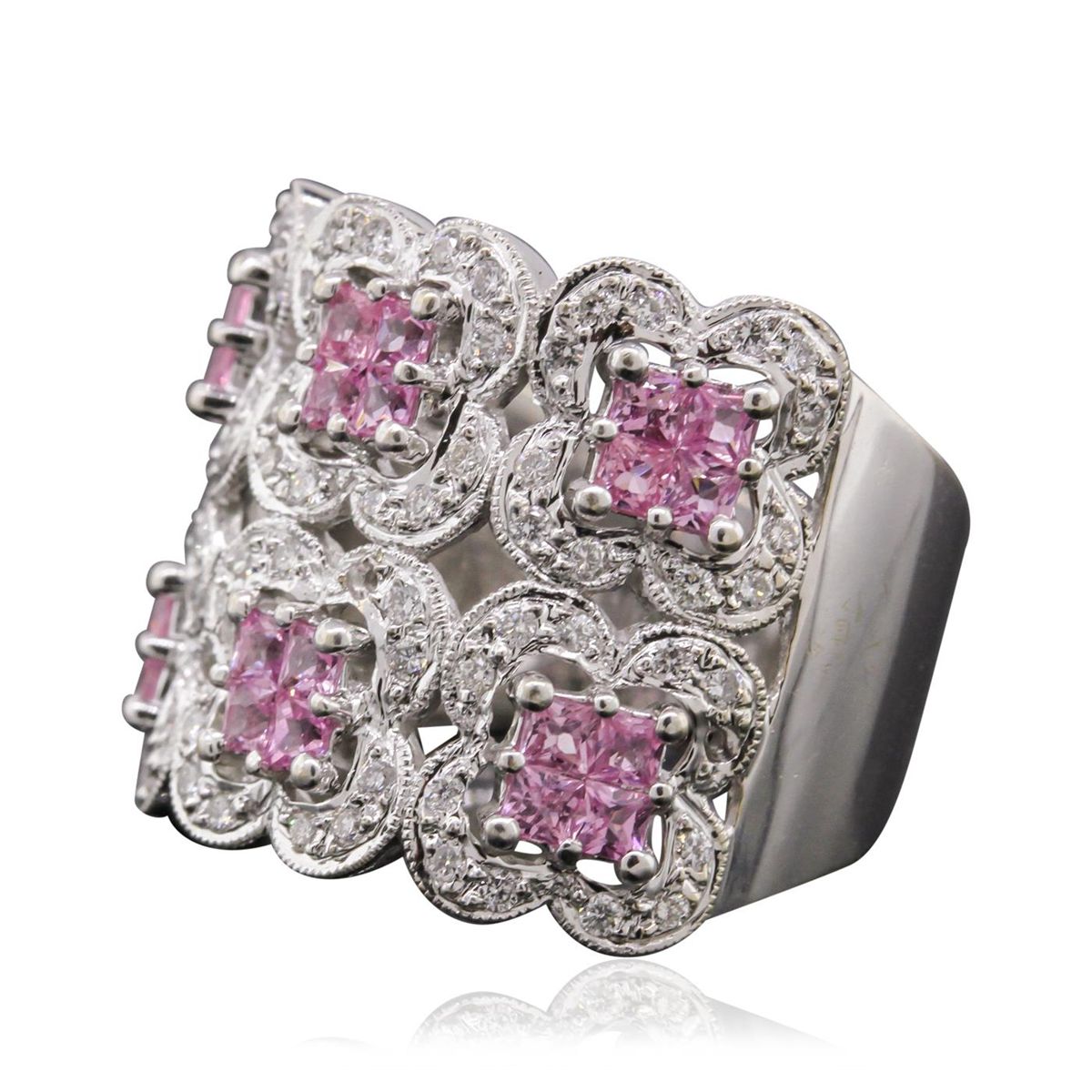One electronically tested 18KT white gold Ladies combination cast & assembled ring with a bright polish finish. Condition is very good. Containing: Twenty-four prong set square modified brilliant cut natural pink topazes, measuring 1.80 x 1.80 x 1.17mm, approximate. Total Weight of 0.72ct., clarity is eye clean, type I, cut is good. Colored gemstones are presumed to have been subjected to commonly used color/clarity enhancement processes. Seventy-Two prong set round brilliant cut diamonds, measuring 1.30 - 1.30 x 0.78mm (depth est.) approximate. Total Weight of 72 Stones = 0.58ct. Clarity: SI-2 to I-1. Color: H - I, Cut is Good. Total Weight of Colored Stones 0.72ct. Total Weight of Diamonds 0.58ct. Total Weight of Ring 11.30 grams. GGL Appraised at $7,165.00.