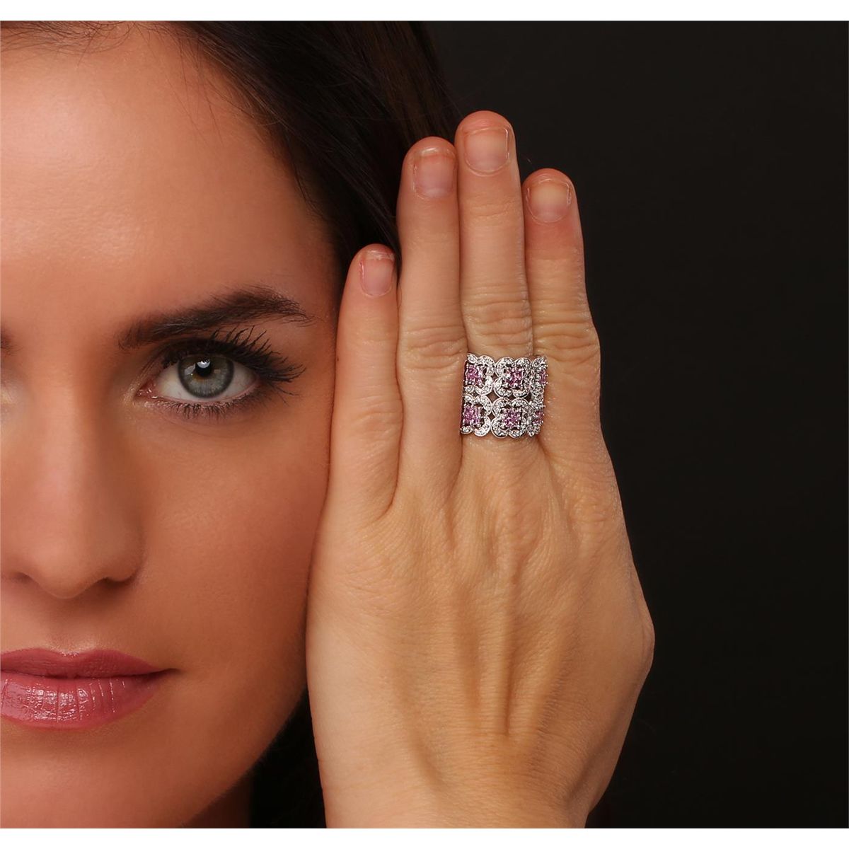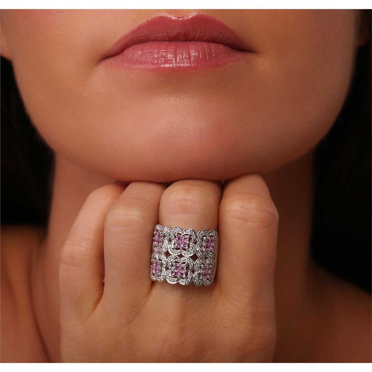 One electronically tested 18KT white gold Ladies combination cast & assembled ring with a bright polish finish. Condition is very good. Containing: Twenty-four prong set square modified brilliant cut natural pink topazes, measuring 1.80 x 1.80 x 1.17mm, approximate. Total Weight of 0.72ct., clarity is eye clean, type I, cut is good. Colored gemstones are presumed to have been subjected to commonly used color/clarity enhancement processes. Seventy-Two prong set round brilliant cut diamonds, measuring 1.30 - 1.30 x 0.78mm (depth est.) approximate. Total Weight of 72 Stones = 0.58ct. Clarity: SI-2 to I-1. Color: H - I, Cut is Good. Total Weight of Colored Stones 0.72ct. Total Weight of Diamonds 0.58ct. Total Weight of Ring 11.30 grams. GGL Appraised at $7,165.00.