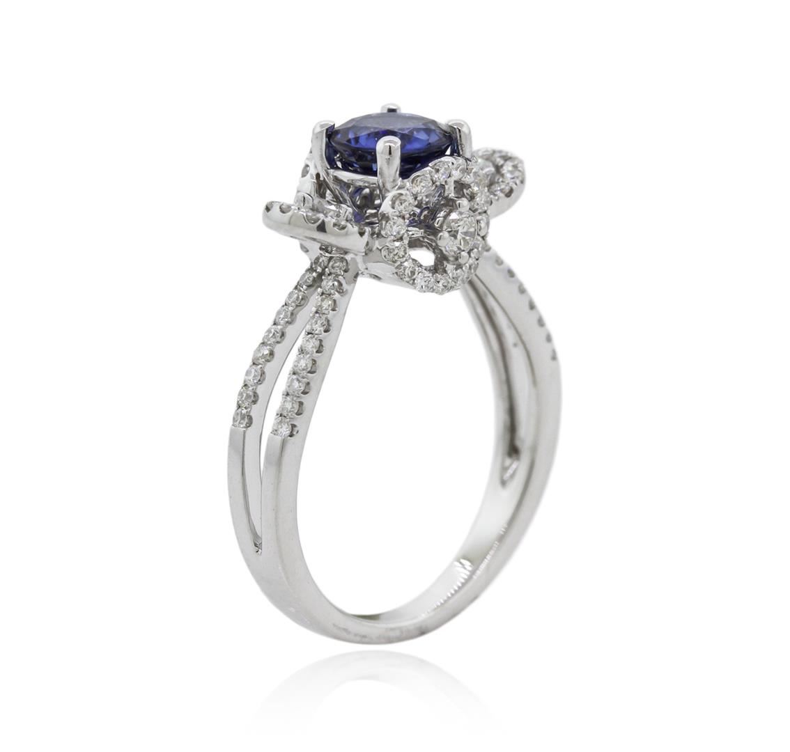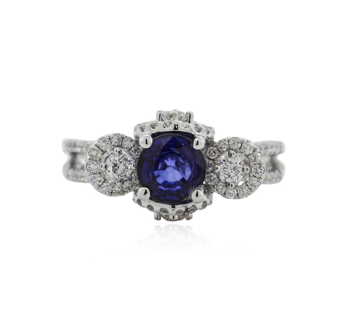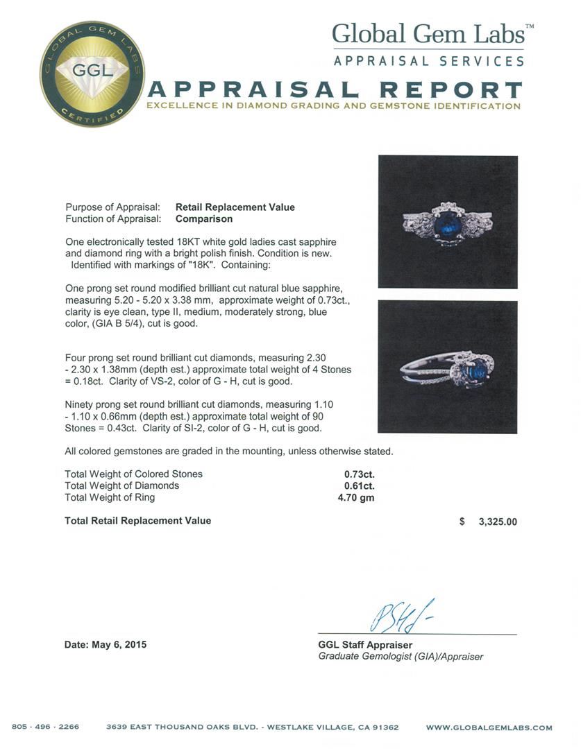 One electronically tested 18KT white gold ladies cast sapphire and diamond ring with a bright polish finish. Identified with markings of "18K". Condition is new. Containing: One prong set round modified brilliant cut natural blue sapphire, measuring 5.20 - 5.20 x 3.38 mm, approximate weight of 0.73ct., clarity is eye clean, type II, medium, moderately strong, blue color, (GIA B 5/4), cut is good. Four prong set round brilliant cut diamonds, measuring 2.30 - 2.30 x 1.38mm (depth est.) approximate total weight of 4 Stones = 0.18ct. Clarity: VS-2. Color: G - H, Cut is Good. Ninety prong set round brilliant cut diamonds, measuring 1.10 - 1.10 x 0.66mm (depth est.) approximate total weight of 90 Stones = 0.43ct. Clarity: SI-2. Color: G - H, Cut is Good. All colored gemstones are graded in the mounting, unless otherwise stated. Total Weight of Colored Stones 0.73ct. Total Weight of Diamonds 0.61ct. Total Weight of Ring 4.70 grams. GGL Appraised at $3,325.00.