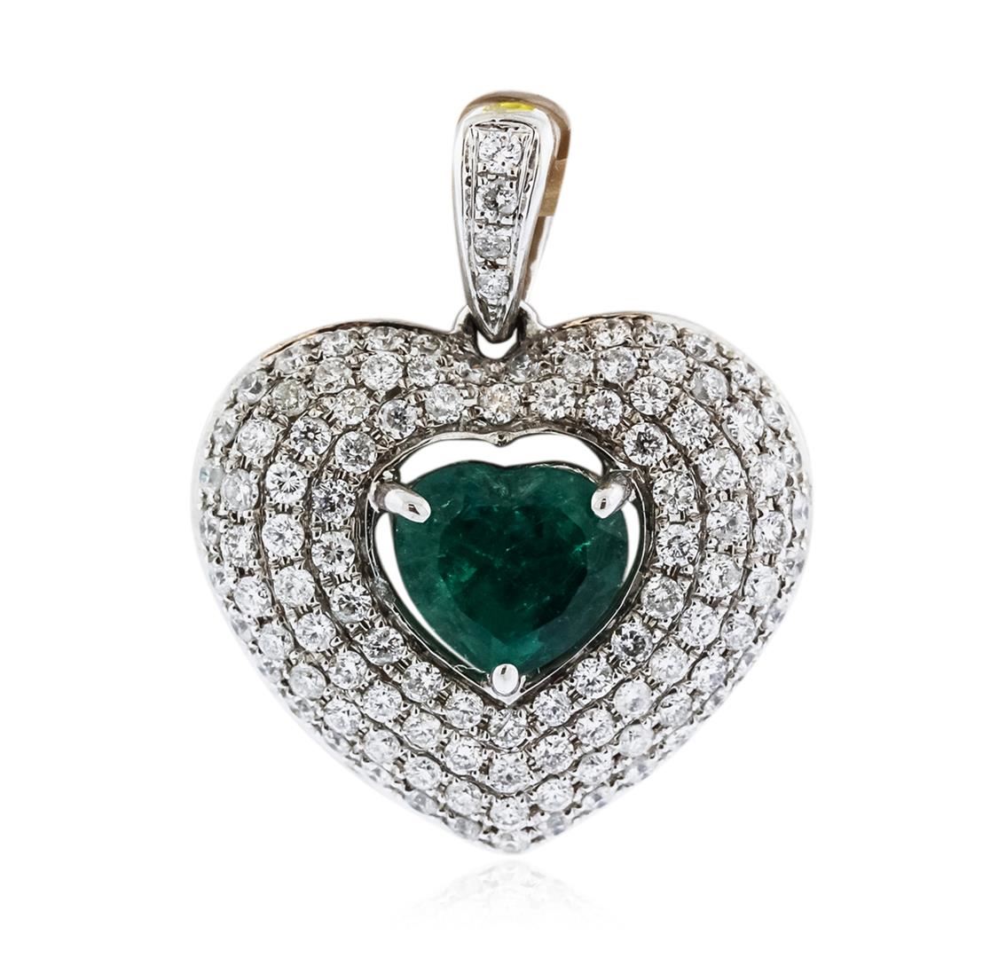 One pendant featuring: 18KT white gold weighing 3.25 grams containing one heart shaped emerald weighing 0.82 carats and diamonds weighing a total of 0.70 carats.